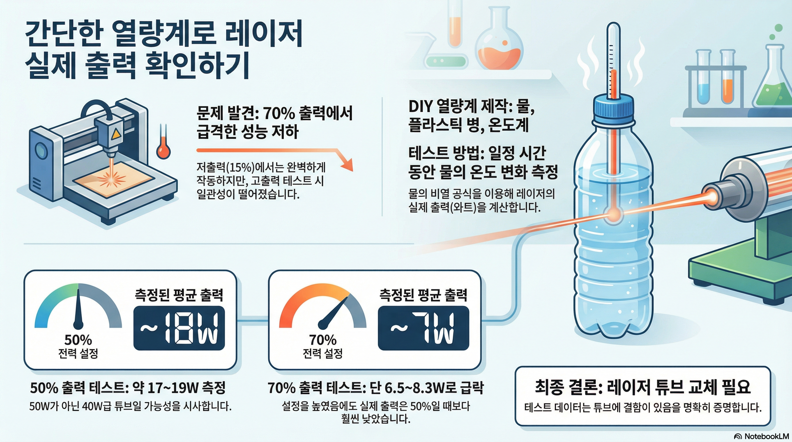 이는 단순히 출력이 낮아진 것이 아니었습니다. 레이저 튜브가 높은 출력을 지속적으로 유지하지 못하는 ‘성능 붕괴’ 현상이었습니다. 아마도 테스트 시작 직후에는 높은 출력을 냈을지 몰라도, "아주 빠르게 출력이 떨어져 버린" 것입니다. 이처럼 높은 부하를 견디지 못하고 성능이 급격히 저하되는 것은 수명이 다해가는 레이저 튜브에서 나타나는 전형적인 증상입니다.