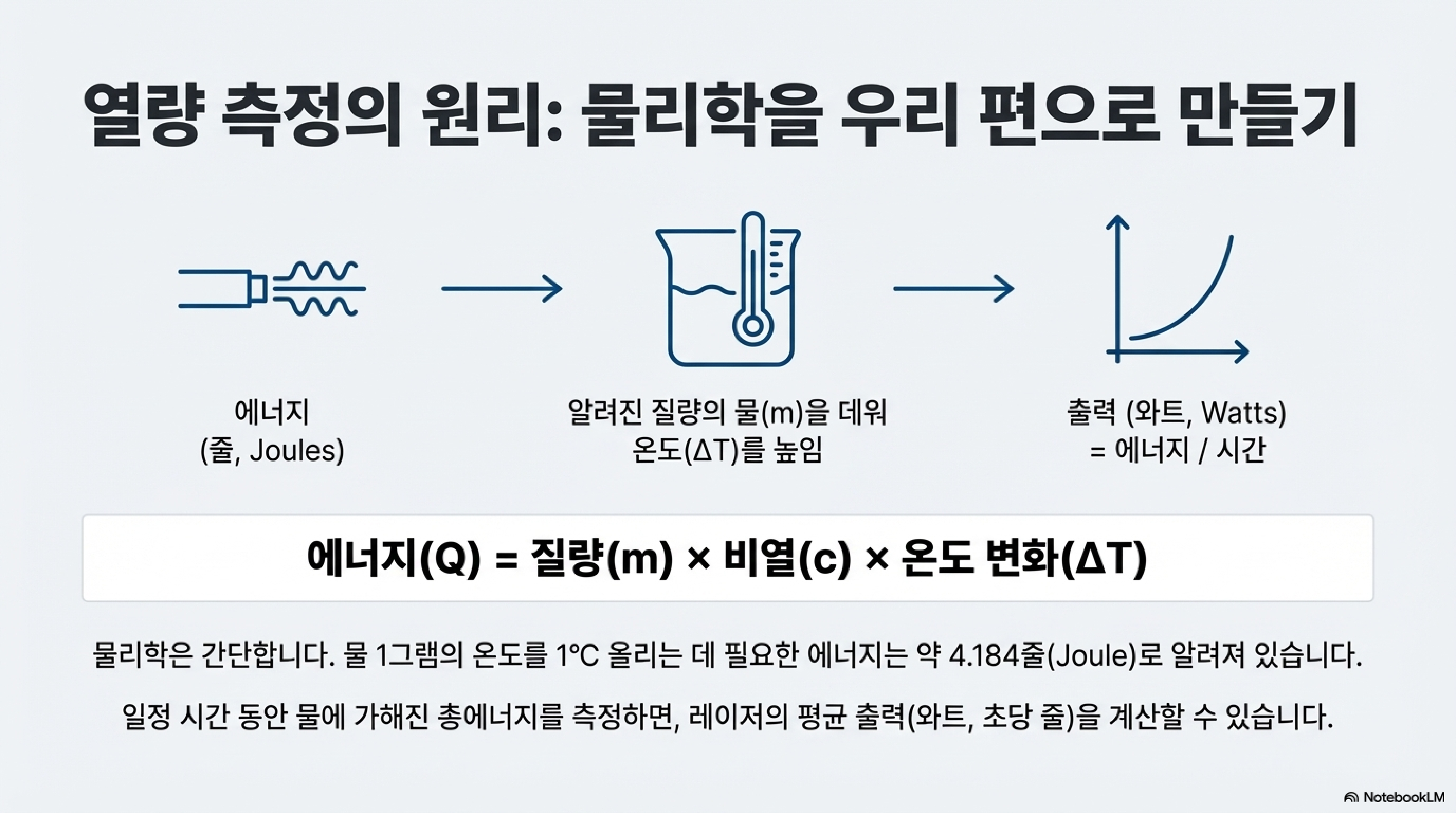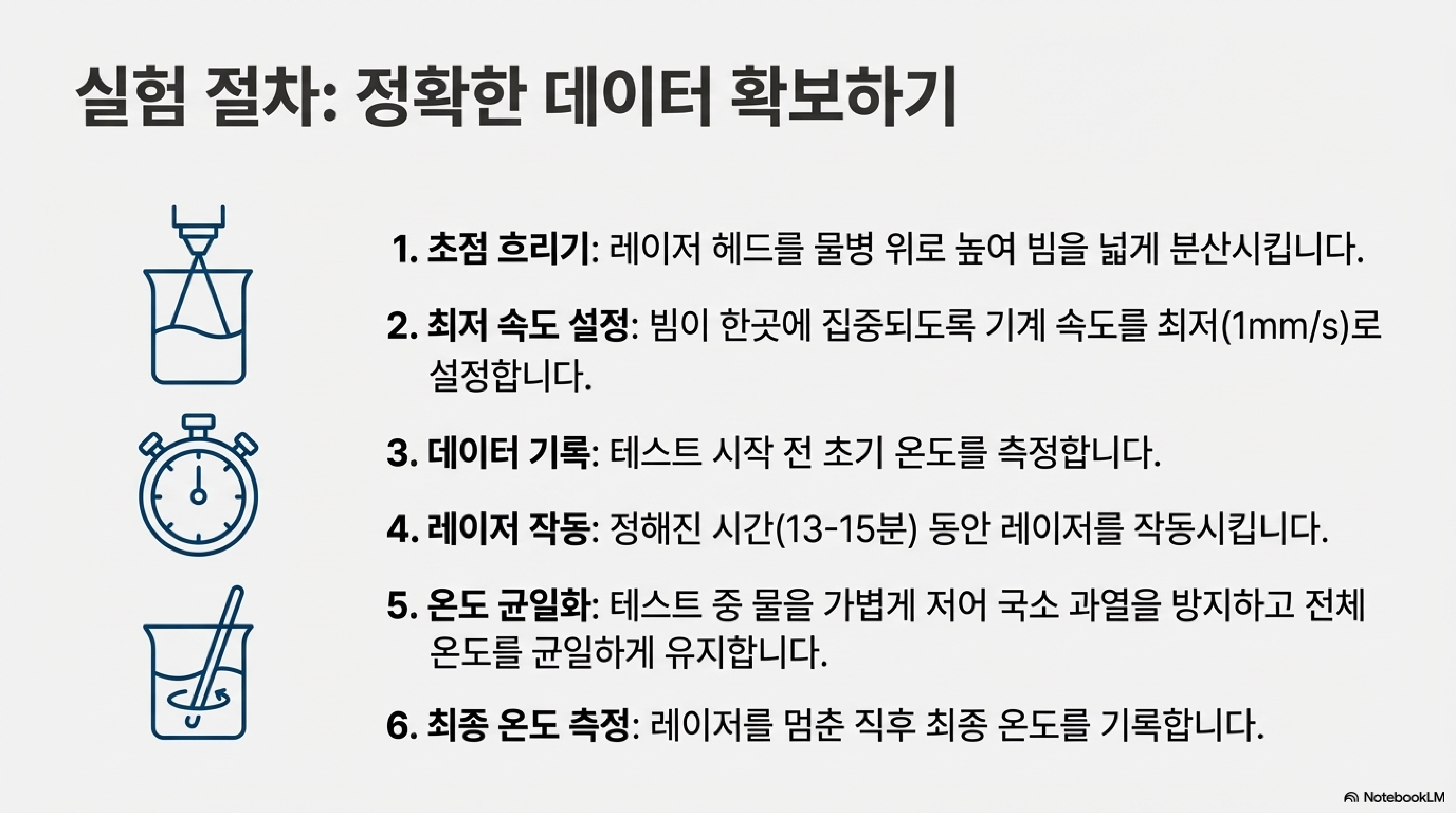 정해진 시간 동안 레이저를 물에 발사한 뒤 온도가 얼마나 상승했는지 측정합니다. 물의 비열(물의 온도를 1도 올리는 데 필요한 에너지)을 알고 있으므로, 온도 변화를 통해 레이저가 물에 전달한 총에너지를 계산할 수 있고, 이를 통해 최종적으로 시간당 에너지, 즉 와트(W) 단위의 출력을 알아내는 것입니다. 실험 중에는 물 표면만 끓는 것을 방지하고 정확한 평균 온도를 측정하기 위해 "계속해서 약간의 움직임을 주며" 물을 섞어주는 디테일도 잊지 않았습니다.