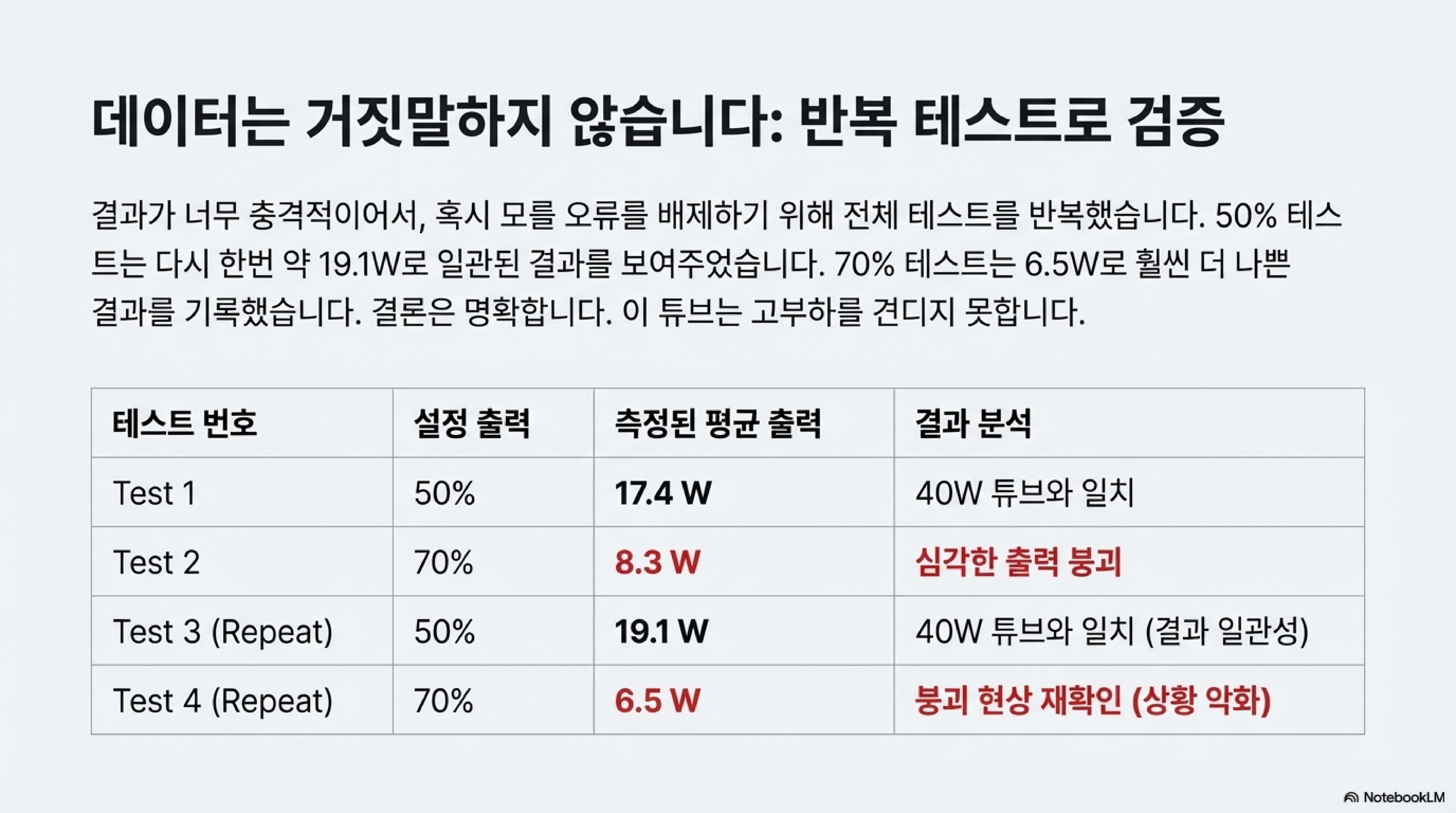 계산은 간단합니다. 50% 설정에서 1719와트의 출력이 나왔다면, 기계의 100% 최대 출력은 약 3438와트에 불과하다는 추정이 가능합니다. 이는 50와트가 아닌 40와트 튜브의 사양과 일치합니다. 이 사실은 기계가 사양보다 낮은 성능을 가졌다는 첫 번째 증거였습니다. 그리고 이어진 70% 테스트의 성능 붕괴는, 그저 사양이 낮은 것뿐만 아니라 튜브 자체가 고장 나고 있다는 결정적인 증거가 된 것입니다.