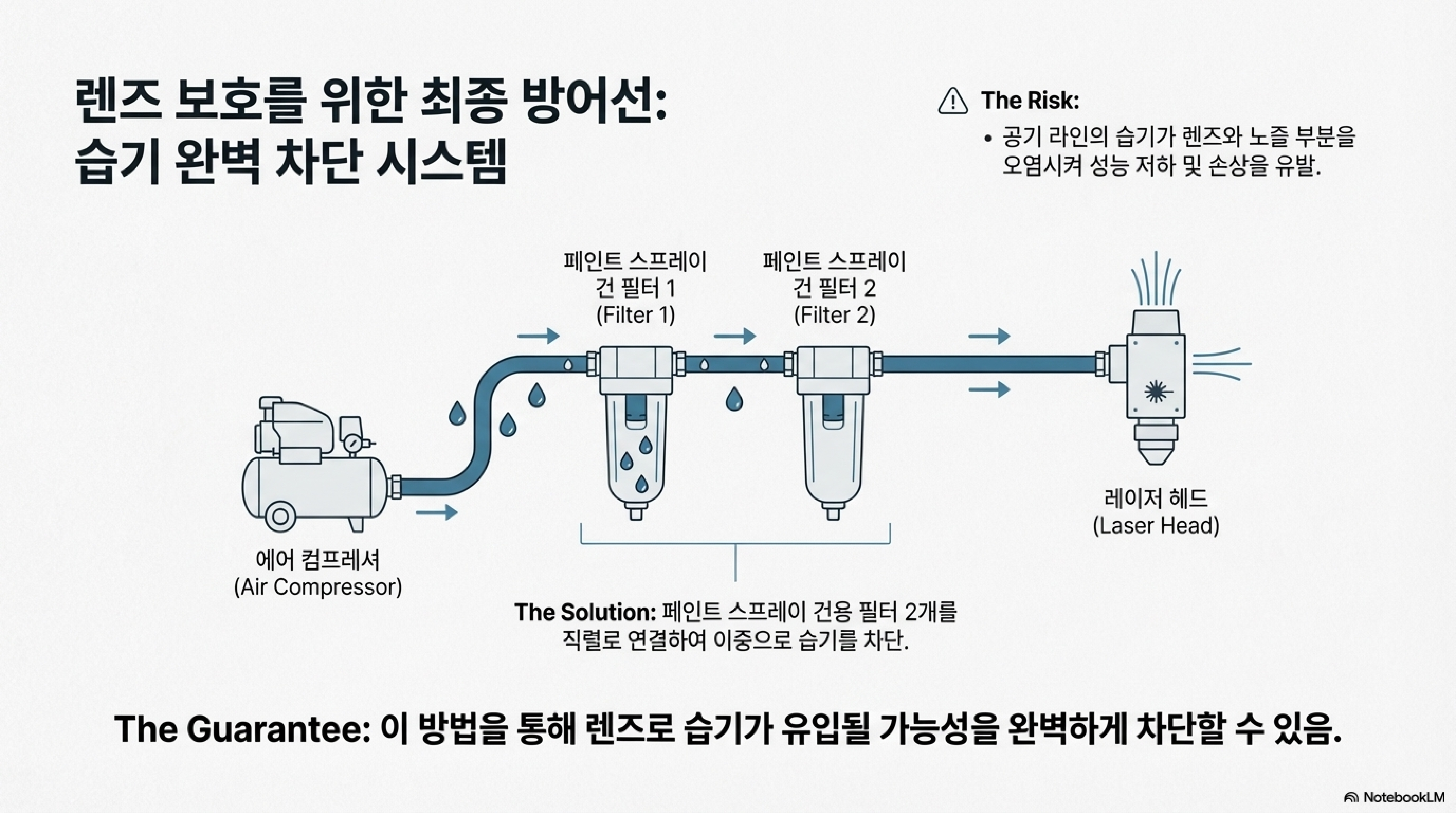 실제 사용 결과, 기본 펌프의 공기압만으로도 대부분의 "작업을 수행하기에 완벽하게 충분했다"는 사실을 깨달았습니다. 다만, 종이처럼 섬세한 재료를 자를 때 공기압을 미세하게 조절할 필요는 있었습니다. 이를 위해 압력 조절기를 추가했지만, 여기서 중요한 팁이 있습니다. 필터가 내장된 비싼 조절기 대신, 저렴한 페인트 스프레이용 필터 두 개를 겹쳐 사용하는 것이 훨씬 효과적입니다. 이렇게 하면 렌즈를 오염시킬 수 있는 수분이 라인으로 유입되는 것을 완벽하게 막을 수 있습니다.