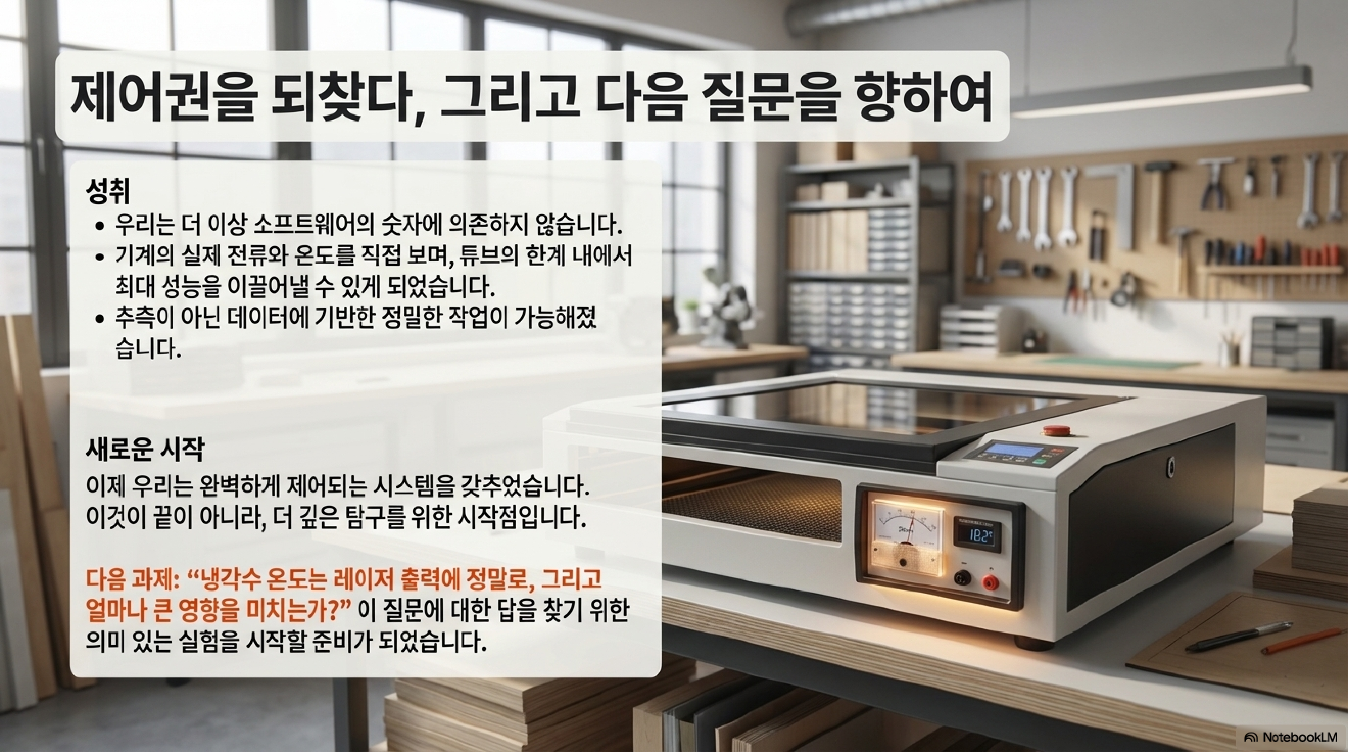 간단한 계측기를 추가하는 것만으로도 기계에 대한 이해도가 완전히 달라졌습니다. 이전에는 보이지 않던 것들이 보이기 시작했고, 막연했던 제어의 영역이 정밀한 과학의 영역으로 들어왔습니다. 이제 저는 제 기계를 훨씬 더 깊이 신뢰하고 제어할 수 있게 되었습니다.