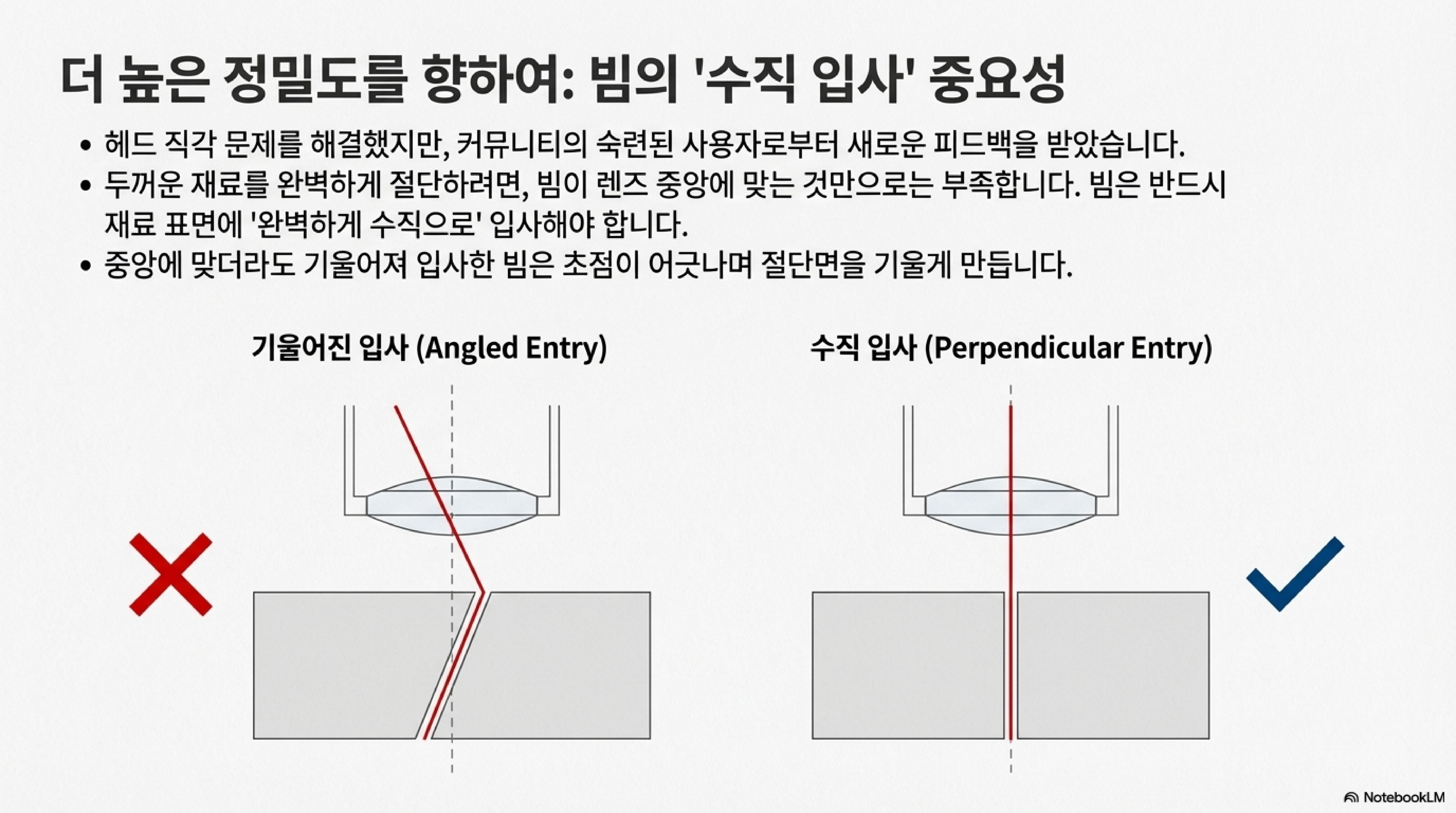 기울어진 절단면 문제로 돌아가 봅시다. 제 첫 가설은 복잡한 광학 문제였습니다. 빔이 렌즈의 중심을 벗어나면서 초점이 한쪽으로 치우쳐, 마치 빔이 휘는 것처럼 절단면이 기울어졌을 것이라고 생각했습니다. 하지만 제 실험 결과, 빔이 렌즈 중심에서 조금 벗어나는 것만으로는 그 정도의 기울기를 만들 수 없다는 결론에 이르렀습니다.