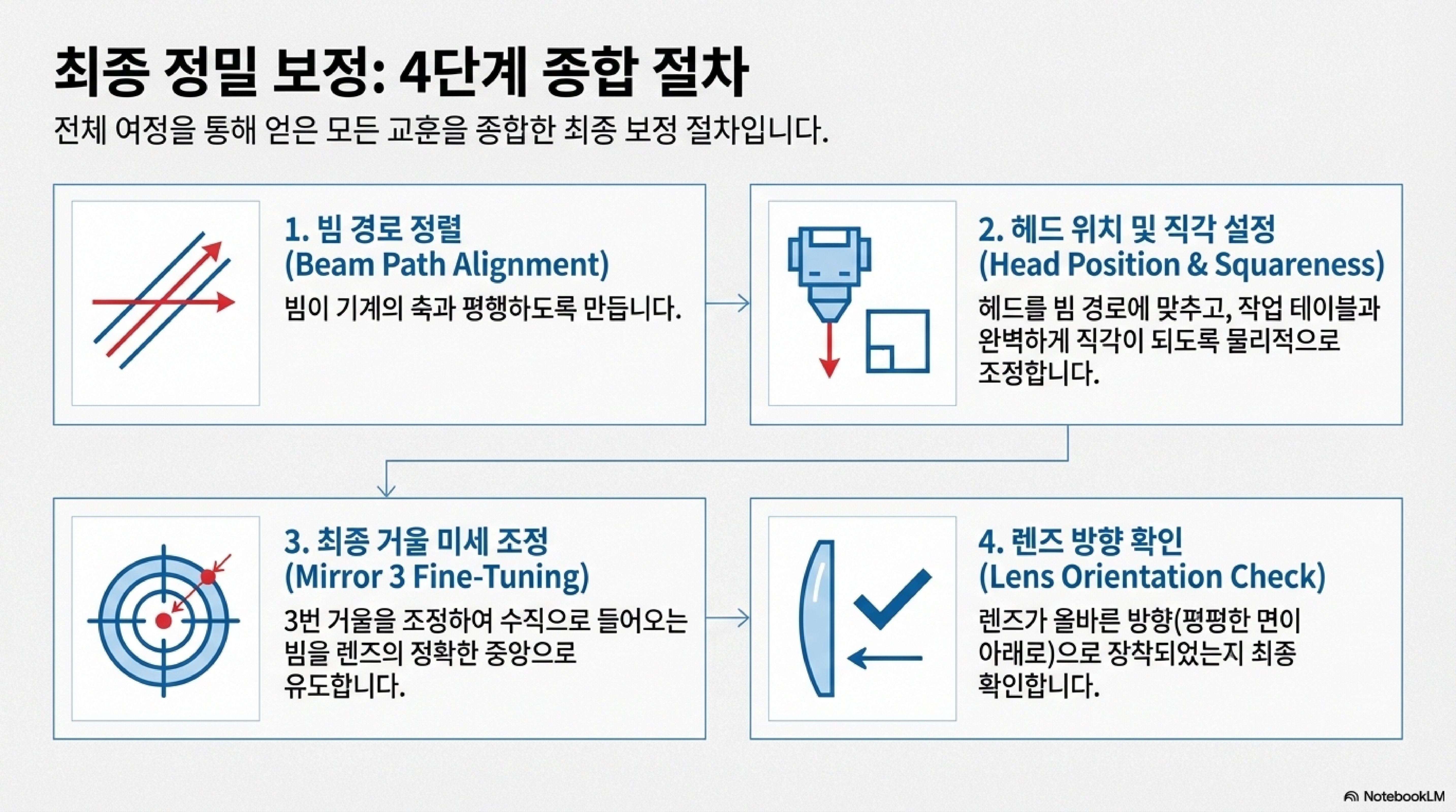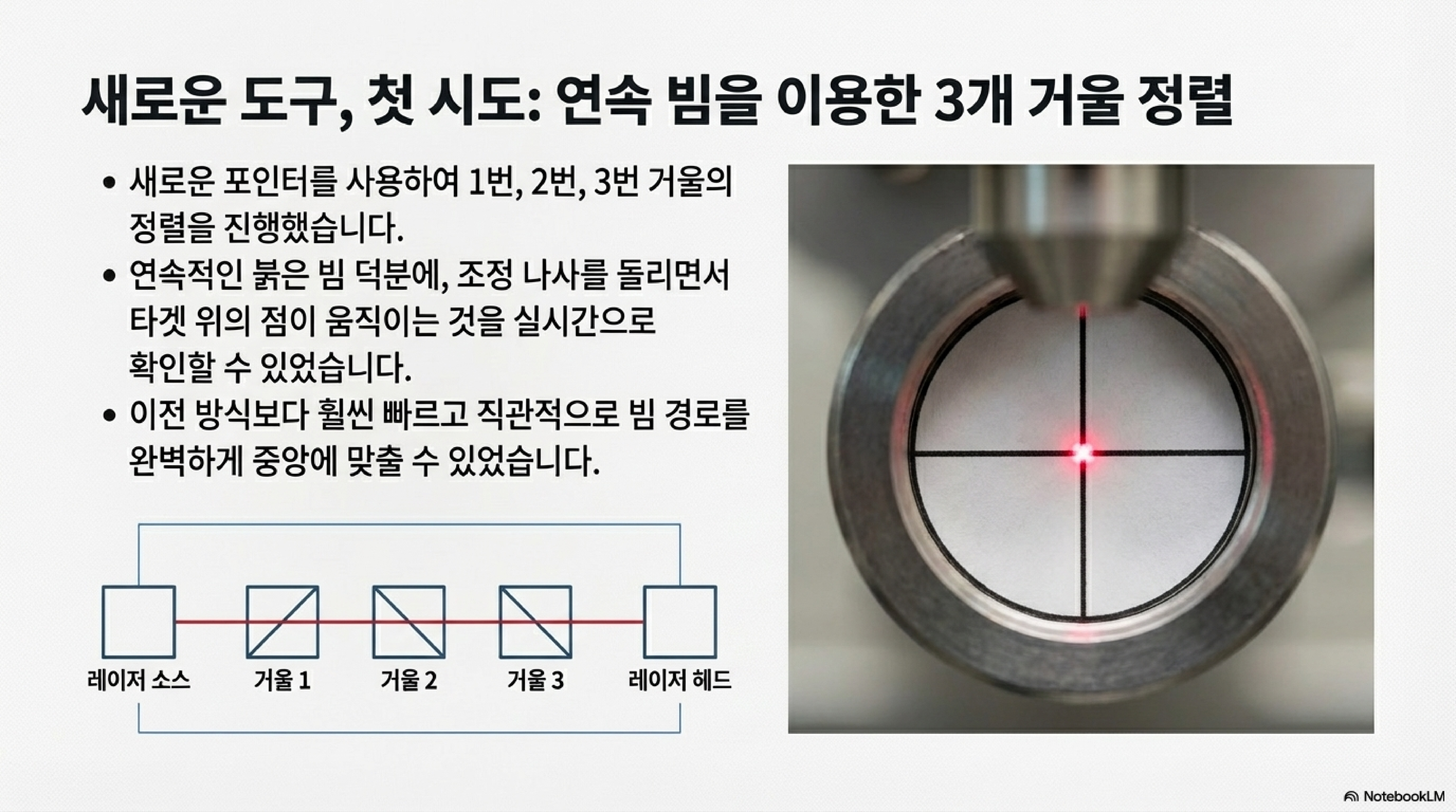 빔을 축과 평행하게 맞춘 후에야 마지막 세 번째 거울을 조정하여 빔이 렌즈의 정중앙으로 들어가도록 하는 것이 올바른 순서입니다. '중앙'에 대한 집착을 버리고 '평행'에 집중하는 순간, 정렬의 개념이 완전히 명확해졌습니다.
