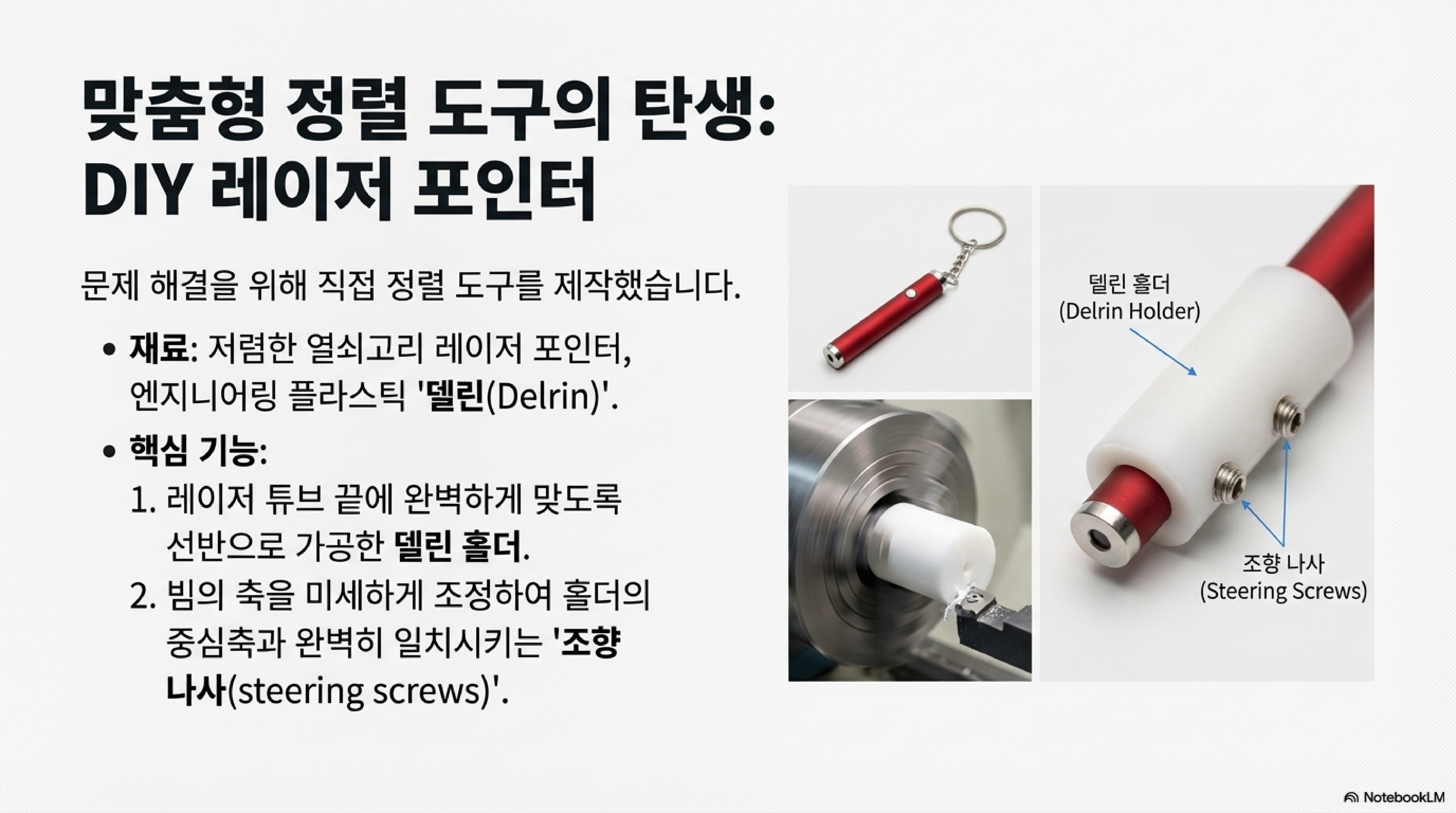 보이지 않는 빔과 씨름하는 데 지친 저는, 과학 실험실에서 사용하는 방식을 제 작업실로 가져오기로 결심했습니다. 그래서 저렴한 열쇠고리 레이저 포인터를 개조하여, 레이저 튜브 끝에 장착할 수 있는 저만의 정렬 도구를 만들었습니다. 선반에서 흰색 델린(Delrin) 소재를 깎아 홀더를 만들고, 빔을 홀더의 축과 완벽하게 정렬하기 위해 네 개의 '조향 나사'를 추가하는 시준 시스템까지 구축했습니다. 이 도구는 보이지 않는 CO2 레이저 대신 지속적이고 눈에 보이는 빨간색 빔을 쏘아줍니다. 이 간단한 DIY 도구 하나만으로 거울 정렬 작업은 성가신 잡일에서 믿을 수 없을 정도로 쉽고 직관적인 과정으로 바뀌었습니다. 더 이상 추측할 필요 없이 빔의 경로를 실시간으로 보며 조정할 수 있게 된 것입니다.