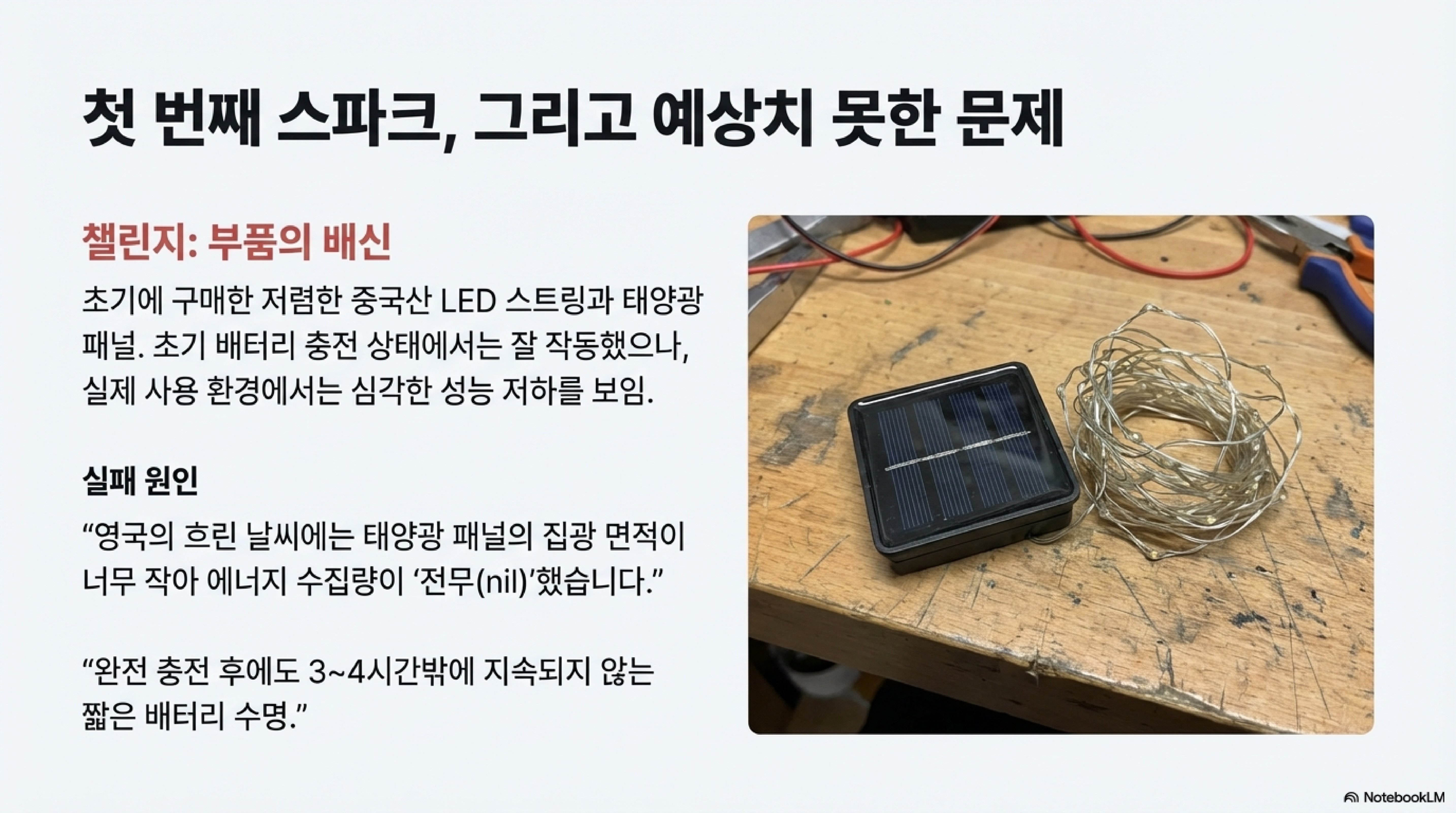 처음에는 당연히 LED 조명이 프로젝트의 핵심이라고 생각했습니다. 하지만 첫 번째 시도에서 그 생각은 완전히 빗나갔습니다. 저렴한 중국산 '페어리 라이트'를 구매했는데, 배터리가 완충된 상태에서는 잘 작동했지만 진짜 문제는 야외 환경이었습니다. 영국 특유의 흐린 날에는 동봉된 패널이 모으는 에너지양이 "무시할 만한 수준(negligible)"이었고, 배터리는 전혀 충전되지 않았습니다.