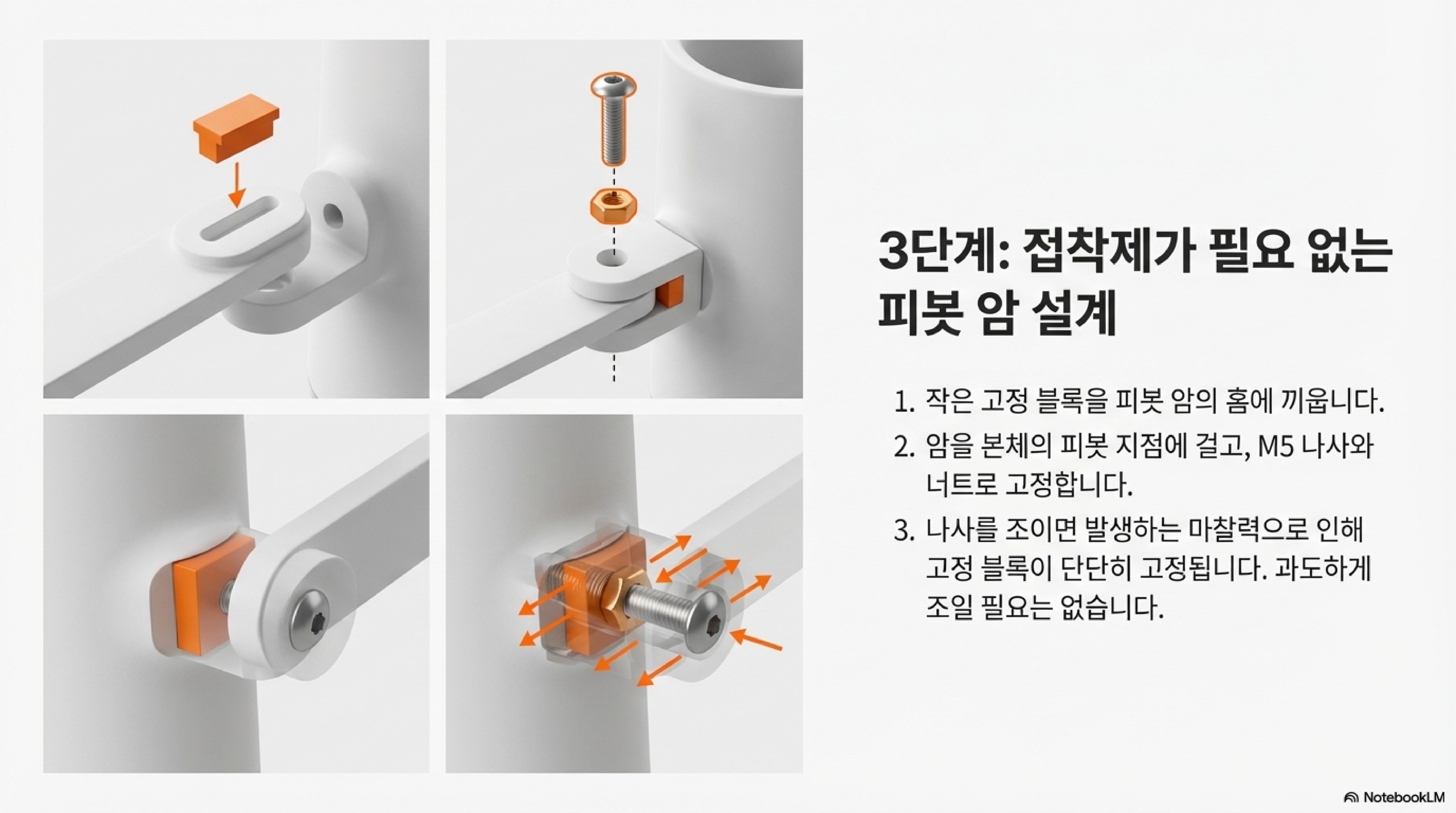 이렇게 기계적으로 맞물린 구조 위에 피벗 암을 올리고, 마침 가지고 있던 '돔 너트(dome nut)' 같은 부품을 이용해 나사를 조이면, 느슨했던 블록 전체가 단단히 고정됩니다. 이 설계의 우아함은 영구적인 결합을 피했다는 데 있습니다. 접착제 대신 기계적인 힘으로 고정함으로써, 언제든지 분해하고, 조정하고, 수리할 수 있는 가능성을 열어두었습니다. 이것은 파괴적이지 않으면서도 견고한 결합을 추구하는, 모든 메이커가 지향해야 할 사려 깊은 기계 설계의 정수라 할 수 있습니다.