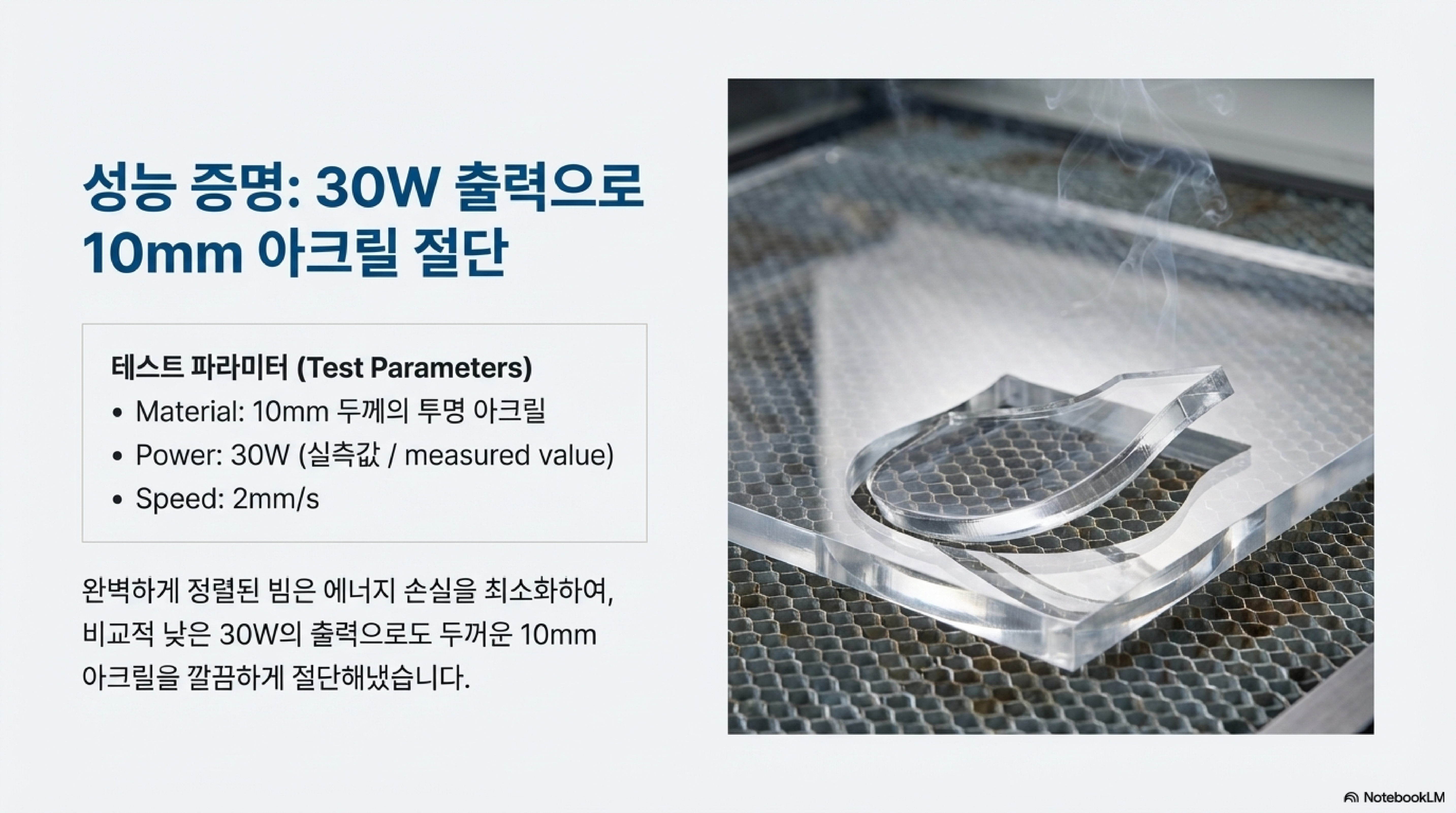 일반적으로 두꺼운 소재를 절단하려면 높은 와트(W)의 레이저가 필요하다고 알려져 있습니다. 10mm 두께의 아크릴을 절단하는 것은 보통 60W 이상의 고출력 장비에서나 가능하다고 생각하기 쉽습니다. 하지만 이 통념을 깨는 결과가 나타났습니다.