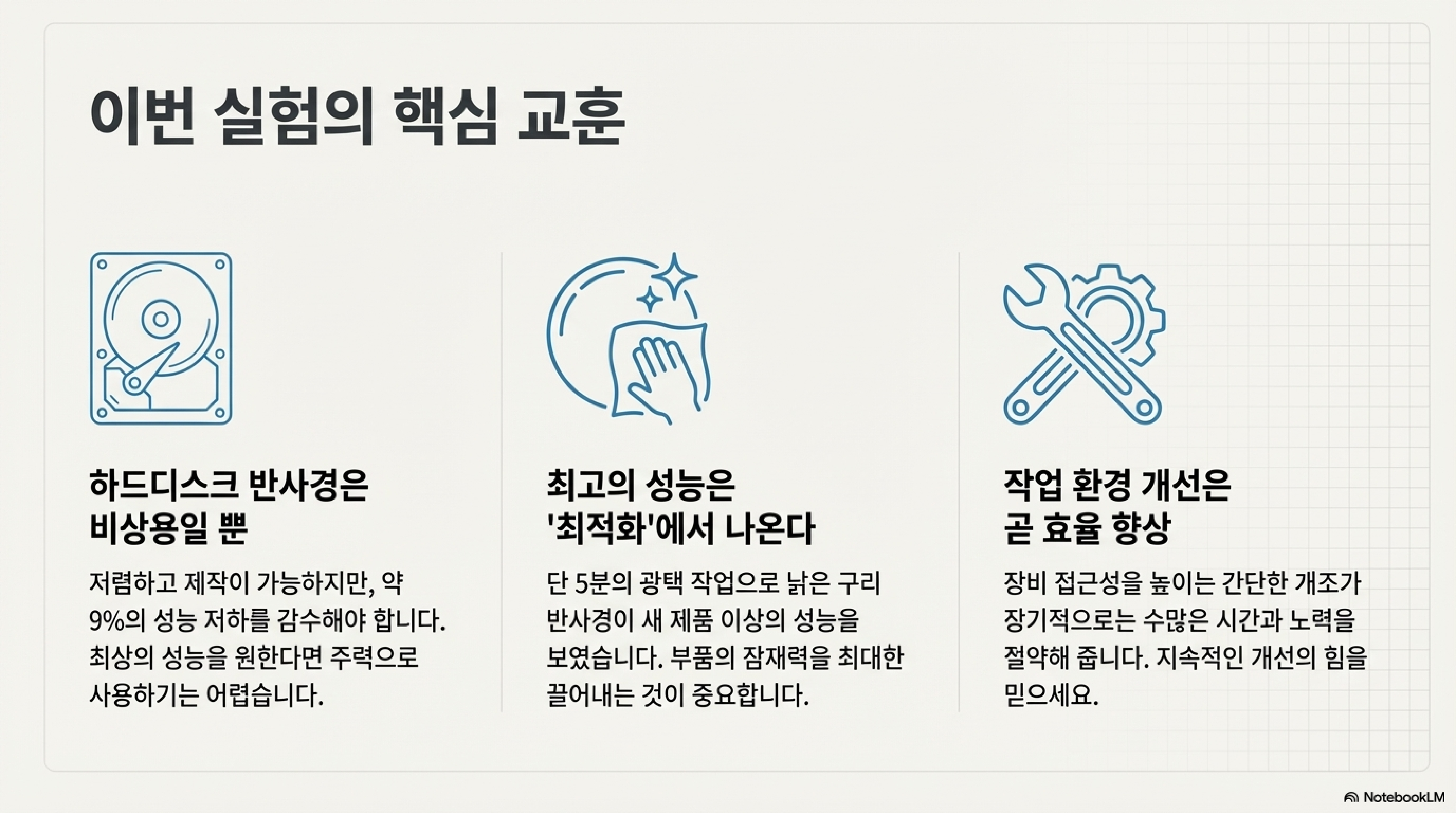 이번 실험은 우리에게 세 가지 중요한 통찰을 남겼습니다. 첫째, 눈에 보이는 '반짝임'이 실제 성능을 대변하지 않는다는 것. 둘째, 낡은 부품도 올바른 '성능 향상' 과정을 거치면 기성품을 뛰어넘을 수 있다는 것. 마지막으로, 실패처럼 보이는 결과물도 관점을 바꾸면 훌륭한 '업사이클링' 자원이 될 수 있다는 것입니다.