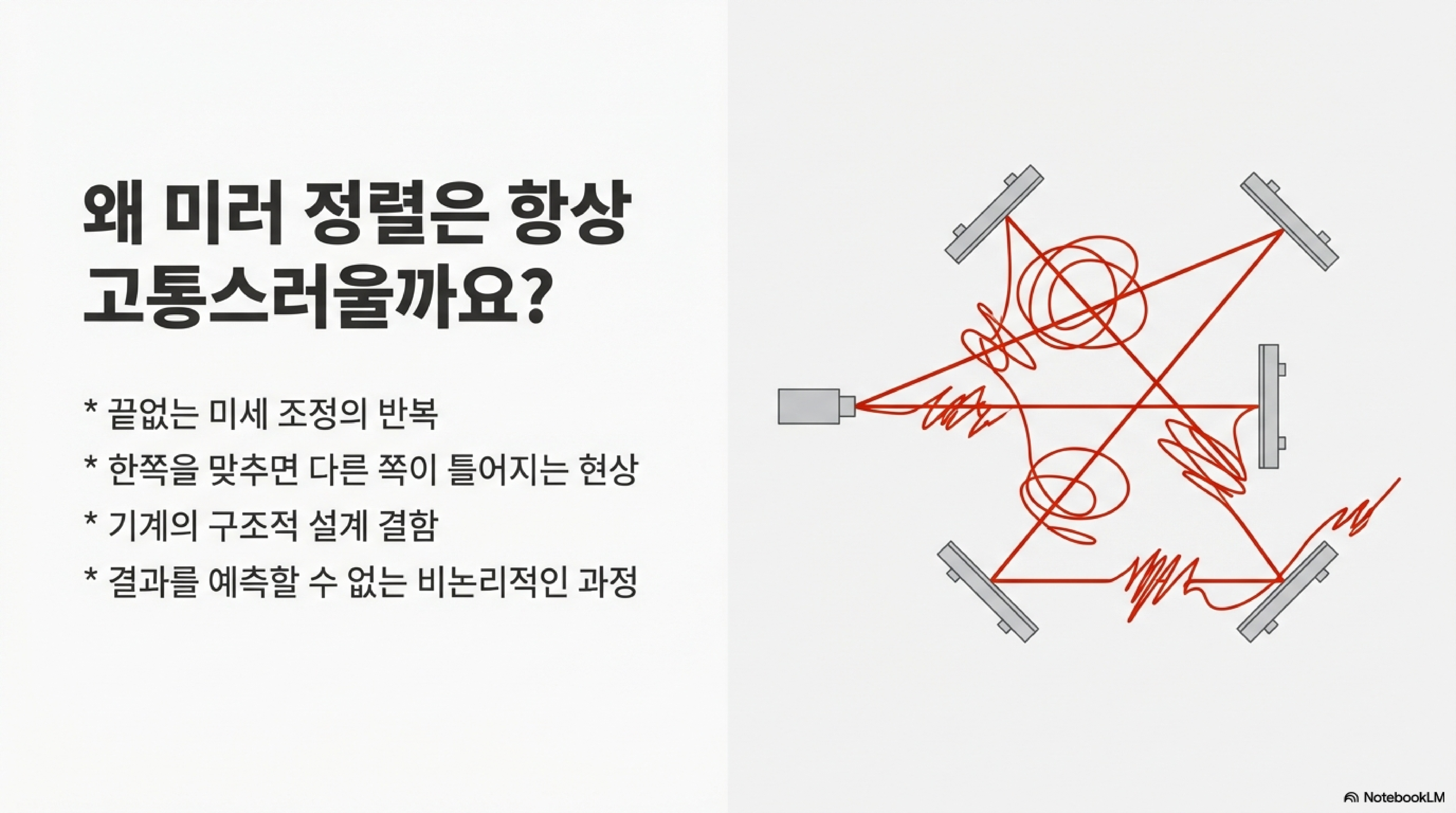 레이저 커터 사용자라면 누구나 한 번쯤 겪어봤을 악몽, 바로 미러 정렬입니다. 몇 시간을 들여 나사를 돌리고, 테스트 샷을 수십 번 쏘아봐도 빔은 엉뚱한 곳으로 향합니다. 이 끝없는 좌절감은 많은 이들의 공통된 고충일 것입니다. 그런데 만약, 이 모든 과정을 '완전히 뒤집어' 거울을 거의 만지지 않고도 정렬을 끝낼 수 있는 방법이 있다면 어떨까요? 이 글에서는 기존의 모든 상식을 파괴하는 혁신적인 미러 정렬 방법에서 발견한, 놀랍고도 역발상적인 5가지 비법을 공개합니다.
