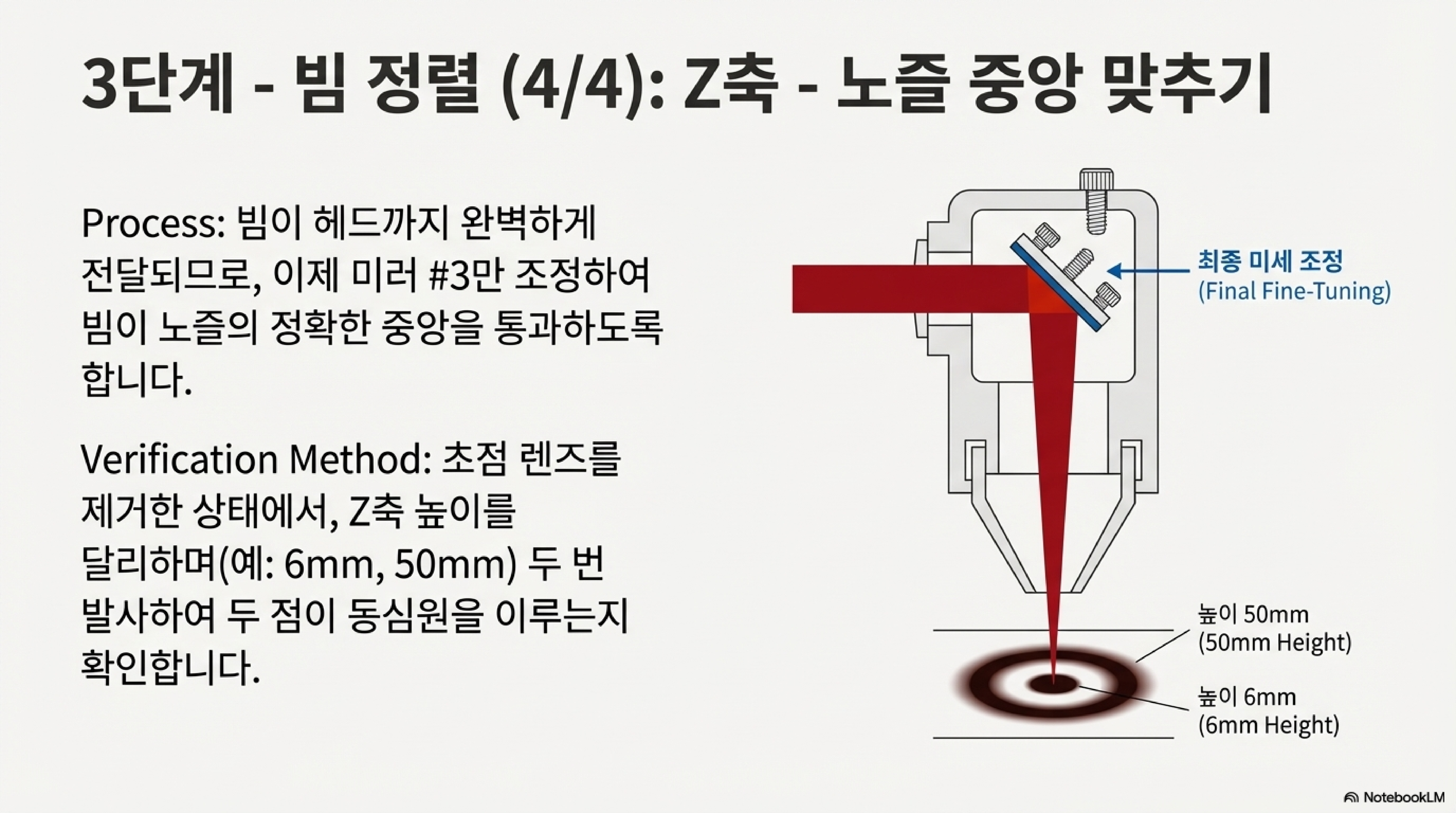 노즐의 정중앙으로 빔을 보내는 마지막 단계는 이 방법의 백미라고 할 수 있습니다. 빔이 Y축과 완벽하게 평행을 이룬 상태에서, 2번 미러를 조정하여 빔을 헤드 중앙으로 보내는 대신, 헤드 어셈블리 전체를 물리적으로 위아래, 앞뒤로 움직여 위치를 맞춥니다.