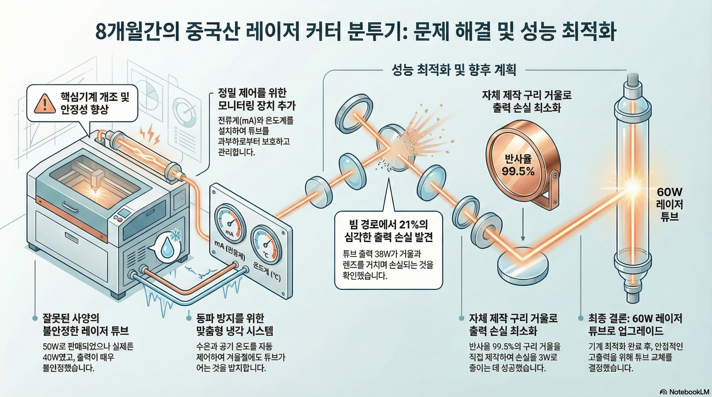지난 8개월간의 여정은 단순히 고장 난 기계를 수리하는 과정이 아니었습니다. "기계적으로는 매우 훌륭한" 기반을 가진 이 장비의 잠재력을 마지막 한 방울까지 짜내는 치열한 최적화 과정이었습니다. 에너지 손실, 빔 정렬, 작업대 반사 등 모든 변수를 통제하고 기계의 모든 부분을 자신의 손으로 제어할 수 있게 되자, 그는 마침내 하나의 명확한 결론에 도달했습니다.