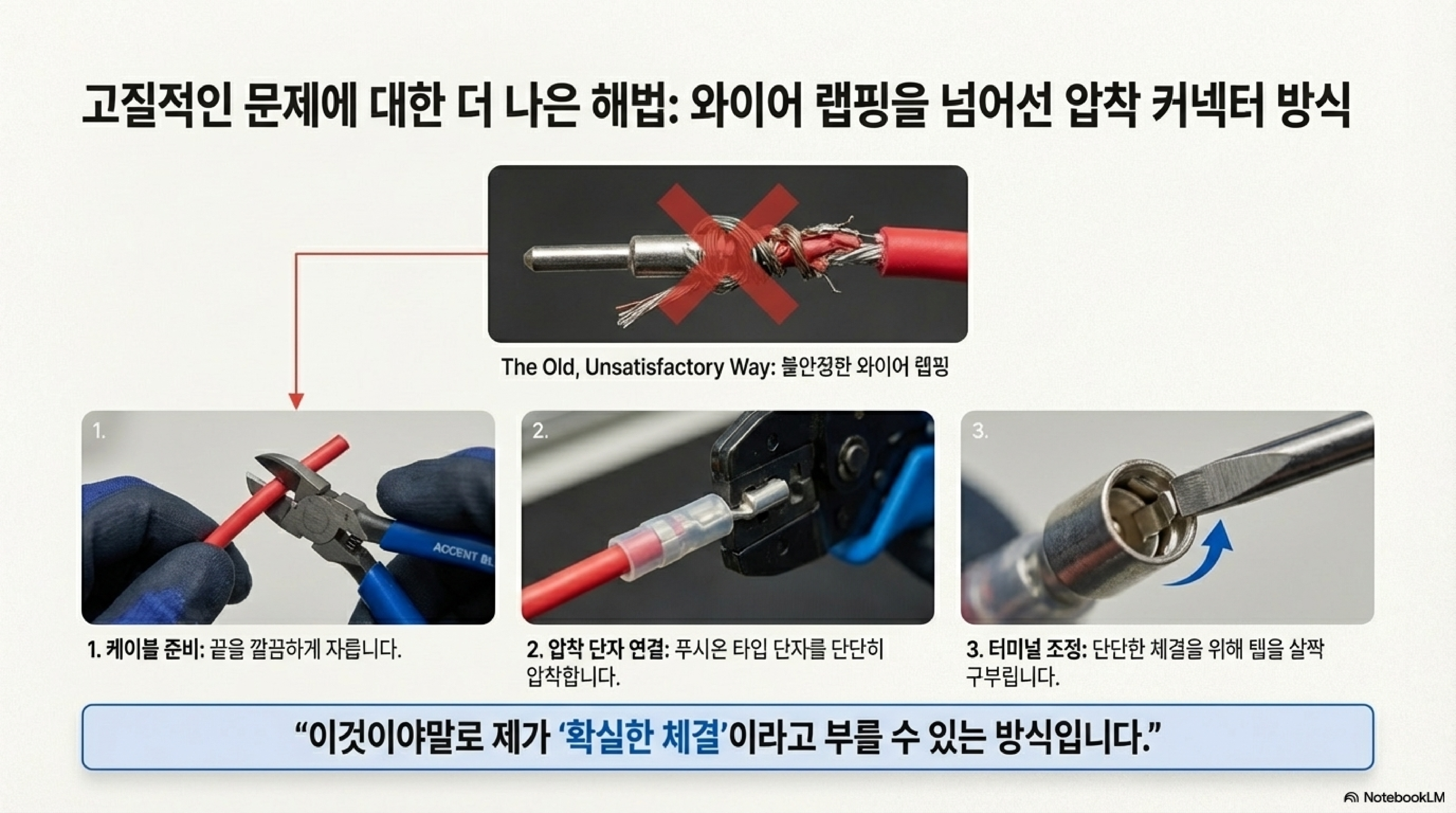 이렇게 하면 압착 단자가 전극에 끼워졌을 때 약간의 유격은 있지만, 손으로 흔들어도 빠지지 않는 ‘아주 단단하고 긍정적인 결합(positive fit)’ 상태가 만들어집니다. 이 상태에서 실리콘 실란트로 마감하면 완벽하죠. 그냥 전선을 감아두는 것보다 훨씬 안정적이고 전문적인 연결을 보장하는 저만의 꿀팁입니다.