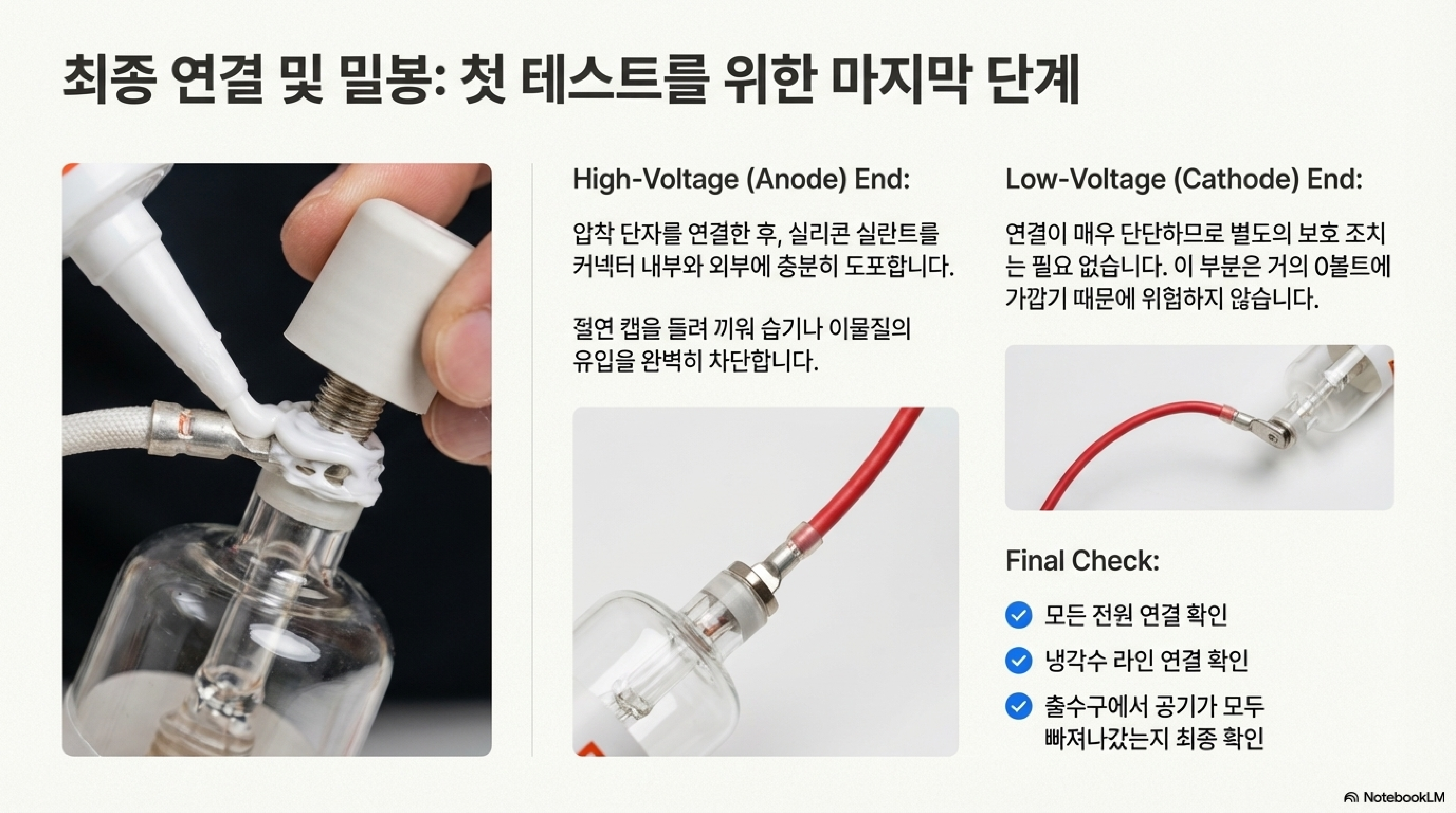 이렇게 하면 압착 단자가 전극에 끼워졌을 때 약간의 유격은 있지만, 손으로 흔들어도 빠지지 않는 ‘아주 단단하고 긍정적인 결합(positive fit)’ 상태가 만들어집니다. 이 상태에서 실리콘 실란트로 마감하면 완벽하죠. 그냥 전선을 감아두는 것보다 훨씬 안정적이고 전문적인 연결을 보장하는 저만의 꿀팁입니다.
