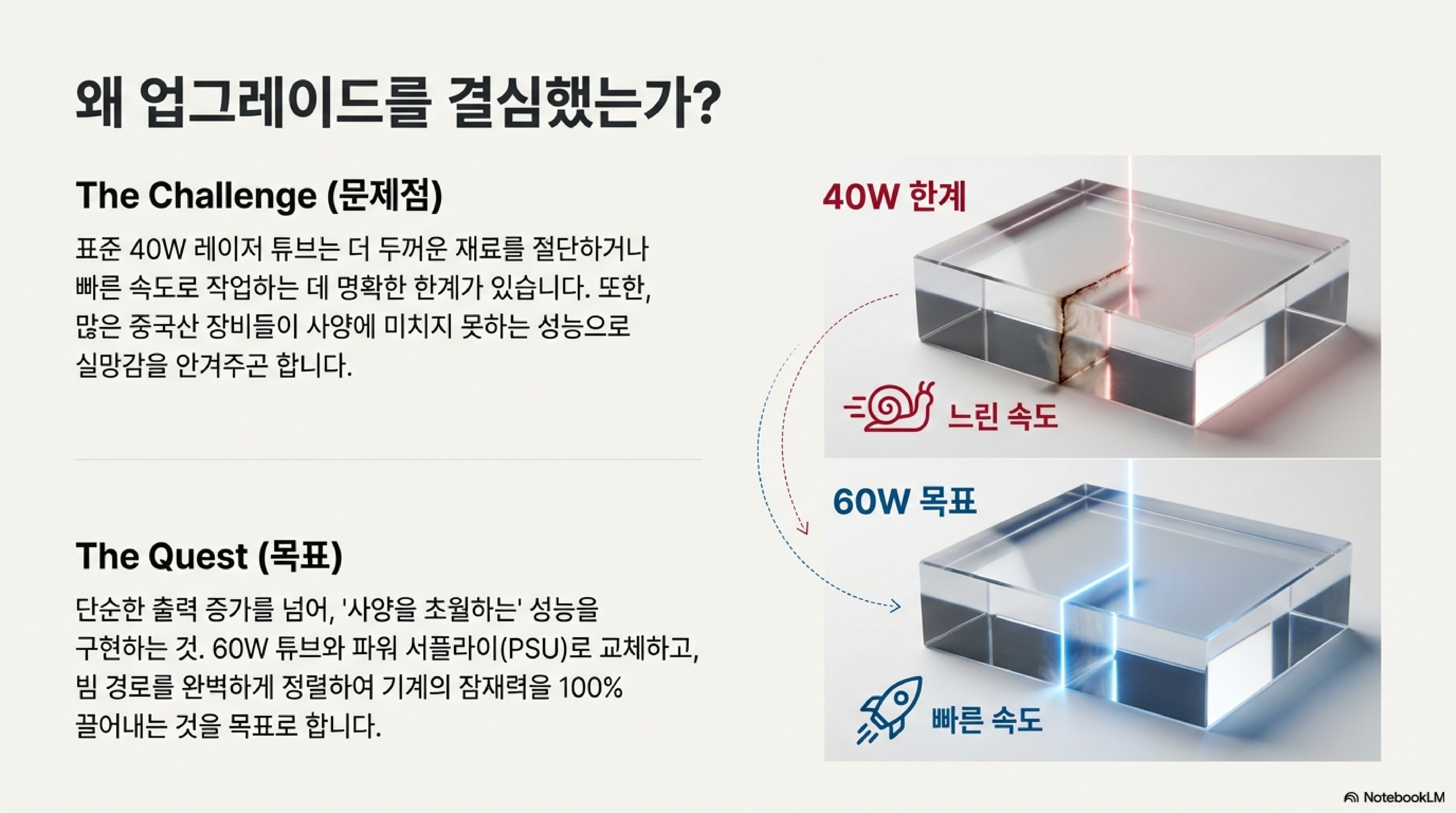 DIY 장비를 업그레이드할 때, 특히 중국에서 부품을 조달할 때면 늘 약간의 불안감과 씨름하게 됩니다. "과장된 사양과 기대 이하의 성능"이라는 말을 우리 모두 한 번쯤은 경험해봤을 겁니다. 저 역시 최근 제 40W 레이저 커터를 60W 시스템으로 업그레이드하면서 비슷한 걱정을 안고 있었습니다. 하지만 이 과정은 제 예상을 완전히 뒤엎는 놀라운 발견으로 가득 찬 여정이었습니다. 기존의 통념에 도전하는 경험이었죠.