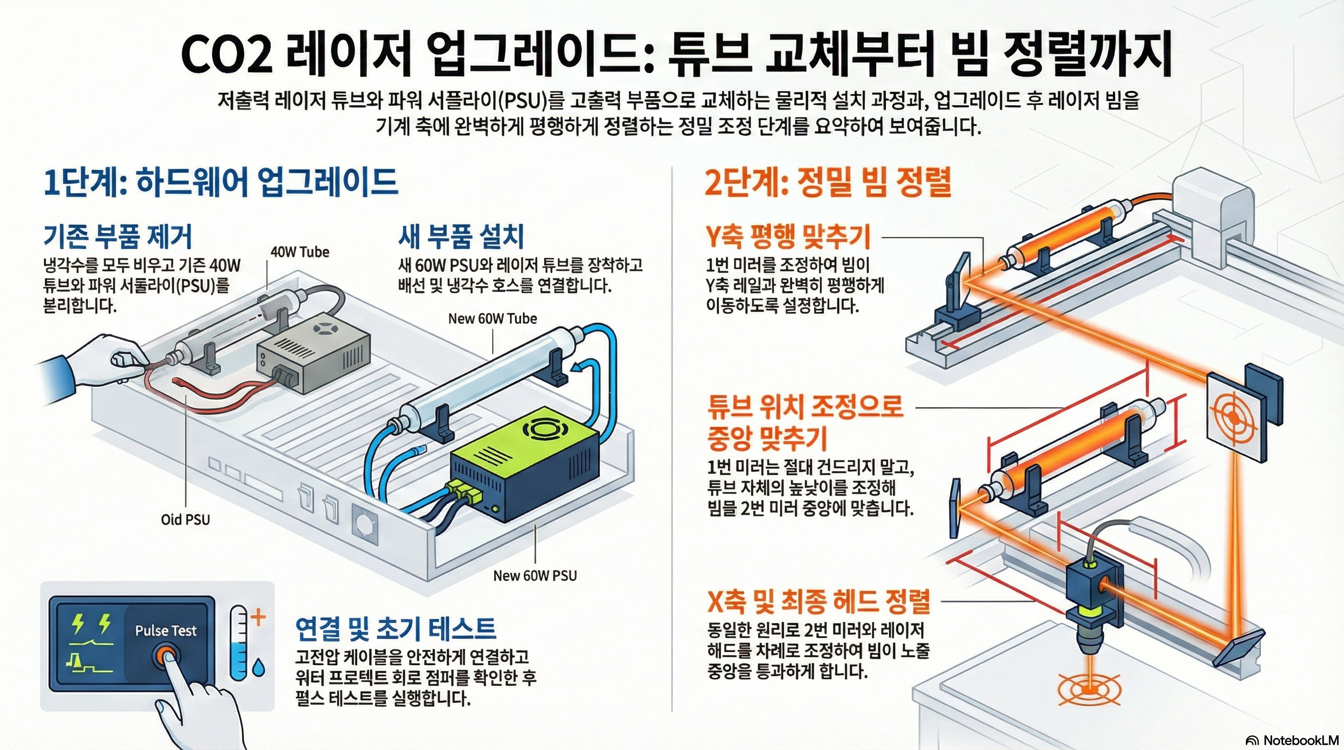 빔 정렬은 레이저 커터 사용자들에게 가장 골치 아픈 작업 중 하나입니다. 하지만 저는 이번에 핵심적인 원리를 깨달았습니다. 바로 첫 번째 미러를 이용해 빔을 축과 평행하게 만들었다면, 그 이후에는 빔을 중앙에 맞추기 위해 그 미러를 절대 다시 조정해서는 안 된다는 것입니다.