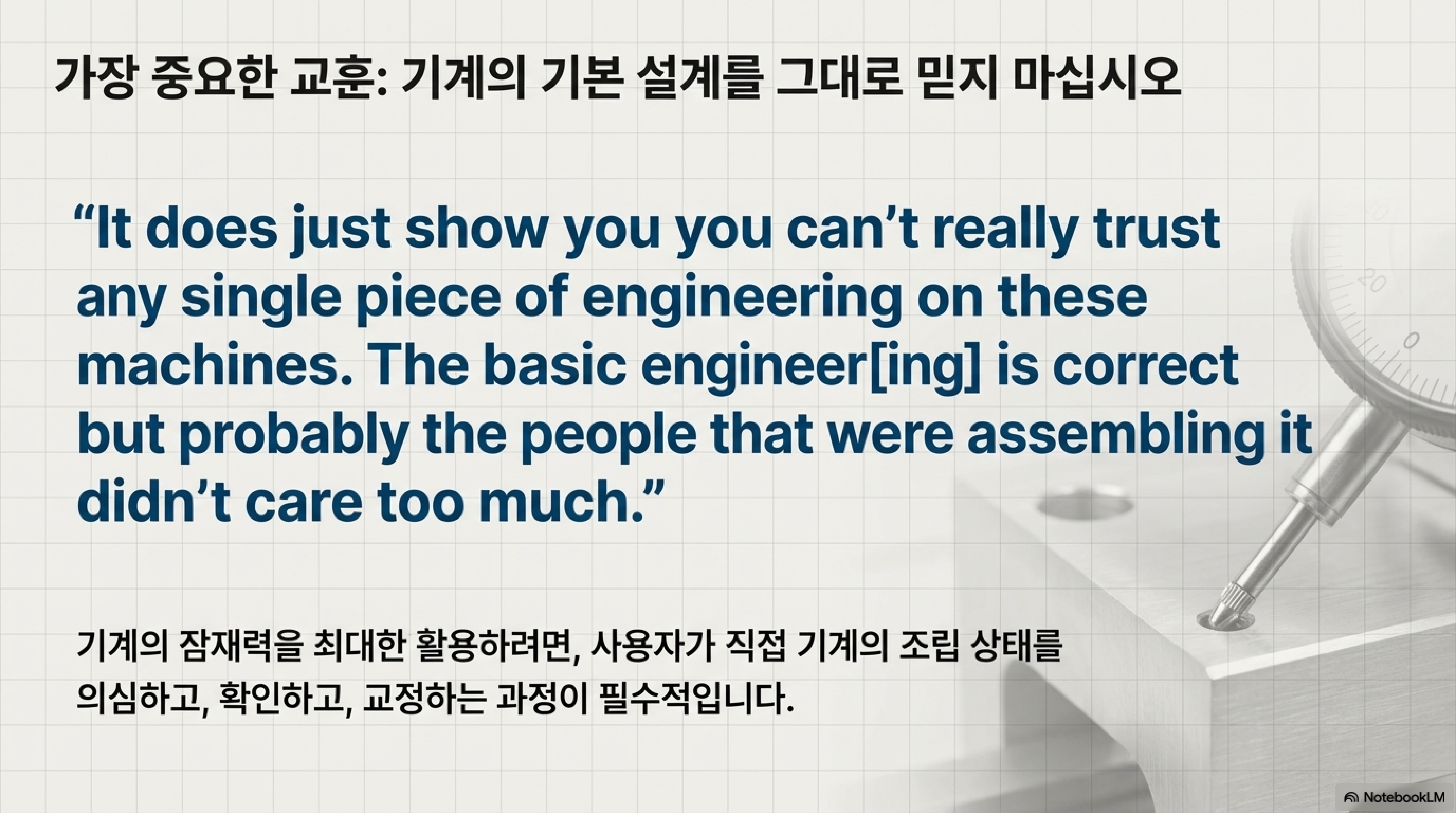 단순한 평탄도 점검에서 시작된 이 이야기는 결국 장비의 근본적인 문제를 해결하는 대대적인 정비 작업으로 이어졌습니다. 이는 가장 중요한 문제는 종종 우리 눈에 보이지 않는 곳에 숨어있다는 사실을 다시 한번 일깨워줍니다.