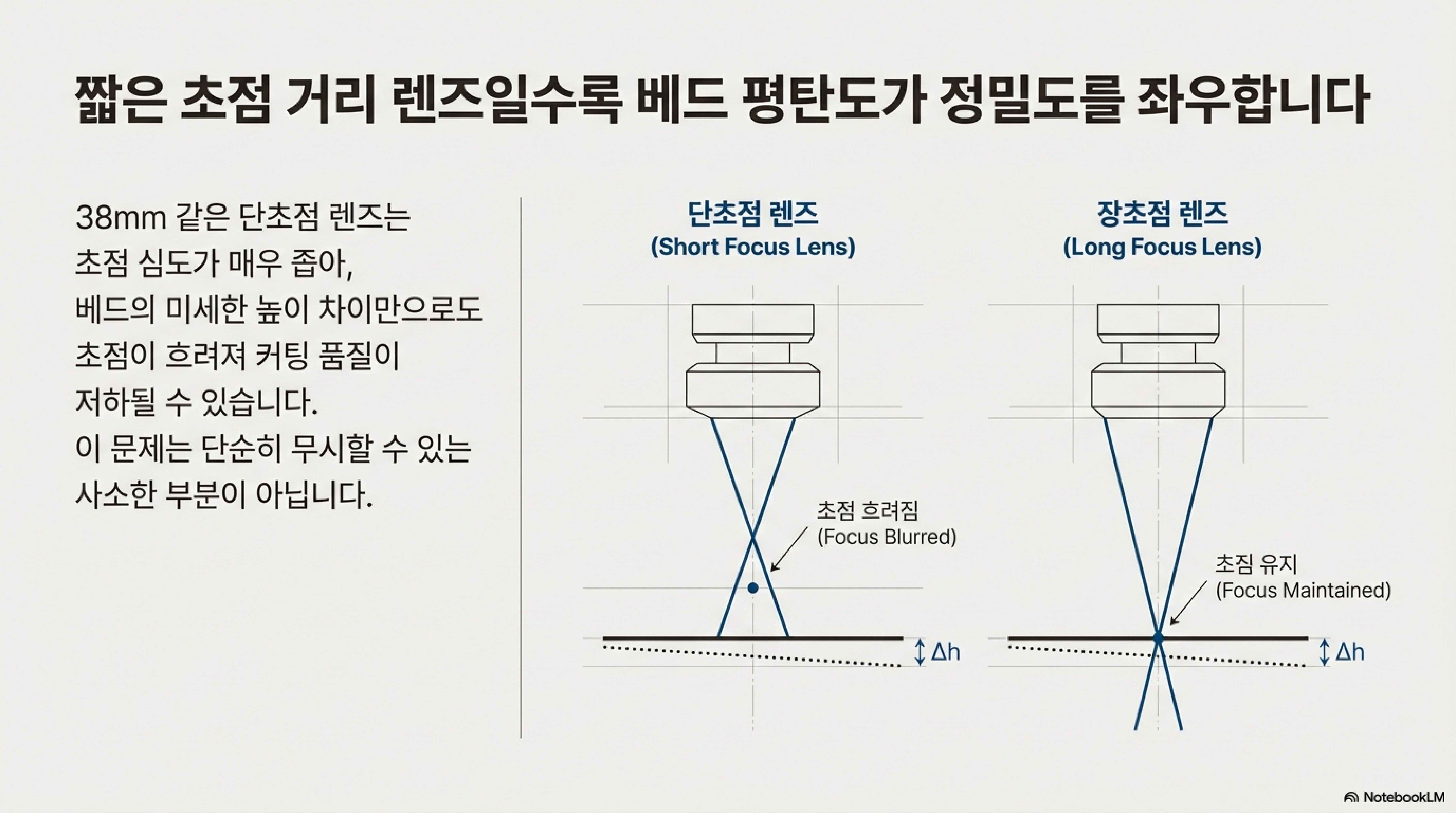 38mm 렌즈의 초점 심도는 종이 한 장처럼 얇습니다. 2.4mm의 높이 차이는 단순한 오차가 아니라, 가공물을 레이저의 초점 범위에서 완전히 벗어나게 만들어 절단 실패나 흐릿한 각인을 유발하는 치명적인 결함입니다. '문제없어 보이던' 기계가 사실은 정밀 작업에 있어서는 근본적으로 고장 나 있었던 셈입니다. 당시 그의 심정은 이 한마디로 요약됩니다.