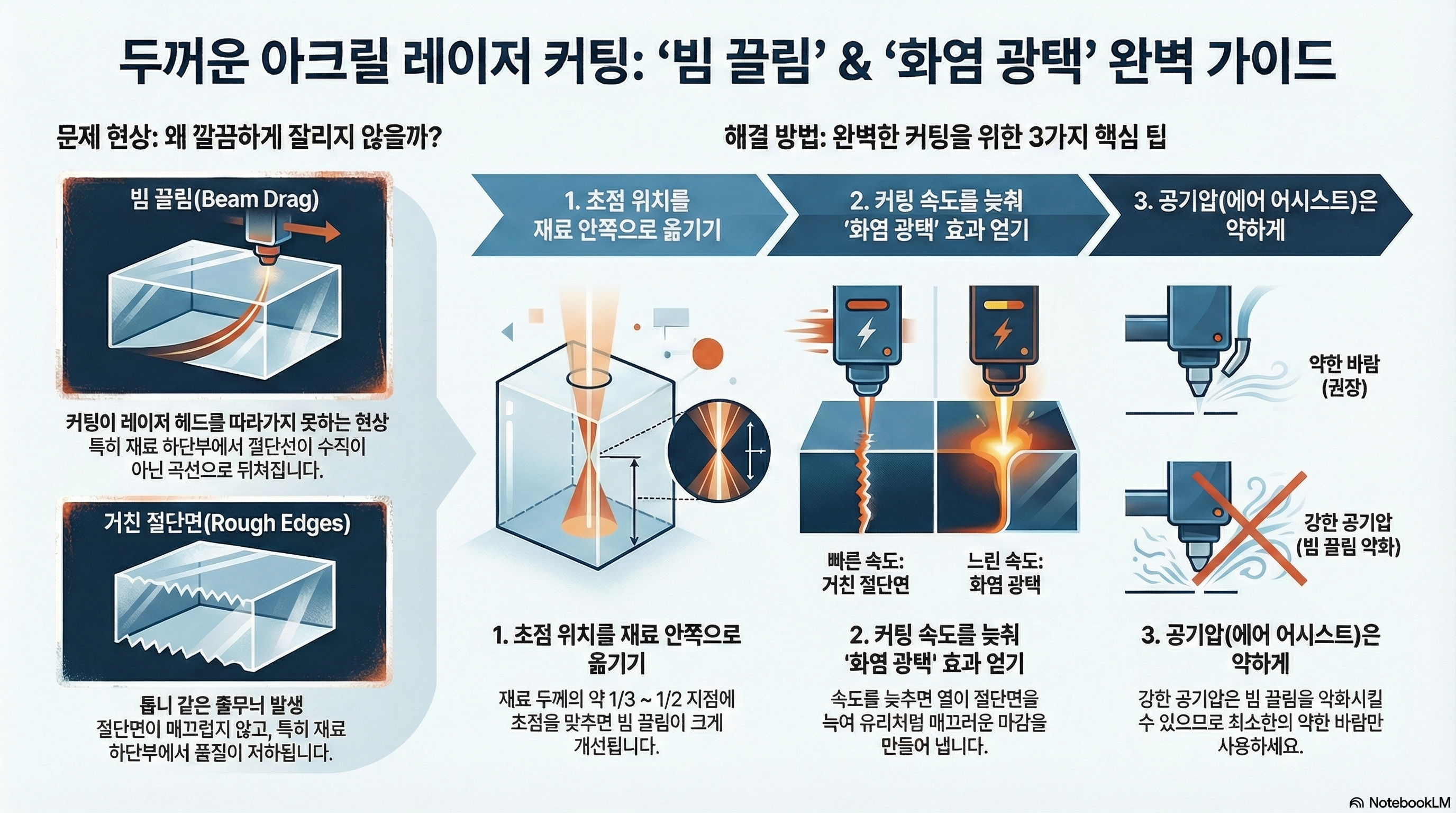 두꺼운 아크릴을 레이저로 커팅할 때, 모서리 부분에서 레이저가 바닥까지 완전히 뚫고 나가지 못하는 '빔 드래그(beam drag)' 현상(레이저 빔이 재료 상단보다 하단에서 뒤처져, 특히 모서리 부분이 제대로 절단되지 않는 문제)이나 거칠고 만족스럽지 못한 절단면 때문에 좌절한 경험이 있으신가요? 이러한 문제들은 레이저 커터 사용자라면 흔히 겪는 어려움입니다.
