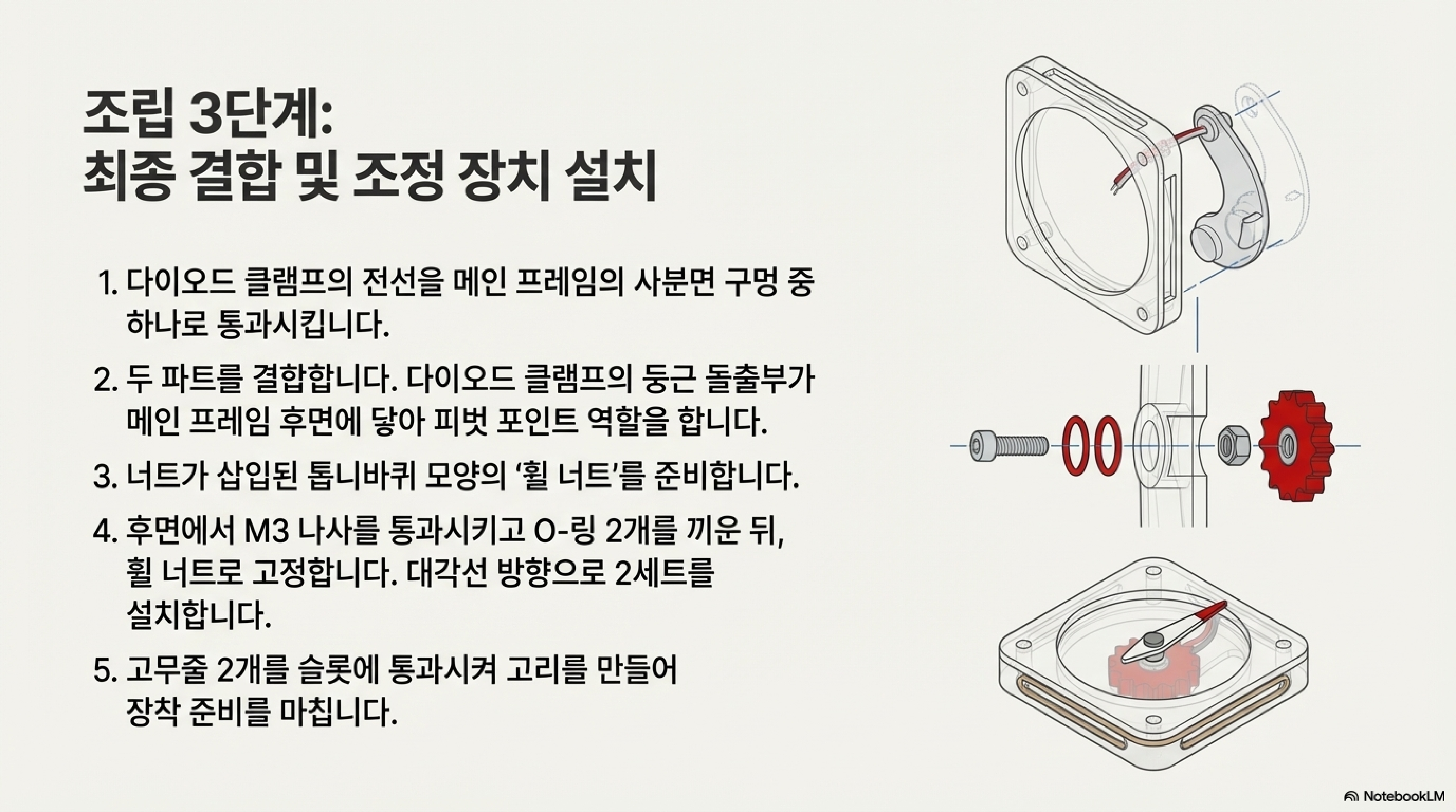 두 번째 교훈은 이 장치의 독창적인 기계 설계 원리에서 나왔습니다. 설계 초기 목표는 스프링처럼 구하기 어려운 특수 부품 없이, 주변에서 쉽게 구할 수 있는 나사, 너트, O링만으로 간단하게 만드는 것이었습니다.