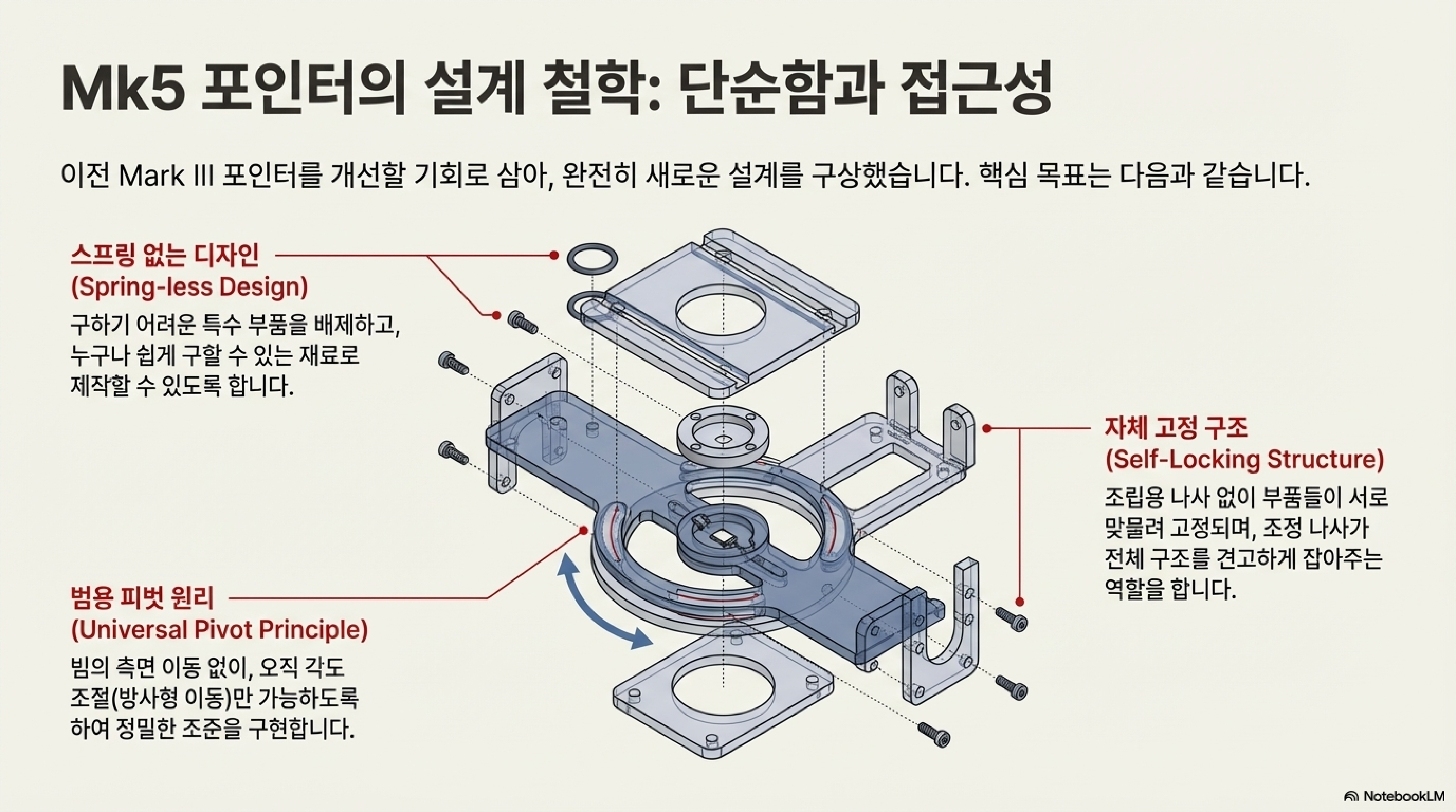 조립 과정은 놀라움의 연속이었습니다. 각 부품은 접착제 한 방울 없이도 '푸시핏(push fit)' 방식으로 결합되었습니다. 부품들은 그냥 미끄러지듯 들어가는 것이 아니라, 정확히 정렬하여 힘을 주어 누르면 만족스러운 '딸깍' 소리와 함께 끼워져 믿을 수 없을 만큼 견고한 구조를 만들어냈습니다. 하지만 이 설계의 진짜 천재성은 '조정용 나사'에 숨겨져 있었습니다. 이 나사들은 단순히 빔의 방향을 조절하는 역할만 하는 것이 아니었습니다. 네 개의 나사가 만들어내는 분산된 장력 시스템이 전체 조립품을 단단히 고정하는 안정적이고 조절 가능한 '새장'을 형성했습니다. 힘이 완벽하게 균형을 이루는 것입니다.