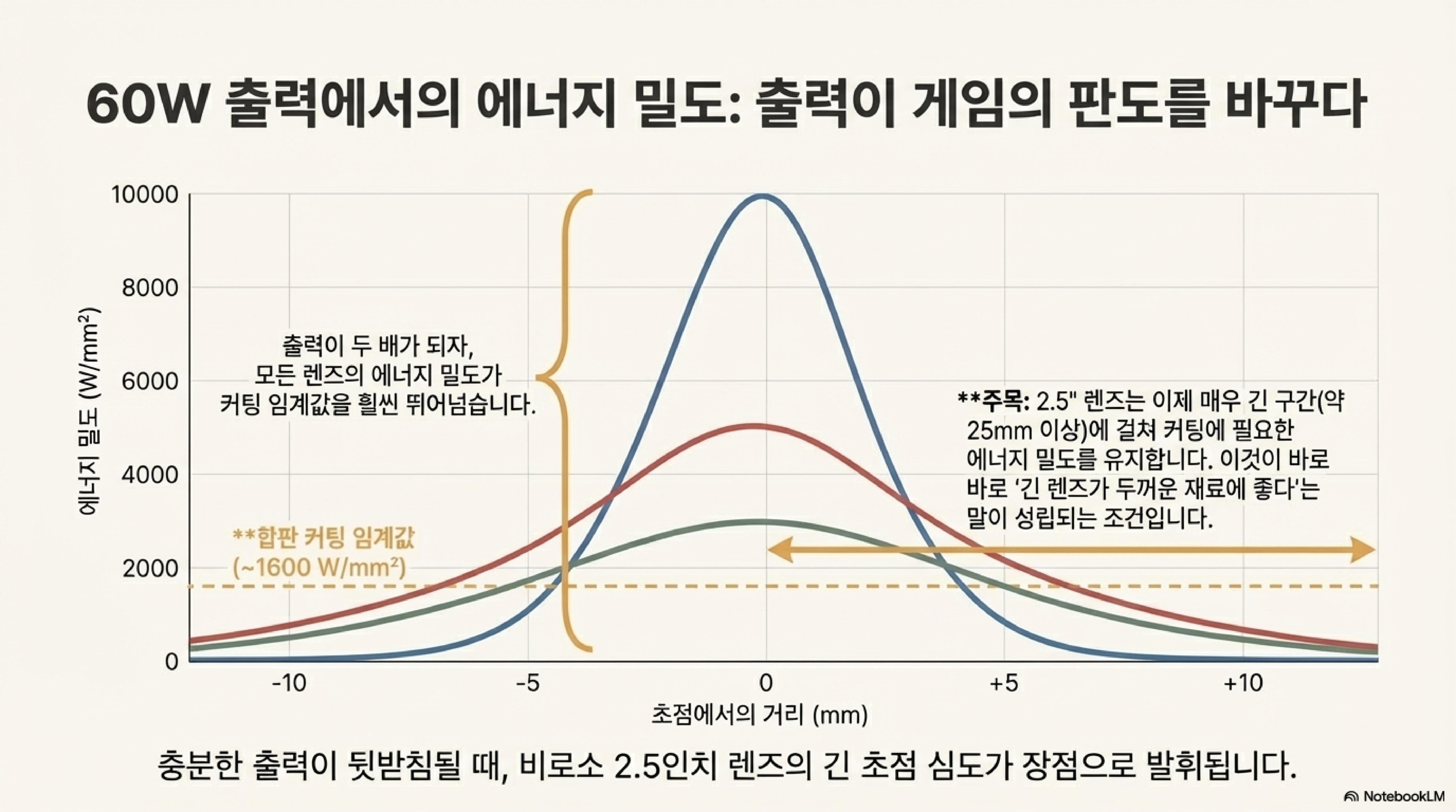 긴 초점 렌즈는 더 평행에 가까운 빔 형태 덕분에 깊은 곳까지 에너지 밀도를 유지할 수 있어 두꺼운 재료 절단에 유리한 것이 사실입니다. 하지만 이는 기계가 애초에 충분한 출력을 가지고 있을 때만 유효한 이야기입니다. 긴 렌즈는 빔 스폿이 크기 때문에 최대 에너지 밀도 자체가 낮습니다. 만약 초기 출력이 너무 낮으면, 이 에너지 밀도는 재료를 절단하는 데 필요한 임계값에 도달조차 못 할 수 있습니다.