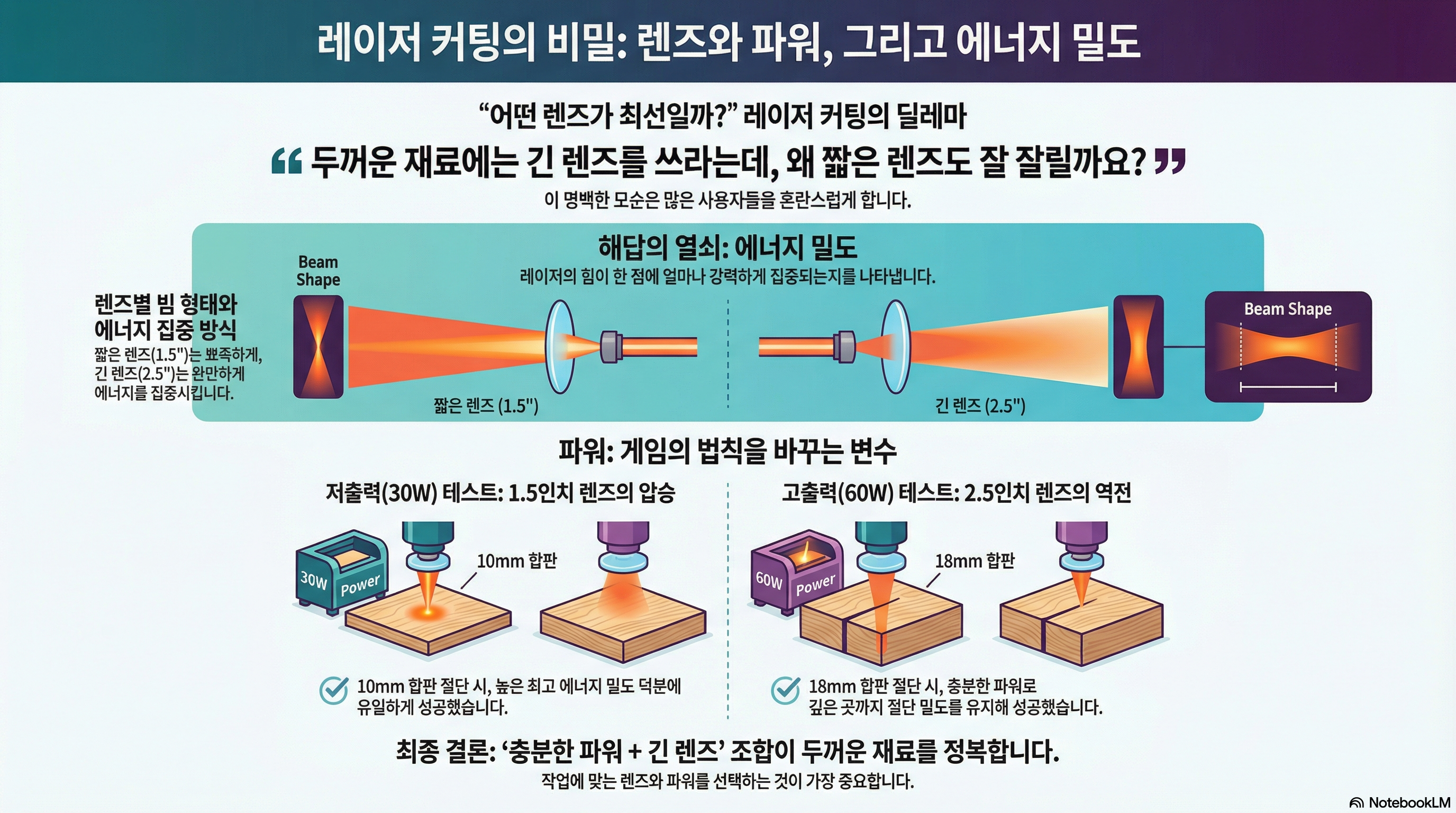 - 고출력 (60W) 테스트: 긴 '리치'를 가진 2.5인치 렌즈가 승리. 출력을 올리자, 긴 '리치'를 가진 2.5인치 렌즈가 마침내 두꺼운 18mm 합판을 절단해냈습니다. 반면 1.5인치 렌즈는 빔이 너무 빨리 퍼져버려 이 작업에는 실패했습니다.