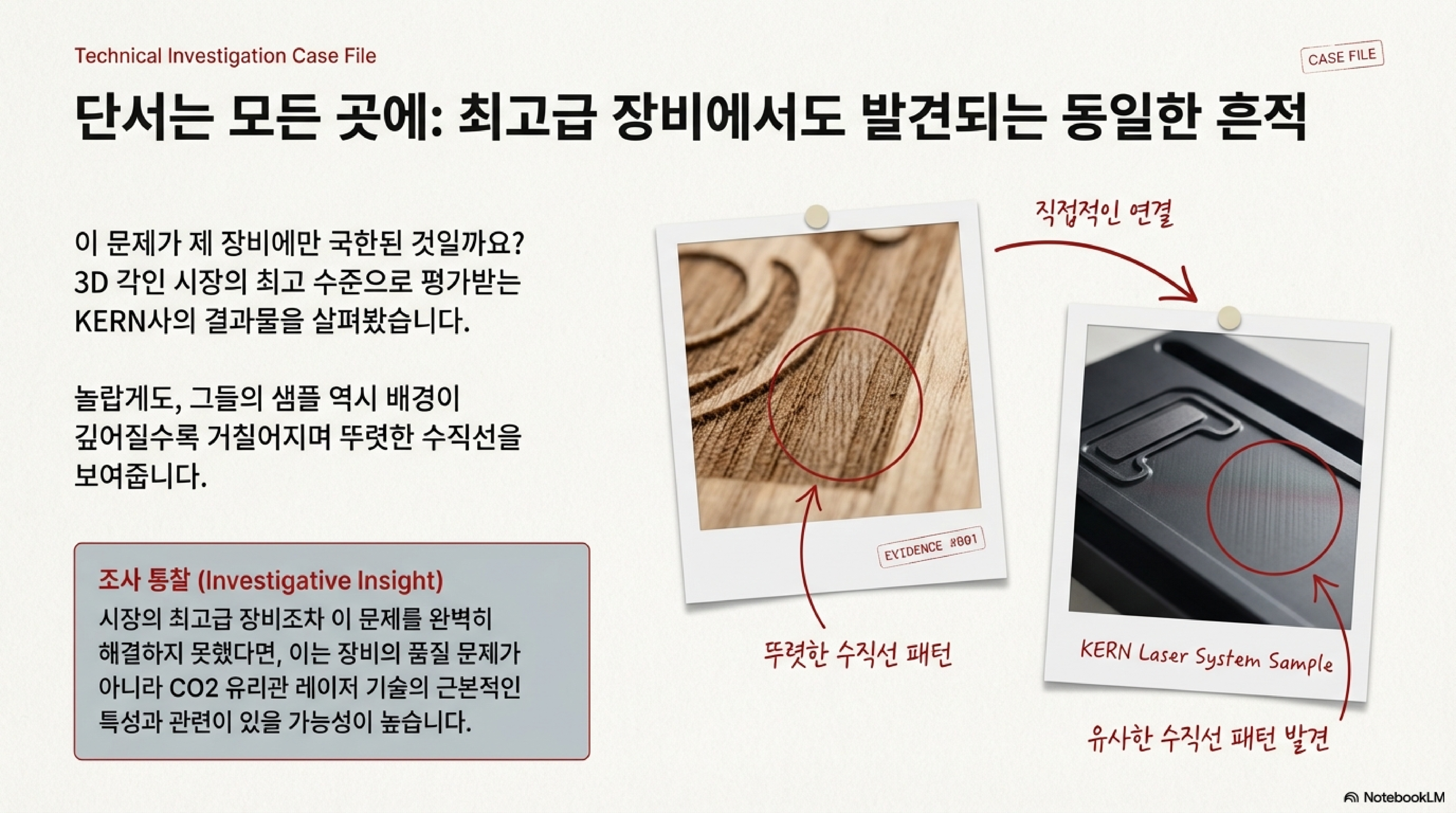 각인 결과물에 나타나는 미세한 수직선들은 제 가정과 정면으로 배치되었습니다. 흥미로운 점은 'Kar'와 같은 최고급 기계의 결과물에서도 비슷한 패턴이 보인다는 사실이었습니다. 이것은 제 기계만의 문제가 아니라, 이 기술의 근본적인 특성일 수 있음을 시사했습니다.