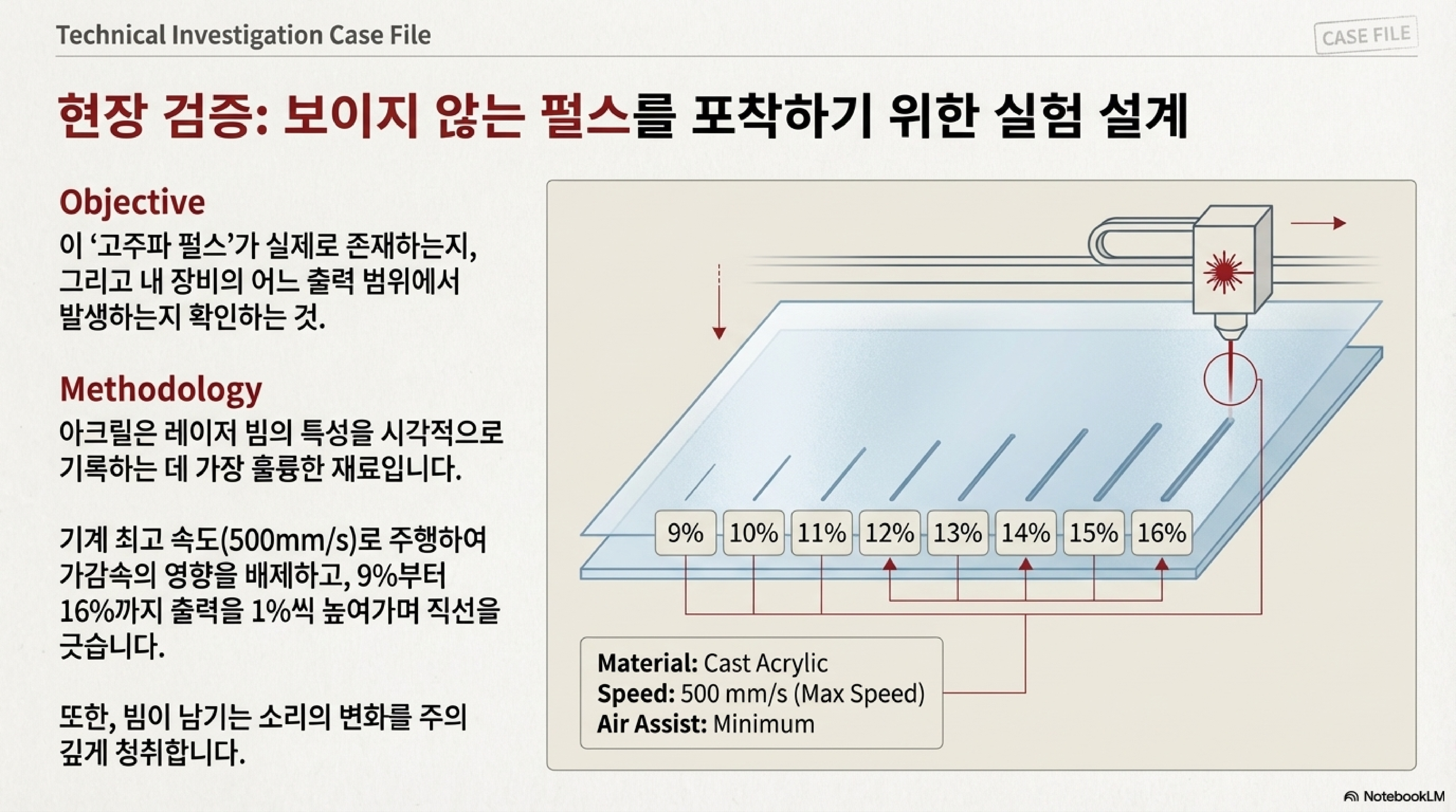 핵심 요약: 옅은 각인을 위해 사용하는 낮은 출력 설정에서 레이저는 안정적인 빔이 아니라 매우 빠르게 깜빡이는 펄스였습니다. 이것이 바로 그토록 저를 혼란스럽게 했던, 각인 표면이 거칠고 입자처럼 보이는 질감을 만들어낸 진짜 이유였습니다.