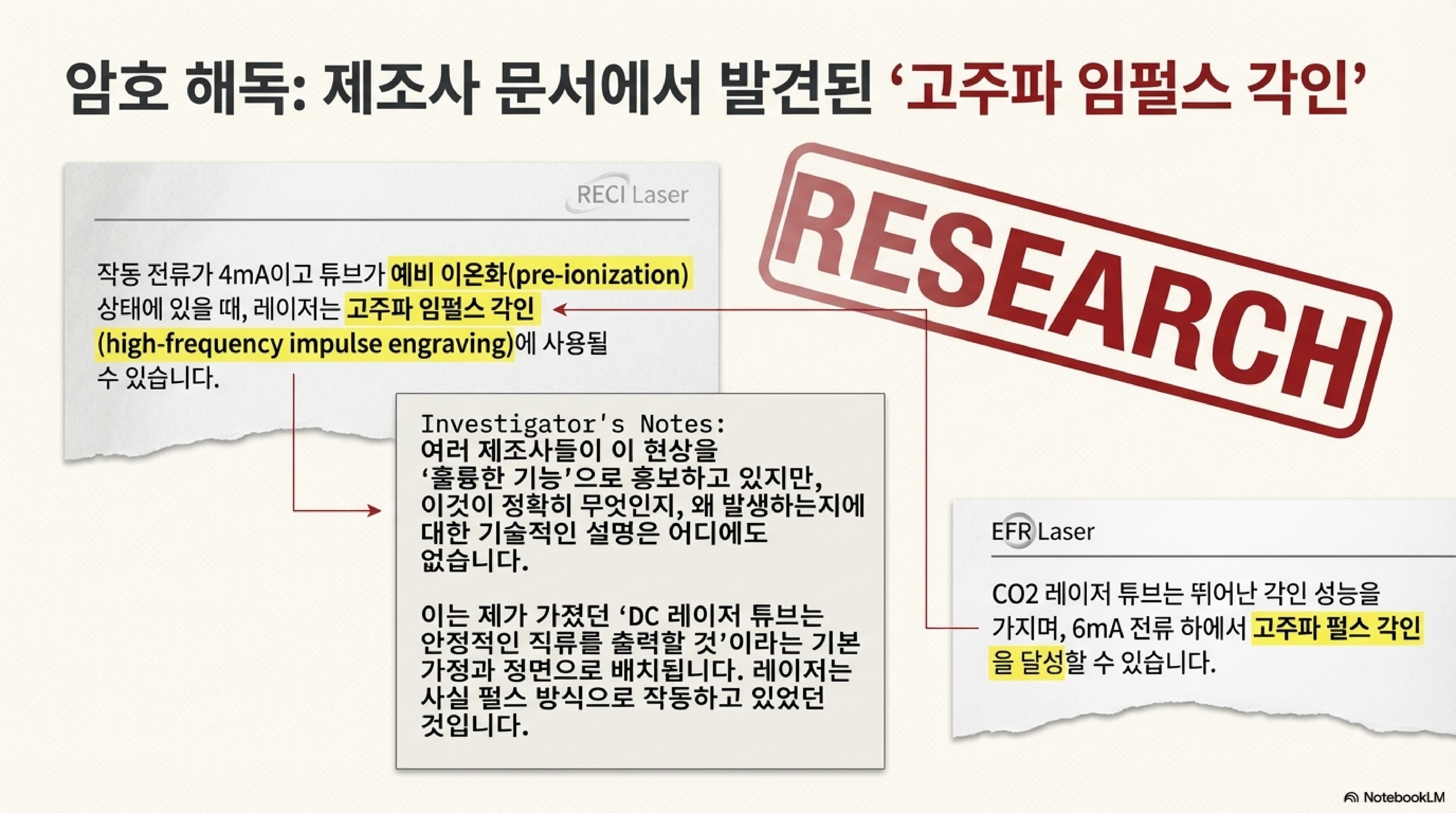 결정적인 단서를 찾기 위해 WRECI나 EFR 같은 유명 레이저 튜브 제조사의 웹사이트를 샅샅이 뒤졌습니다. 바로 거기서 "사전 이온화(pre-ionization)"와 "고주파 임펄스 조각(high-frequency impulse engraving)"이라는 생소한 용어를 발견했습니다. 하지만 인터넷 어디에서도 "고주파 임펄스 조각"이 무엇인지 설명하는 자료를 찾을 수 없었고, 제조사에 이메일을 보내 문의했지만 답변은 '제로'였습니다. 이 숨겨진 비밀에 대한 호기심은 저를 직접 실험으로 이끌었습니다.
