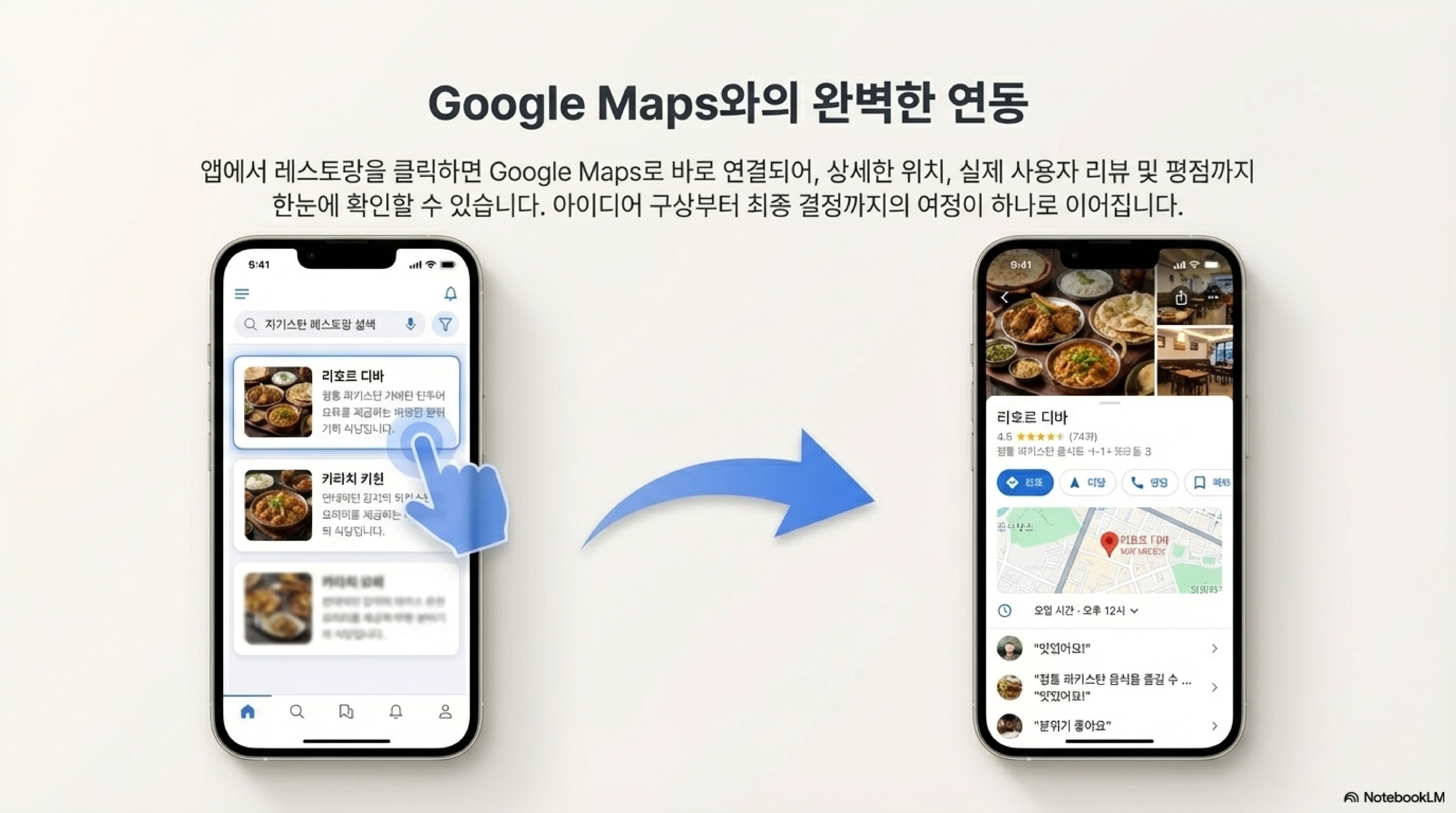 이 앱은 사용자의 위치를 기반으로 주변 파키스탄 음식점을 찾아냈고, 각 음식점에 대한 설명과 멋진 애니메이션을 함께 보여주었습니다. 더 나아가, 결과 화면을 클릭하면 구글 지도로 바로 연결되어 해당 음식점의 위치, 리뷰, 평점까지 한눈에 확인할 수 있었습니다. 이 모든 과정은 개발자가 전통적으로 어려움을 겪었던 구글 지도 API에 대한 지식 없이도 완벽하게 구현되었습니다.