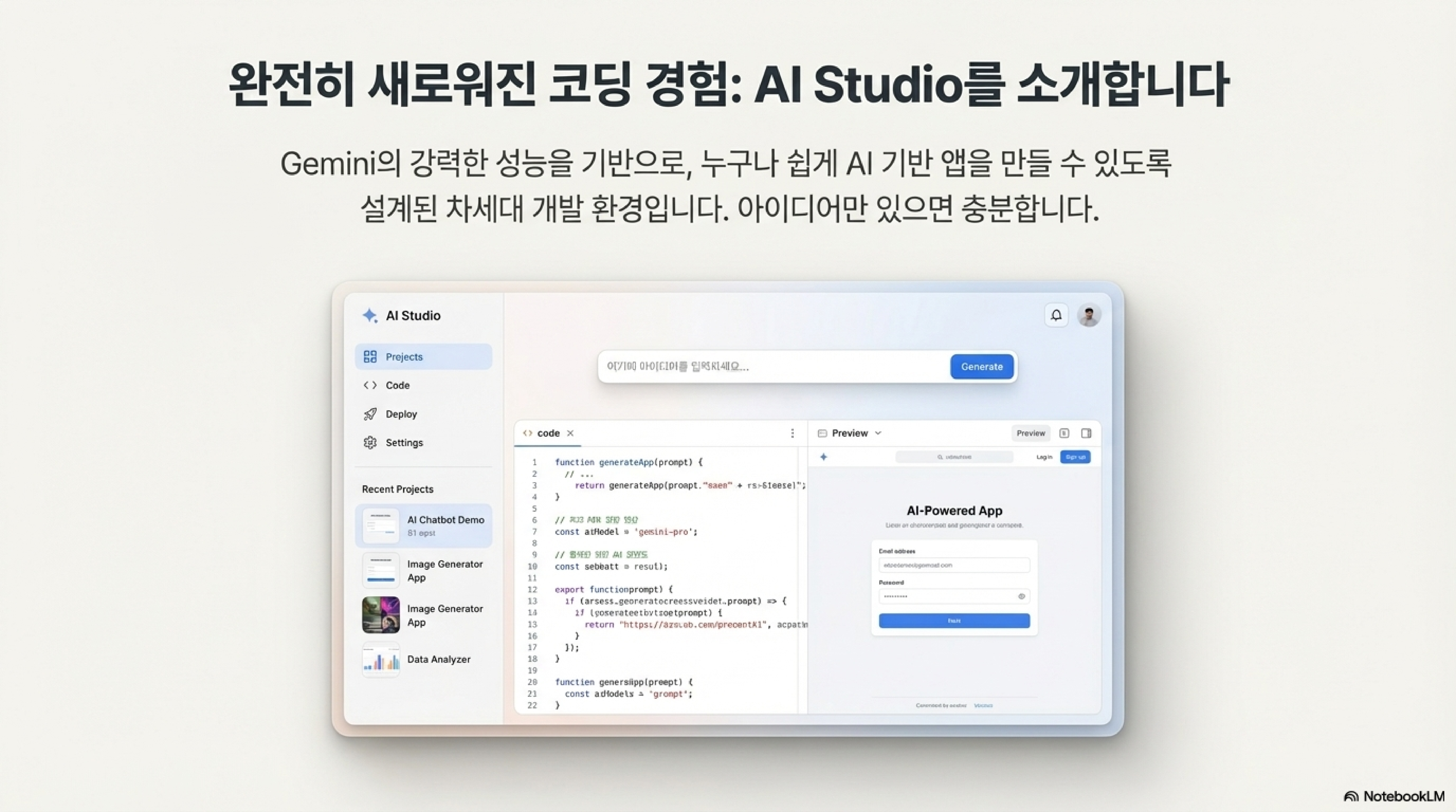 나만의 앱을 만들고 싶다는 생각은 누구나 한 번쯤 해보지만, 복잡한 코딩의 장벽 앞에서 이내 포기하곤 합니다. 하지만 이제 아이디어와 현실 사이를 가로막던 그 거대한 벽이 허물어집니다. 구글의 새로운 AI 스튜디오는 누구나 자신의 아이디어를 AI 애플리케이션으로 손쉽게 구현할 수 있는 놀라운 길을 열어주었습니다.