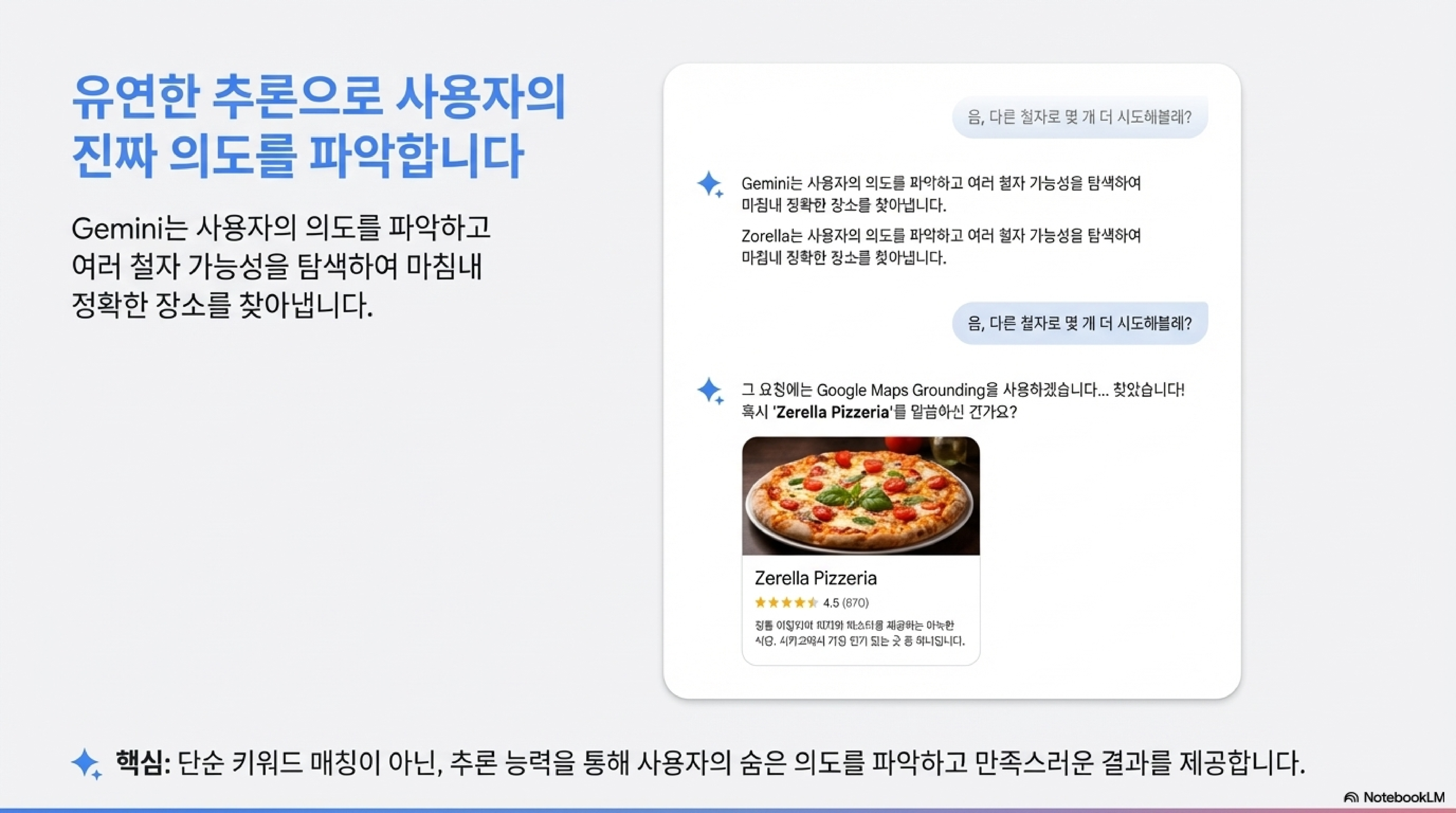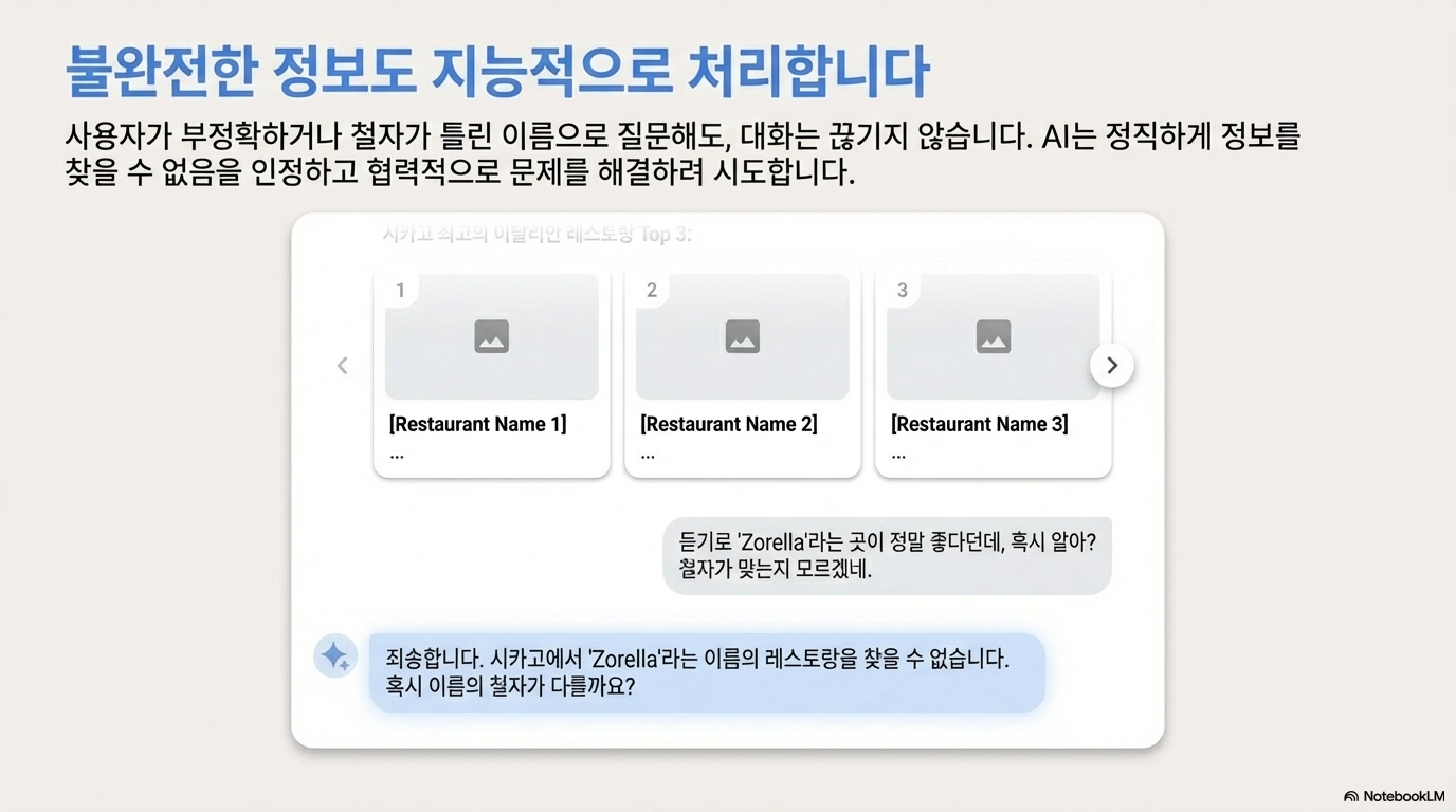 AI가 항상 완벽할 것이라는 기대는 비현실적입니다. 중요한 것은 AI가 불완전하거나 모호한 정보를 만났을 때 어떻게 대처하는가입니다. 시카고의 이탈리안 레스토랑을 찾는 데모 상황에서 이 기능의 진가가 드러납니다.