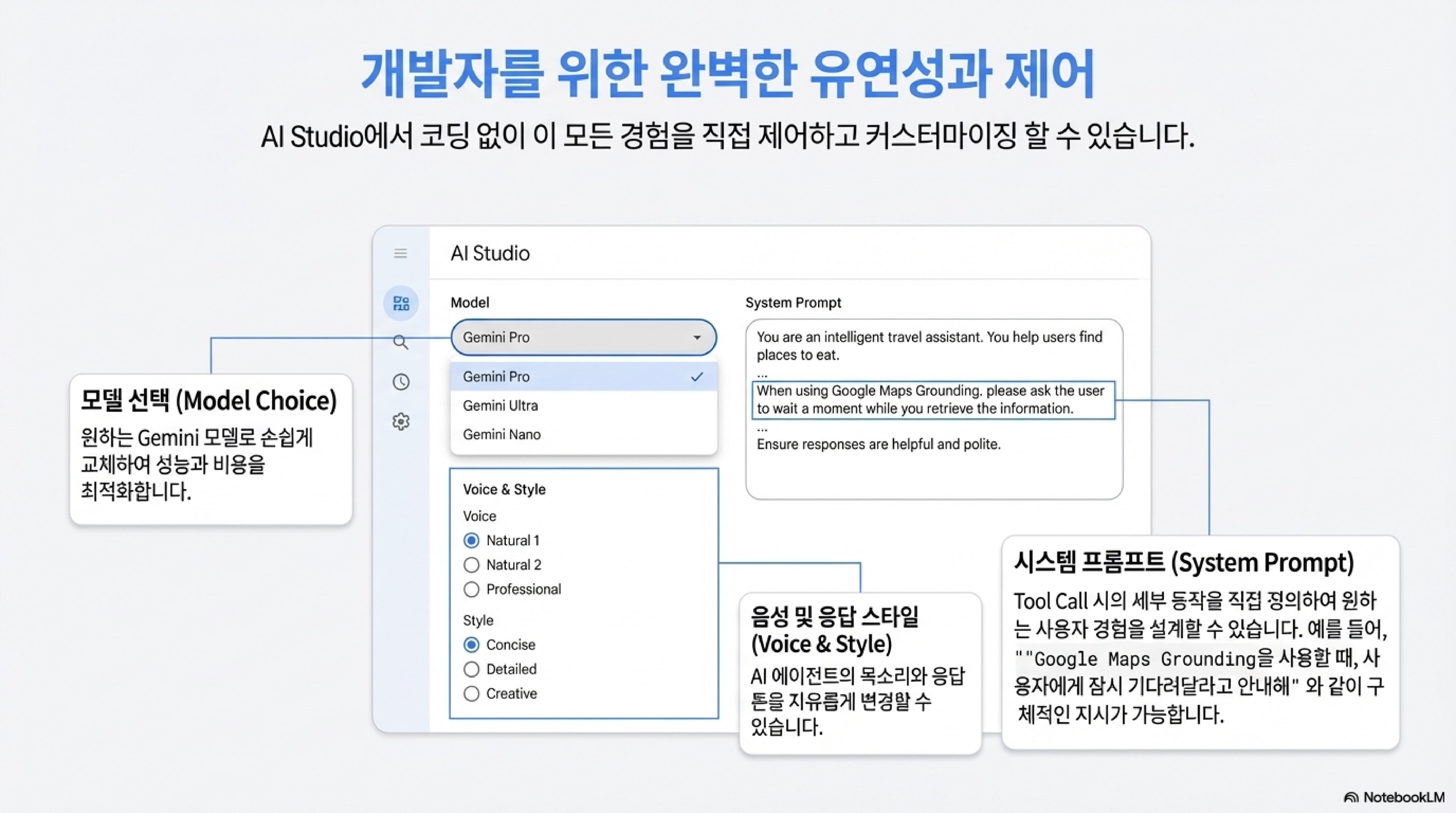 개발자에게 가장 중요한 것 중 하나는 바로 '제어권'입니다. Google Maps Grounding 기능은 AI Studio의 설정 패널을 통해 놀라울 정도로 깊이 있는 사용자화 옵션을 제공합니다. 여러분은 필요에 따라 Gemini 모델을 교체하거나 음성을 변경할 수 있습니다.