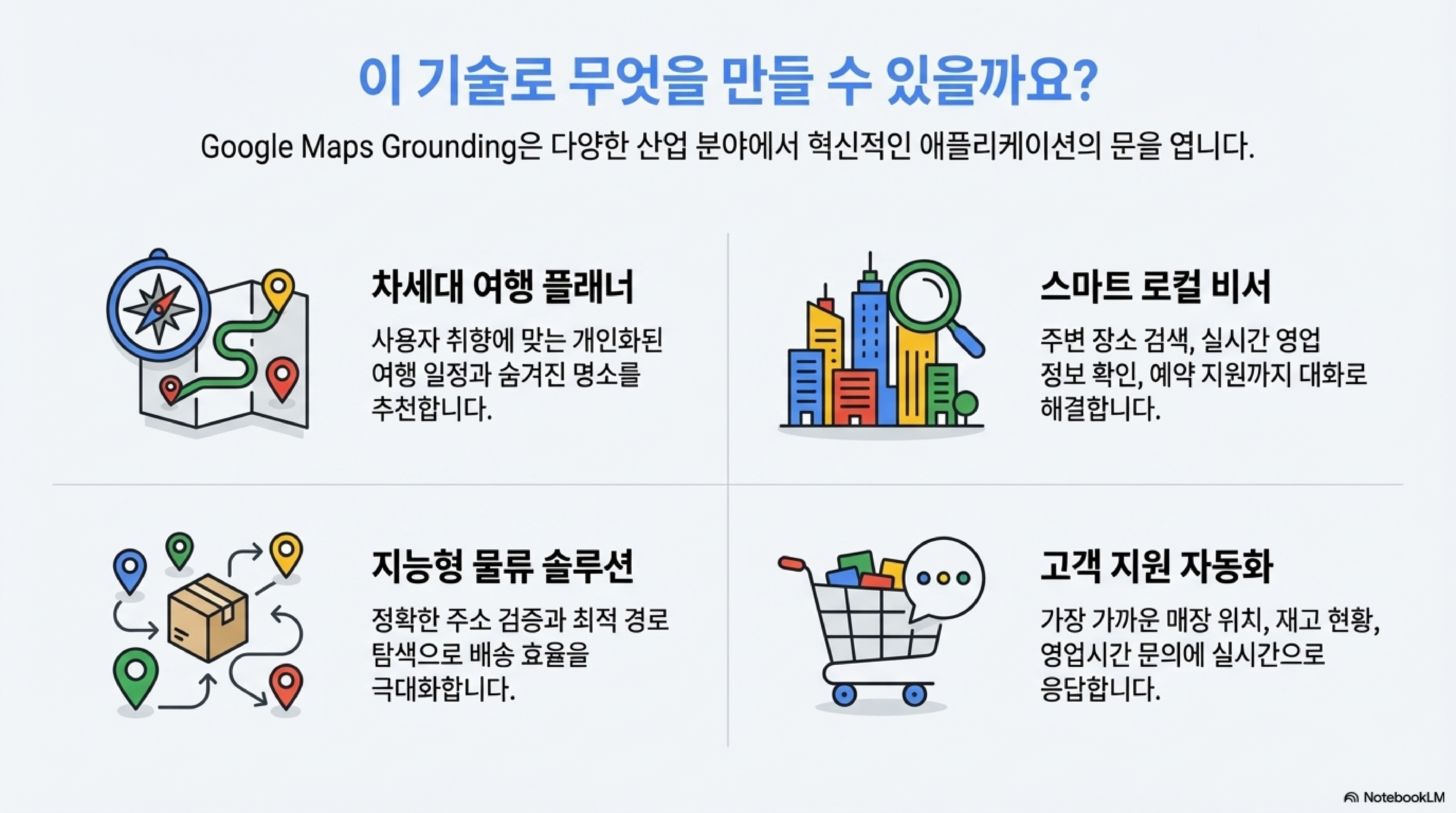 Gemini API의 Google Maps Grounding 기능의 핵심은 단순히 장소 정보를 검색하는 API를 제공하는 데 그치지 않는다는 점입니다. 이 기능은 여러분(개발자)이 방대한 위치 데이터를 기반으로 완전히 새롭고 '흥미로운 애플리케이션'을 직접 구축할 수 있도록 설계되었습니다.