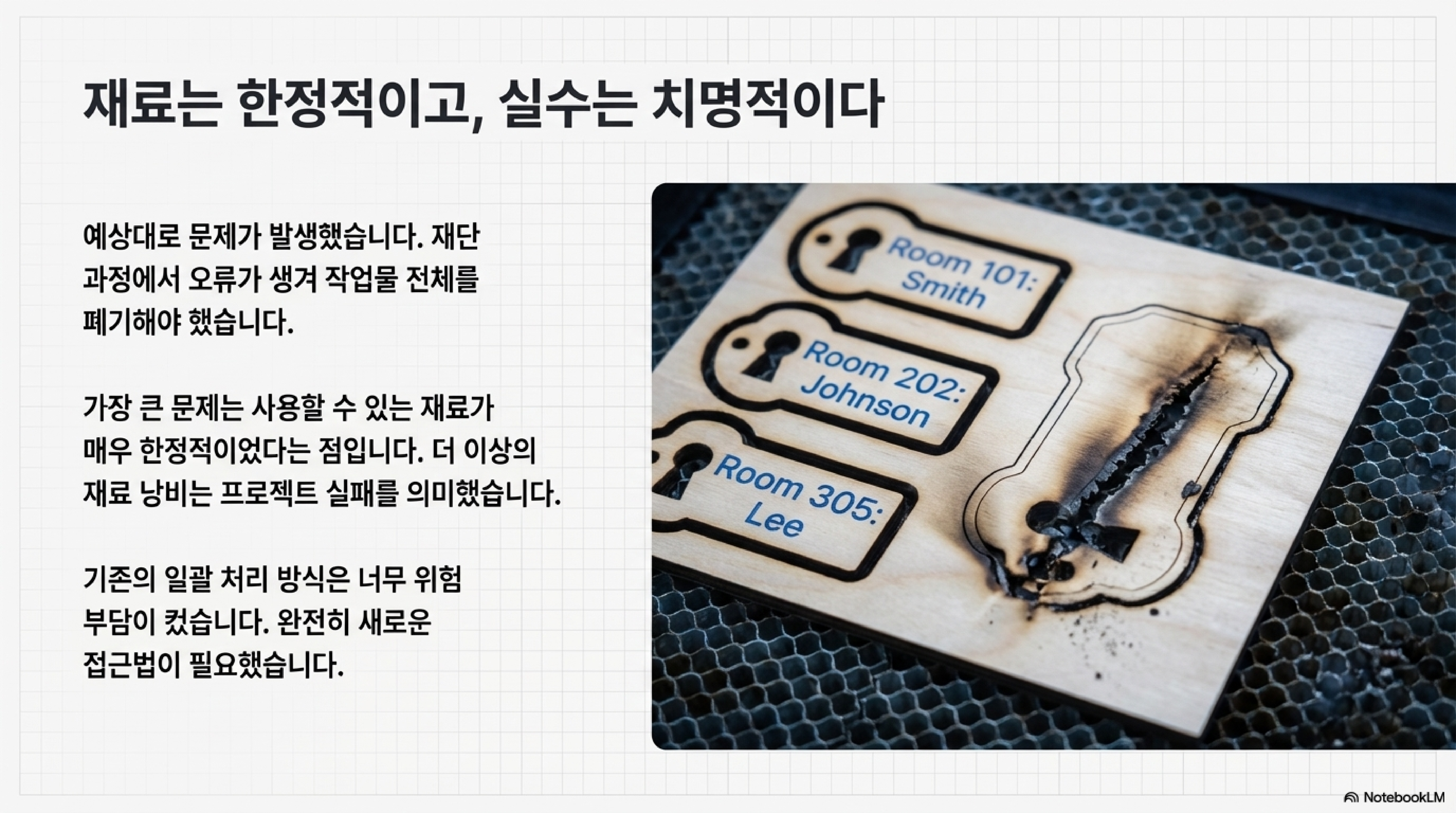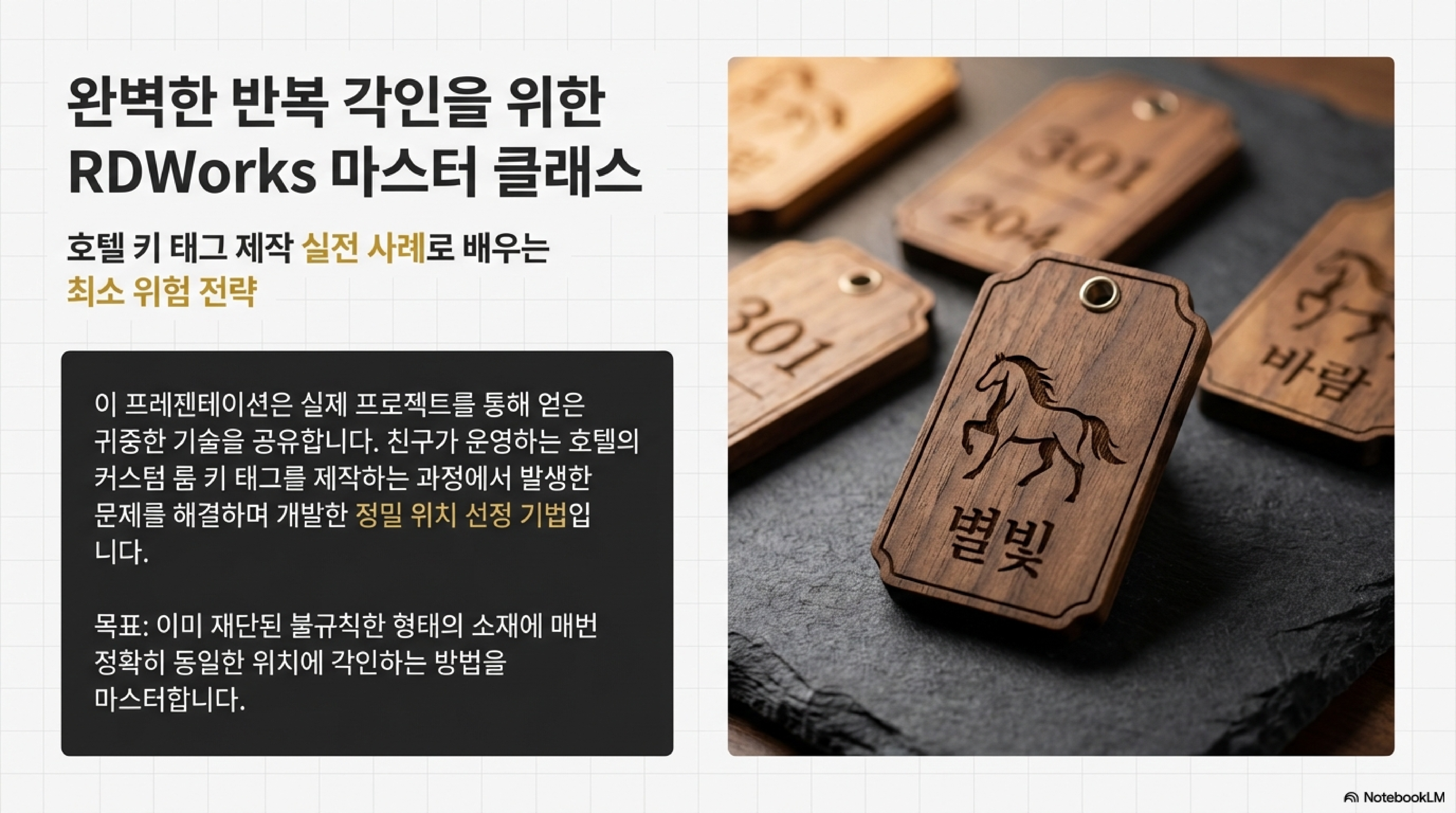 호텔 방 열쇠고리처럼 모양은 똑같지만 내용은 모두 다른 여러 개의 물건에 완벽하게 각인 작업을 해보신 적이 있나요? 그렇다면 작업물이 조금이라도 틀어지거나 실패해서 비싼 재료와 시간을 낭비할까 봐 노심초사했던 경험이 있으실 겁니다. 특히 한 묶음의 작업 중 단 하나만 잘못되어도 전체를 망칠 수 있다는 압박감은 상당합니다. 이 글에서는 바로 이런 까다로운 반복 각인 문제를 해결하기 위해 고안된 '최소 위험 전략'과 영리한 디지털 및 물리적 기법들을 공유하고자 합니다.