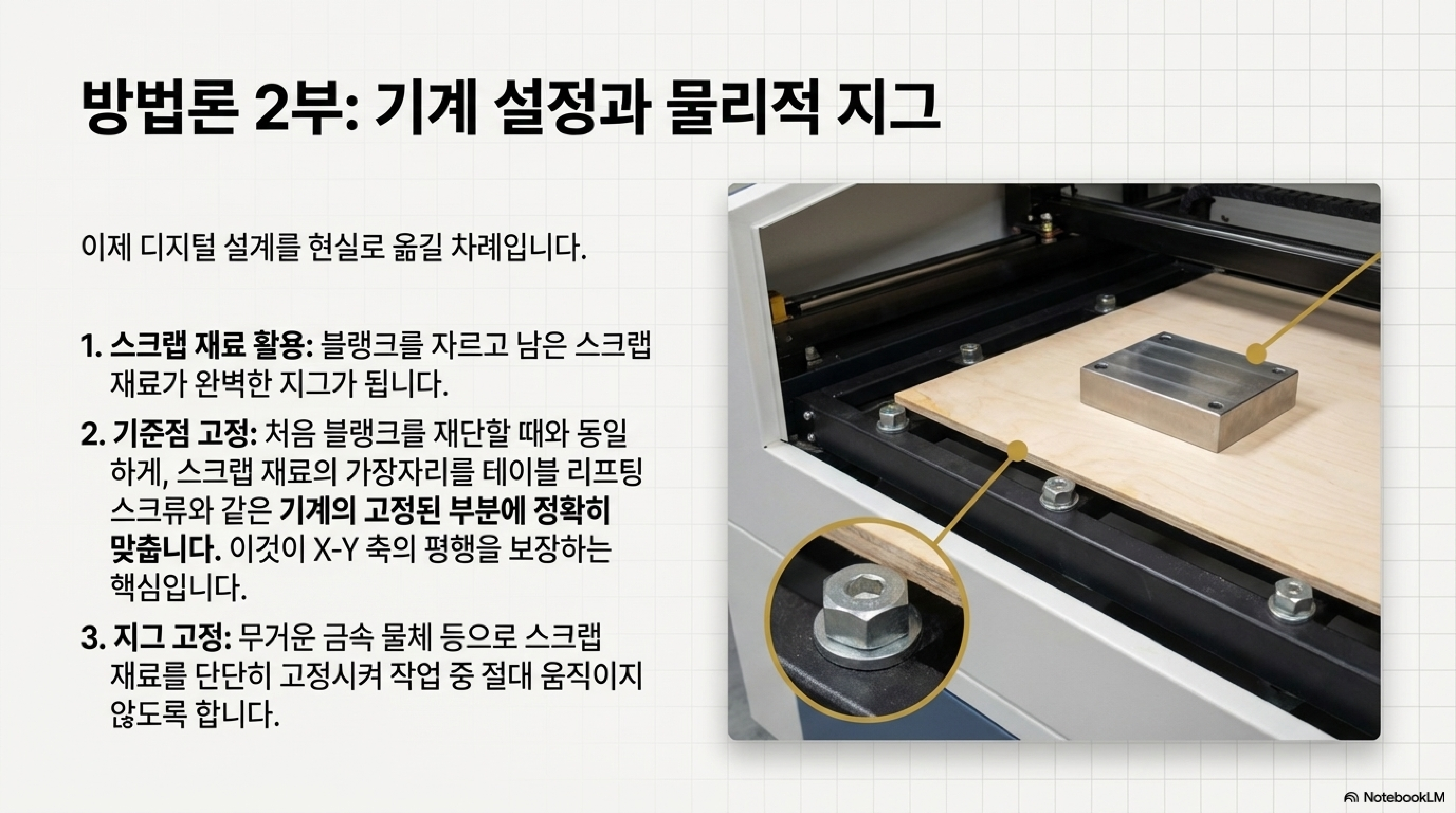 이 문제 해결의 핵심은 두 부분으로 구성된 지그(Jig, 보조 도구) 시스템에 있습니다. 이 시스템은 소프트웨어에서 설정하는 '디지털 지그'와 실제 재료로 만드는 '물리적 지그', 두 부분으로 이루어집니다. 먼저 디지털 지그의 원리부터 살펴보겠습니다.
