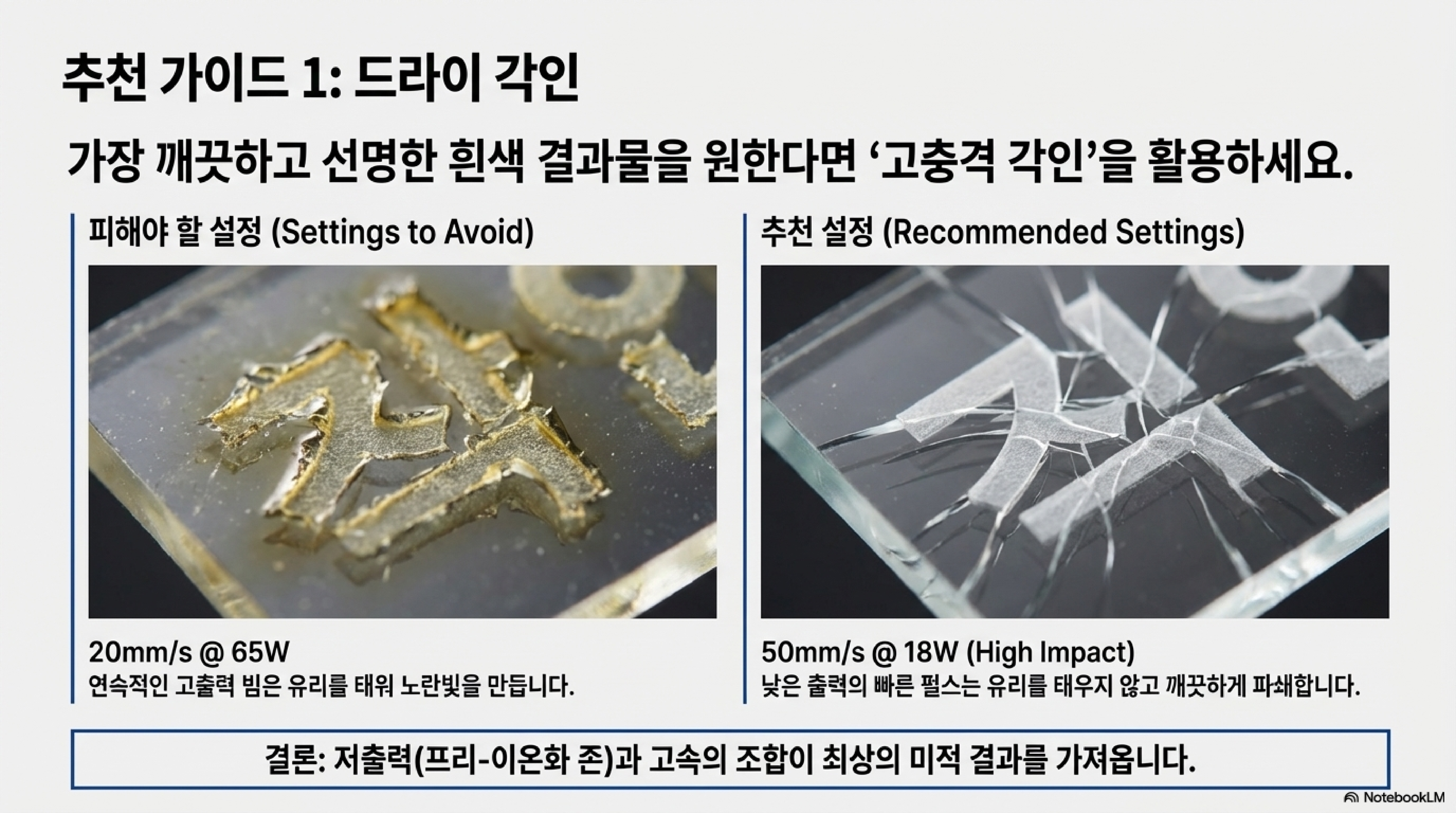 단순히 출력을 높이는 것이 능사가 아니라는 점이 이번 실험의 가장 중요한 발견 중 하나였습니다. 에너지를 유리에 어떻게 전달하는지가 결과물의 품질을 결정하는 핵심 요소였습니다.