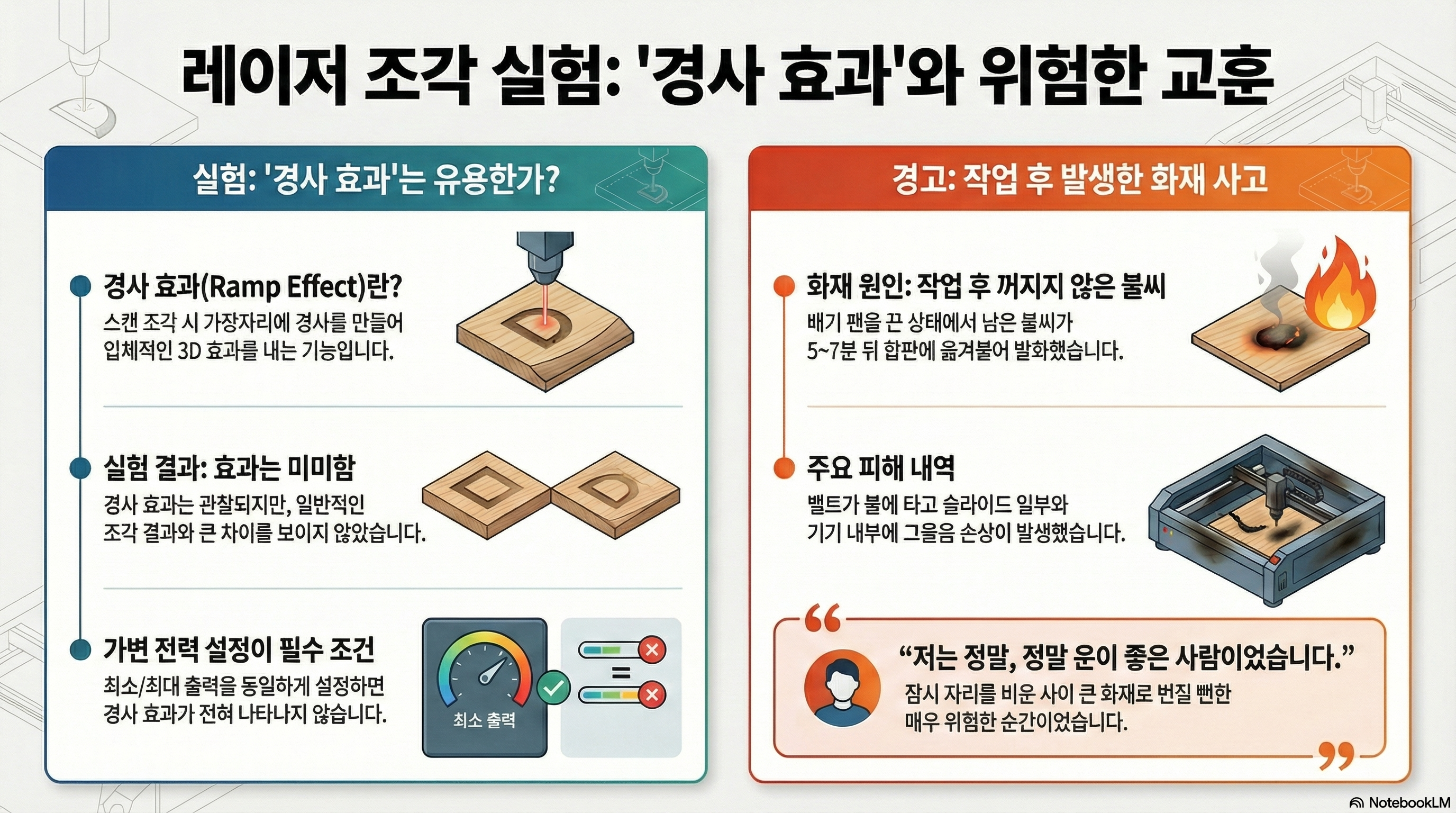 이 사건은 제게 잊을 수 없는 안전 교훈을 남겼습니다. 특히 집진 장치를 끈 상태에서는 절대 레이저 절단기에서 눈을 떼지 말아야 한다는 것입니다. 작업이 끝난 후에도 재료 속에 남은 작은 불씨가 언제든 큰 화재로 이어질 수 있습니다.