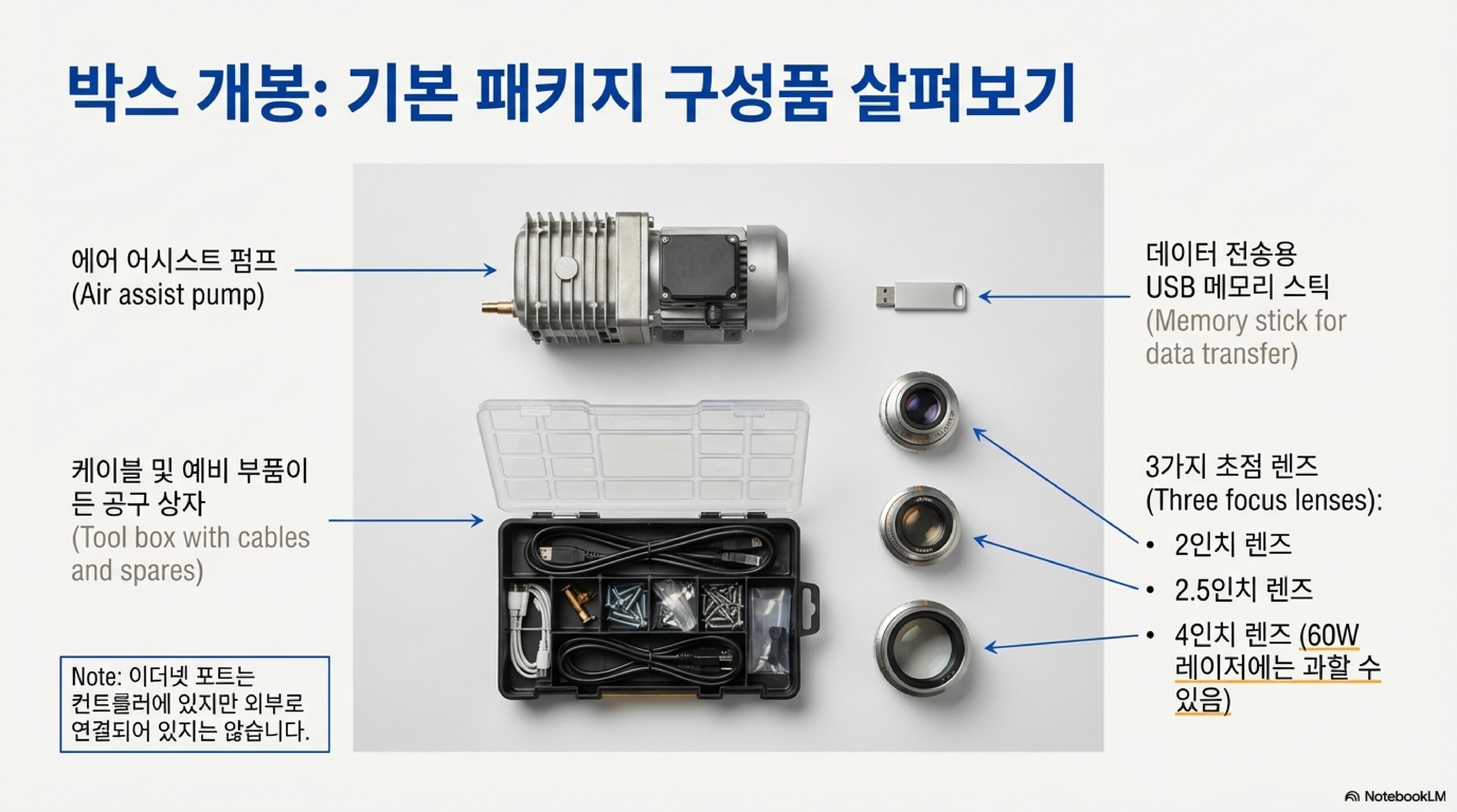 - 세심한 배려: 포괄적인 렌즈 청소 키트와 레이저 반사를 흡수하는 양극 산화 처리된 알루미늄 슬랫 테이블 같은 사려 깊은 구성품이 포함되어 있습니다.