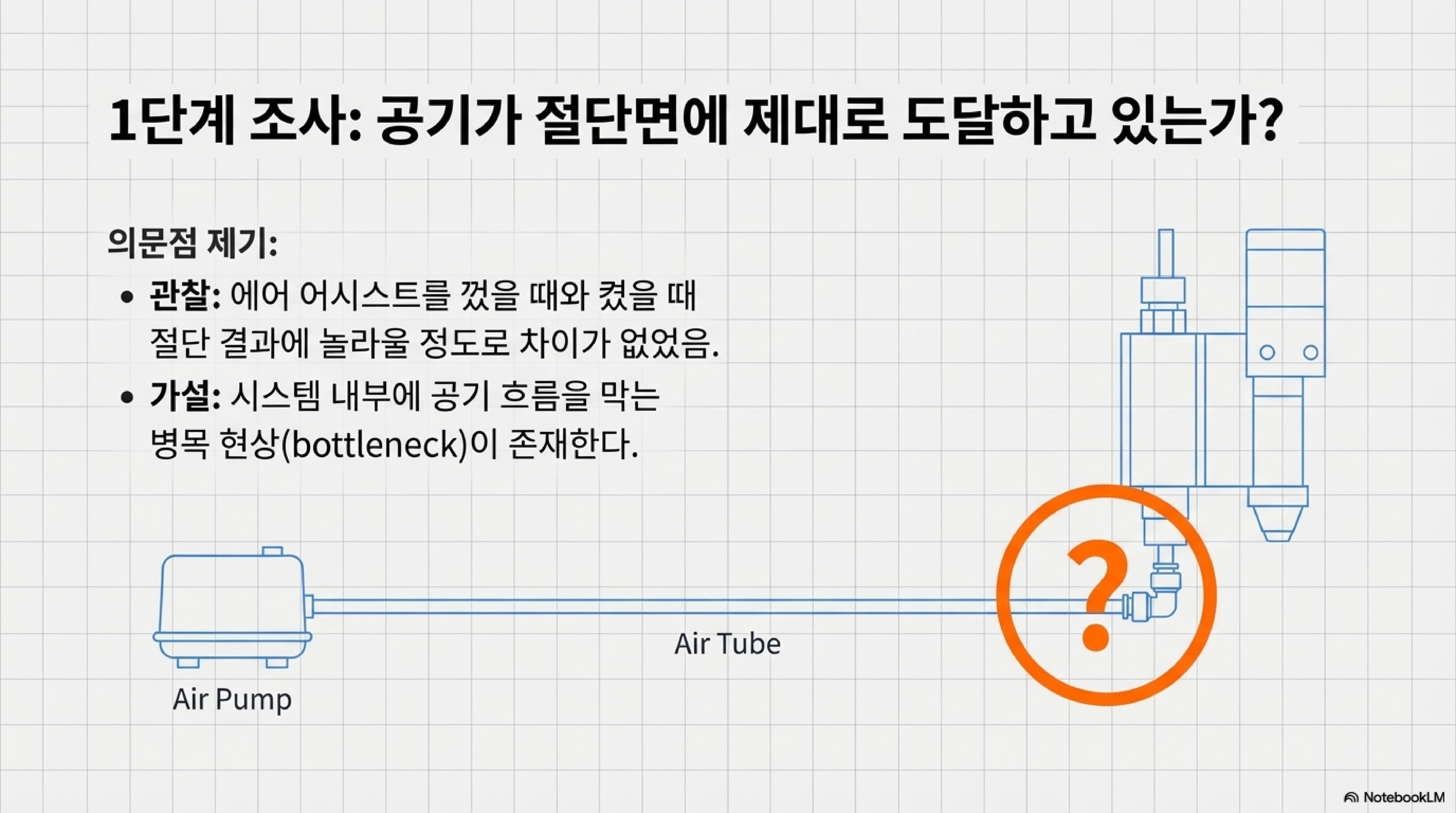 첫 실험부터 저는 미궁에 빠졌습니다. 에어 어시스트를 최대로 켰을 때와 거의 껐을 때의 커팅 속도가 10mm/s로 동일했기 때문입니다. 70L/min 용량의 펌프가 제 역할을 전혀 못 하고 있다는 뜻이었죠. 범인을 찾기 위해 펌프에서 노즐까지 이어지는 에어 라인 전체를 탐정처럼 샅샅이 뒤지기 시작했습니다. 그리고 마침내 결정적인 단서를 발견했습니다.