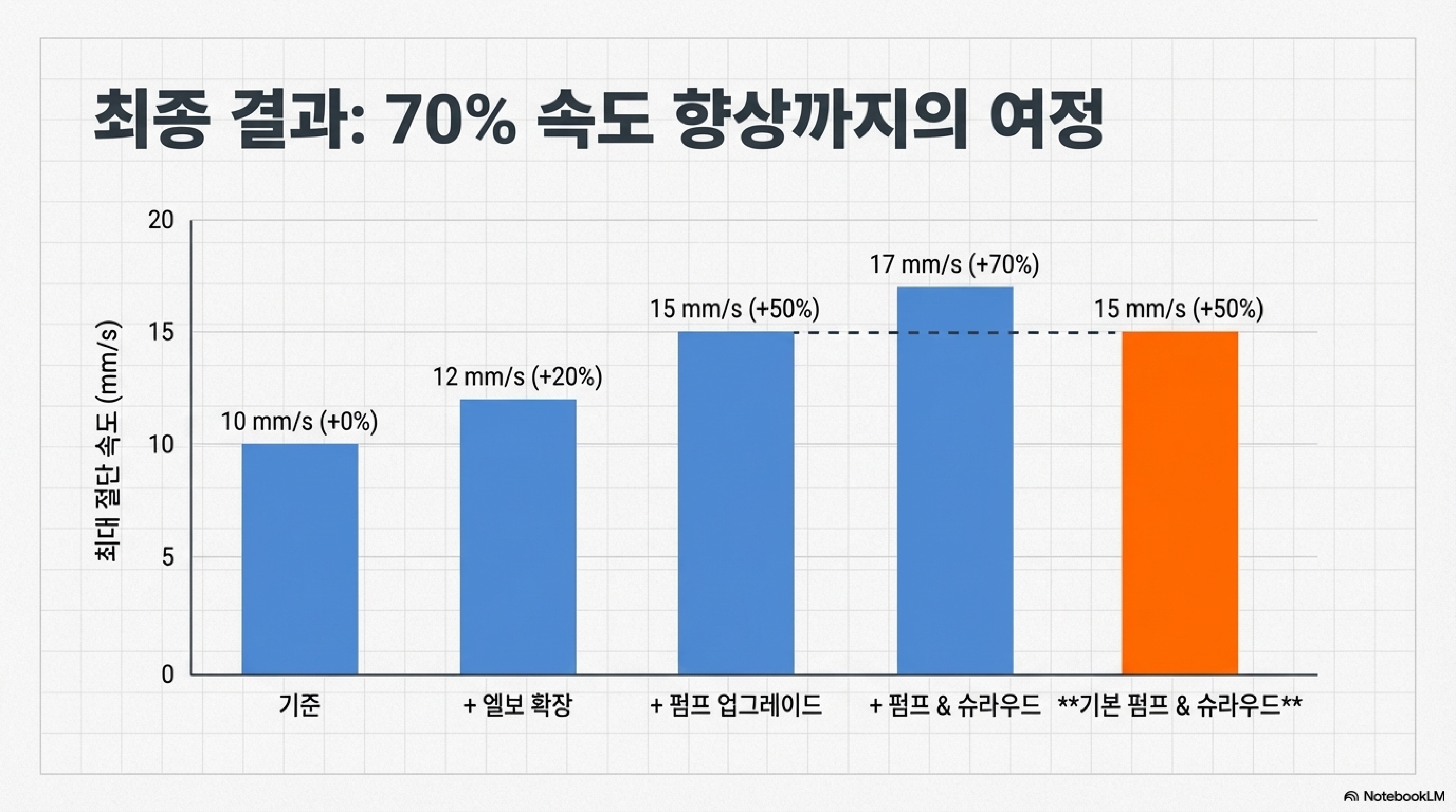 - 3단계: 펌프 업그레이드 (Pump Upgraded): 17 mm/s (초기 대비 총 70% 향상)