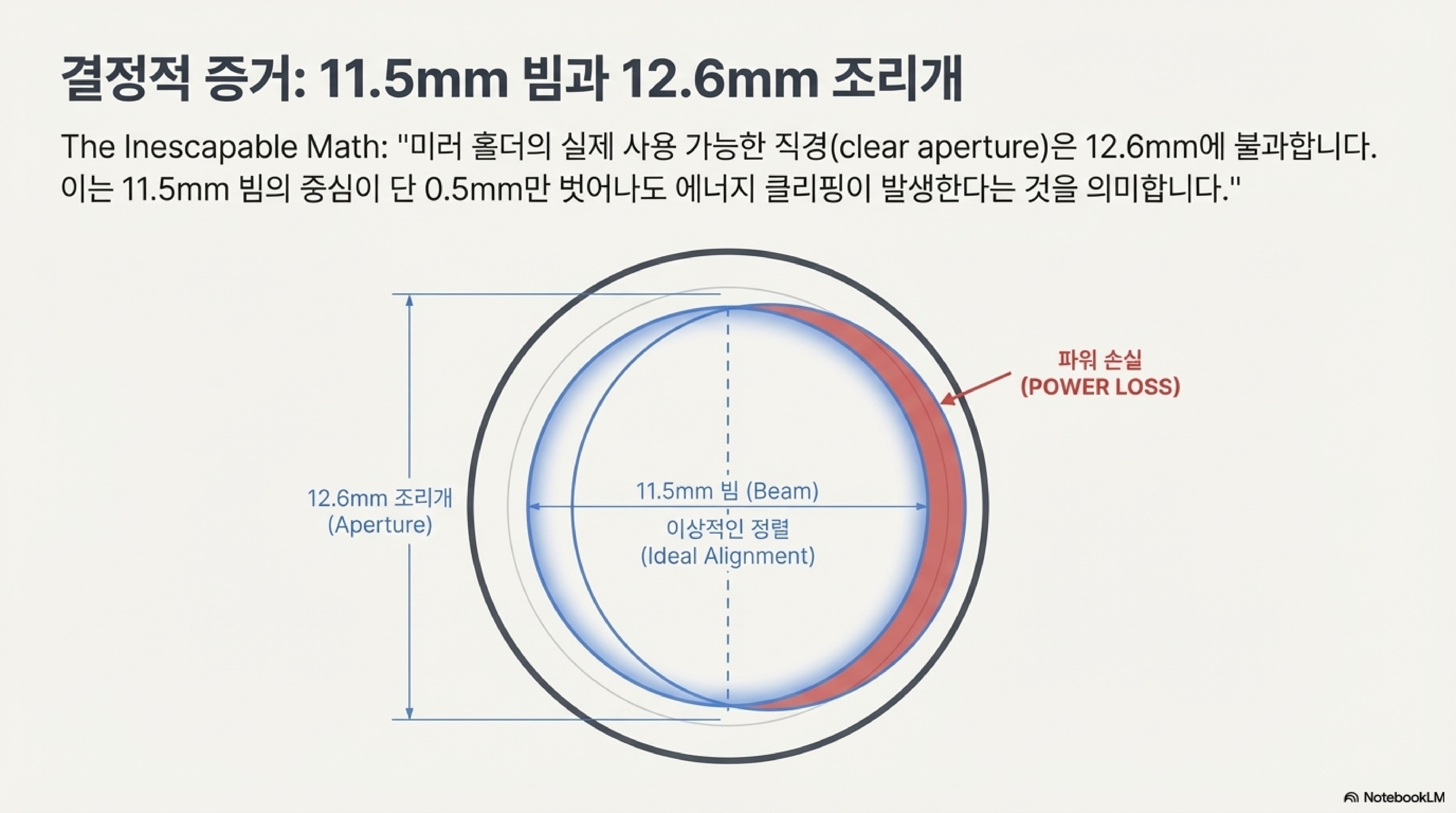 이것이 바로 '빔 클리핑(Beam Clipping)' 현상입니다. 빔의 실제 직경(10-11mm)이 예상보다 훨씬 컸기 때문에, 빔의 가장자리가 미러 홀더의 내경(12.6mm)에 부딪히고 있었습니다. 이로 인해 빔의 바깥쪽 링에 해당하는 출력이 '잘려나가' 작업물에 도달하지 못하고 그대로 손실되었던 것입니다.