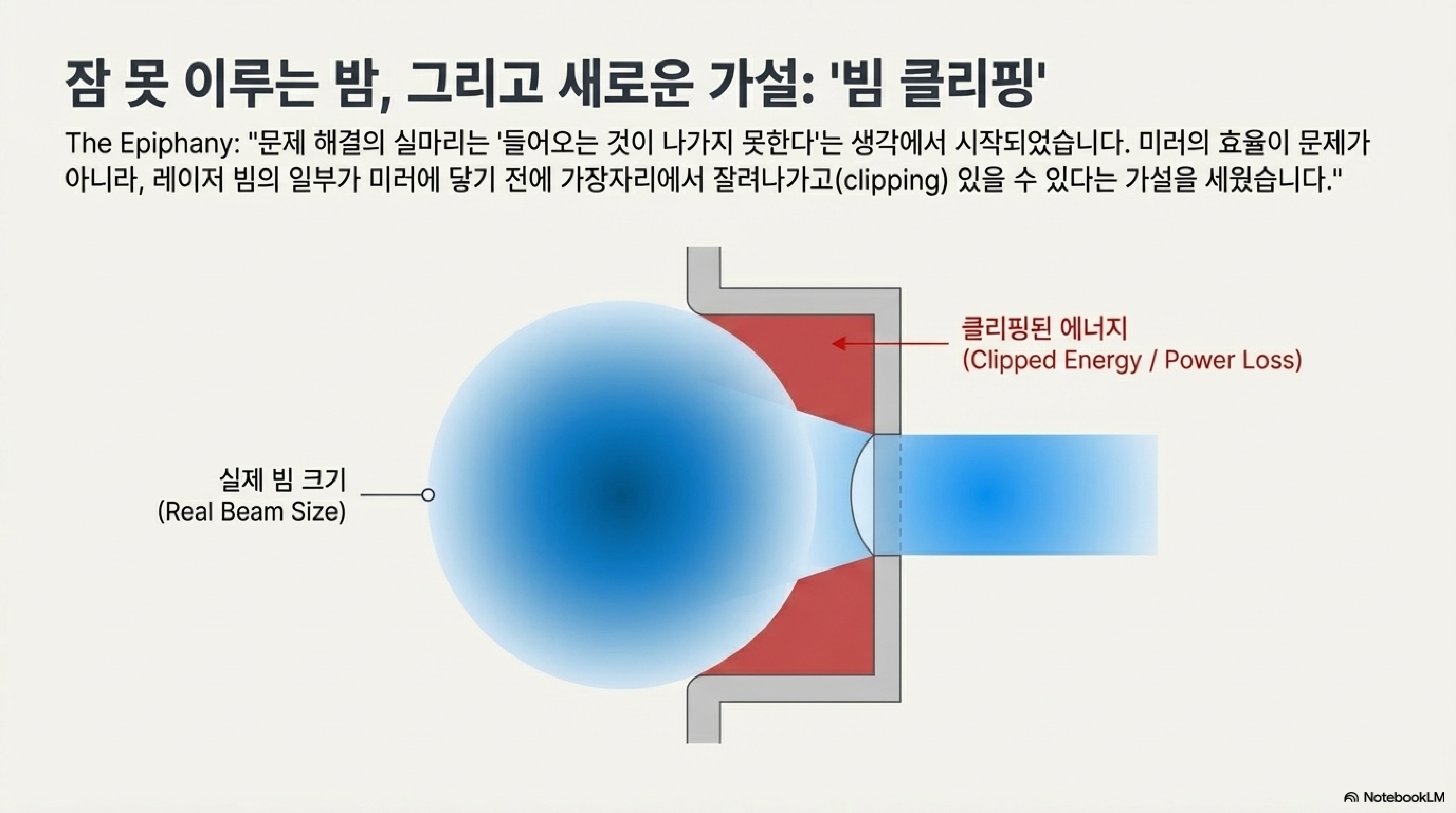 그때 문득 깨달았습니다. 출력이 미러의 낮은 반사율 때문에 손실되는 것이 아니라, 빔이 미러에 완전히 반사되기도 전에 물리적으로 '잘려나가고' 있었던 것입니다.