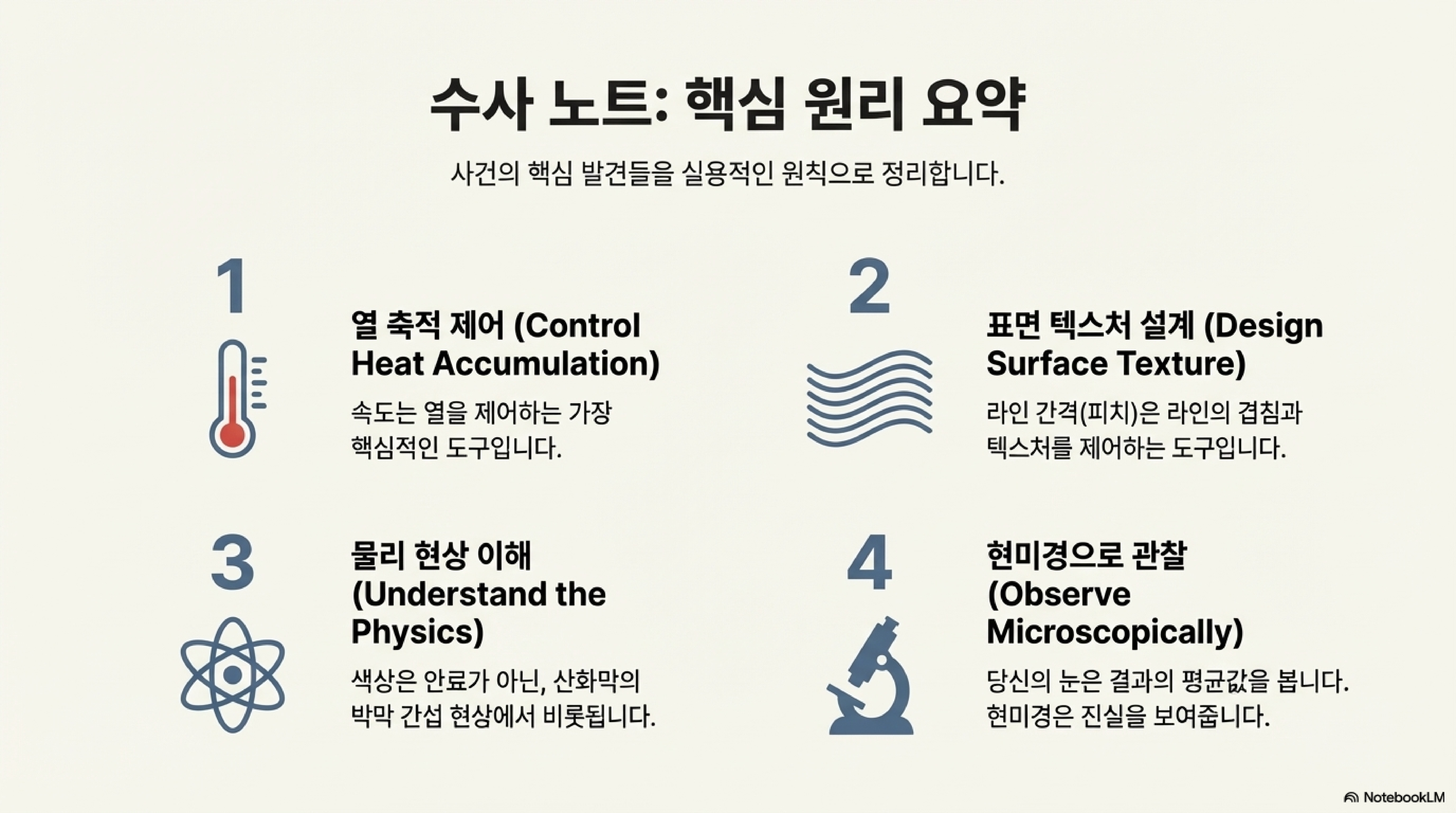 '색상을 만드는 예측 가능한 공식을 찾겠다'는 단순한 목표로 시작된 여정은 우리를 훨씬 더 깊은 곳으로 이끌었습니다. 우리는 단순히 레이저 파라미터를 조정하는 것을 넘어, 열역학, 표면 물리학, 그리고 인간의 시지각이 어떻게 상호작용하여 '색'이라는 현상을 만들어내는지를 이해하게 되었습니다.