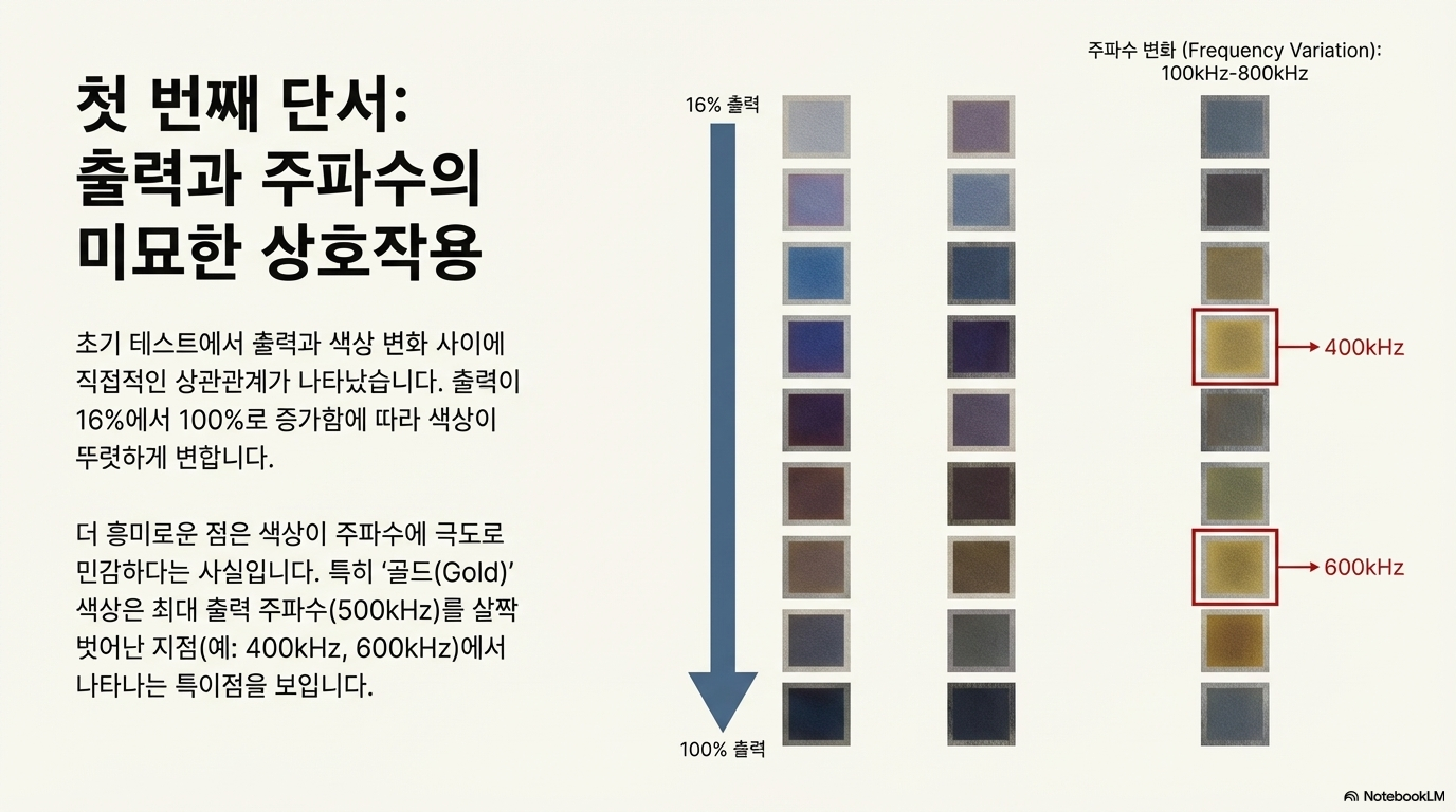 이 가설을 증명하기 위해 저희는 치밀한 실험을 설계했습니다. 레이저 속도를 2배로 높이는 대신 선 간격을 2배로 좁혀 단위 면적당 닿는 펄스 수를 정확히 동일하게 유지했습니다. 논리적으로는 같은 색이 나와야 했지만, 결과는 녹색, 파란색, 적갈색, 노란색 등 완전히 다른 색의 향연이었습니다. 저희의 가설은 눈앞에서 산산조각 났습니다.