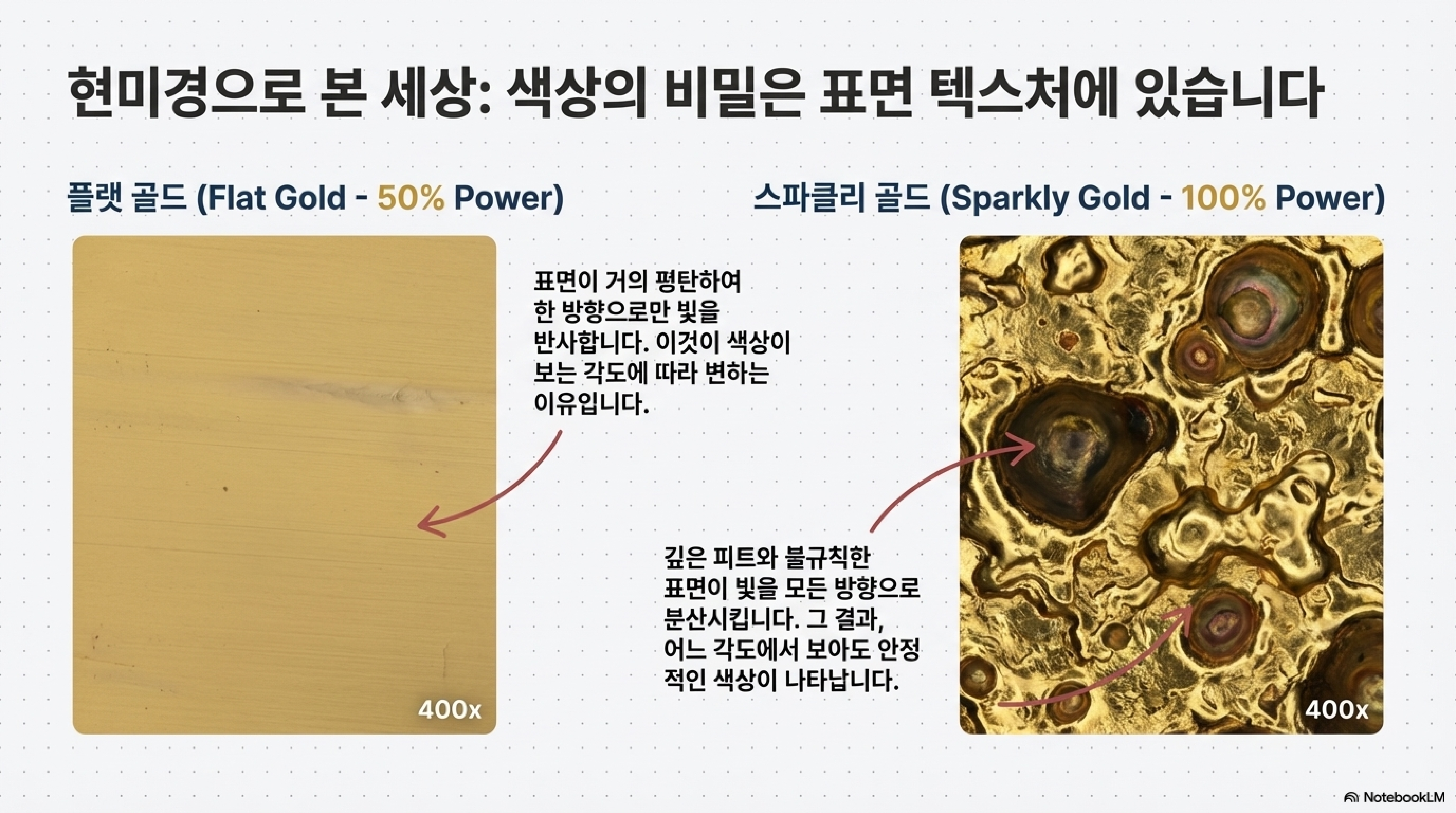 그렇다면 앞서 발견한 '펄스 밀도'는 이 미세 세계에서 어떤 역할을 하는 걸까요? 바로 이 '펄스 밀도'가 현미경으로 본 복잡한 질감을 만들어내는 핵심 제어 장치입니다. 우리가 맨눈으로 '골드'라고 인식하는 색상이 과연 미세 세계에서도 동일할까요? 현미경을 통해 표면을 들여다보자 또 다른 놀라운 진실이 드러났습니다.
