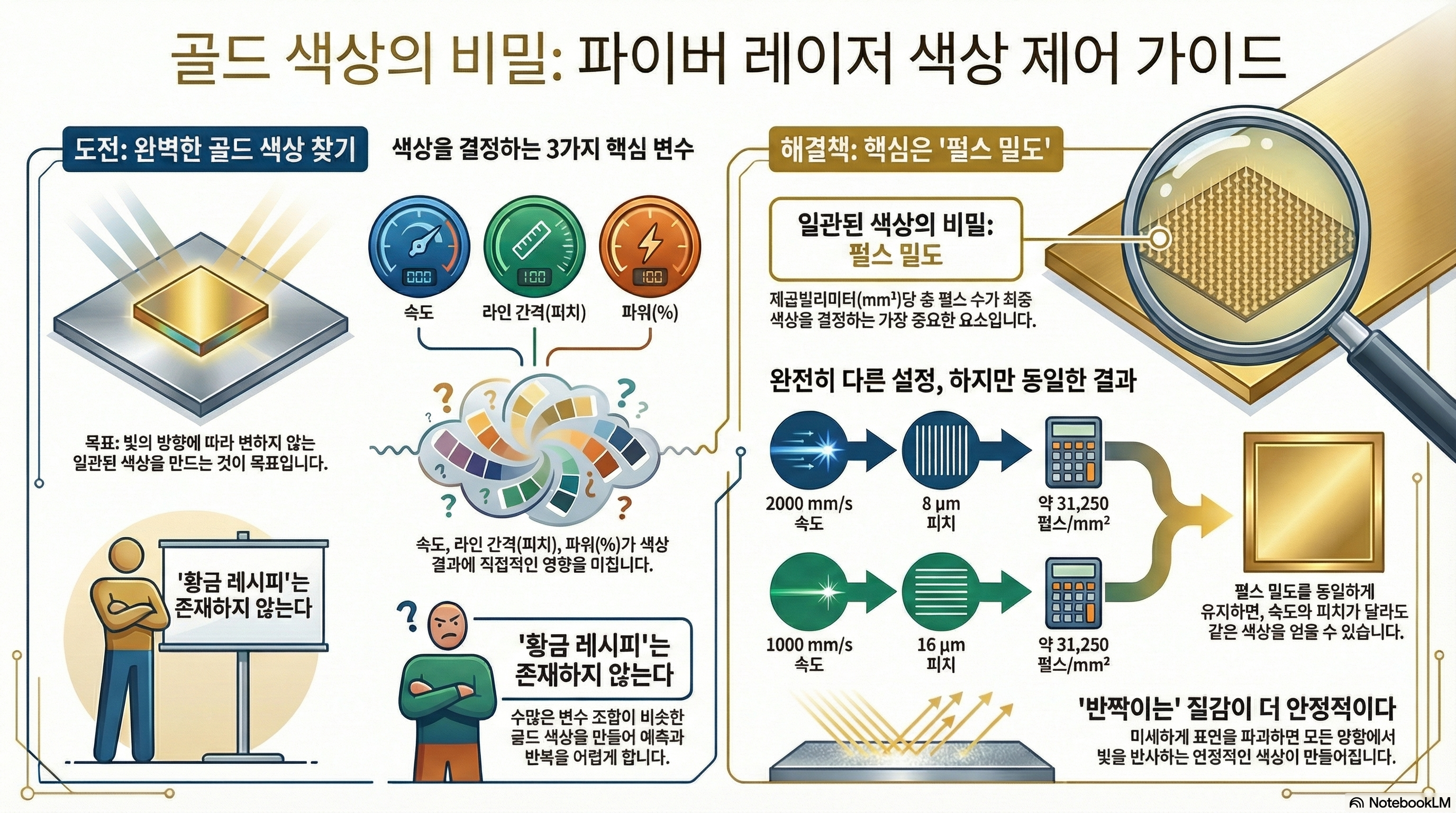 하지만 만약 단 하나의 색, 바로 '골드' 컬러를 완벽하게 구현하는 데에만 집중한다면 어떨까요? 저희는 이 한 가지 색상을 깊이 파고드는 여정을 통해, 레이저로 색을 만드는 원리와 우리가 색을 인식하는 방식에 대한 몇 가지 놀라운 사실들을 발견했습니다. 이 글에서는 그 과정에서 얻은 예상치 못한 통찰 4가지를 공유하고자 합니다.