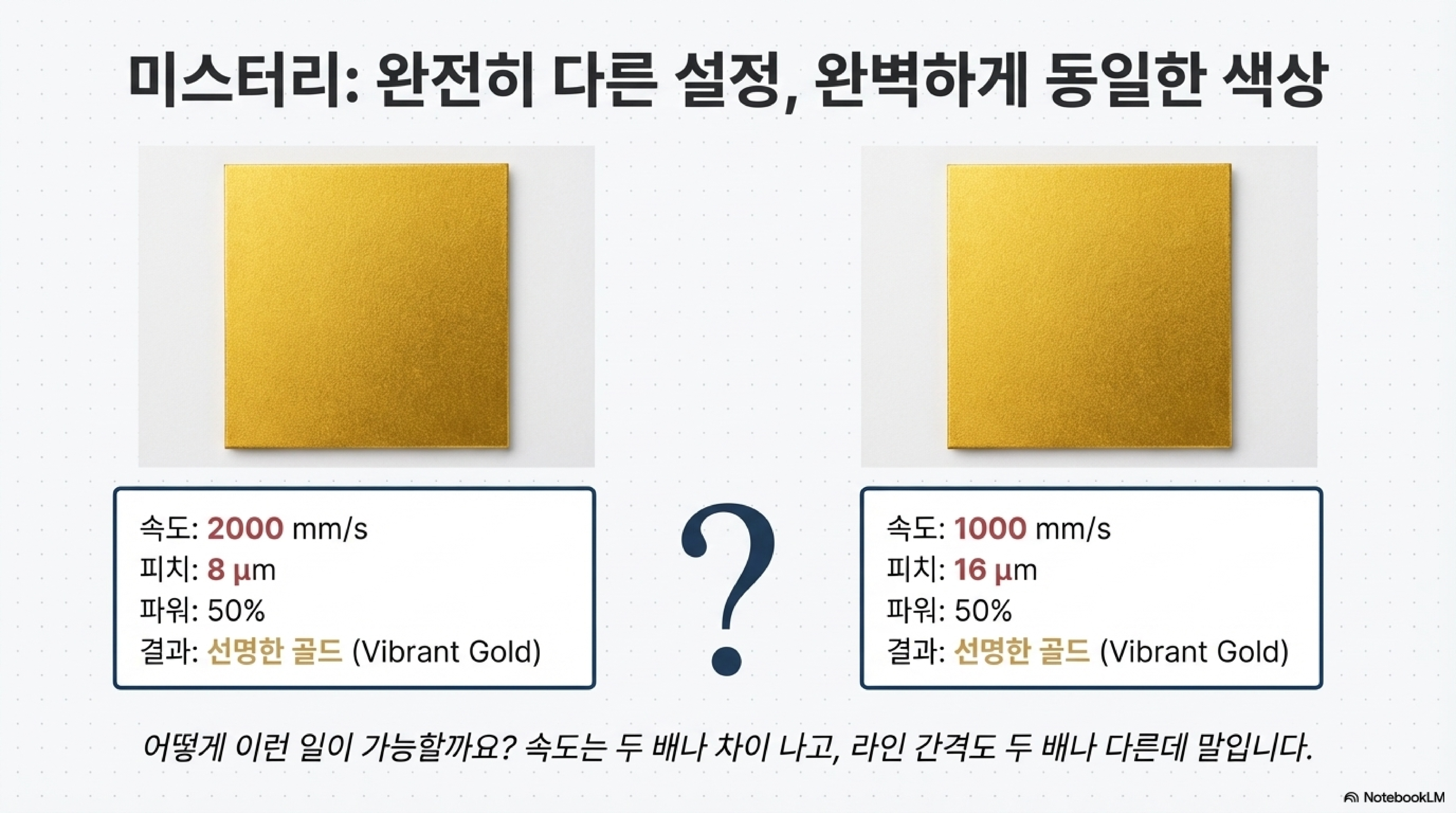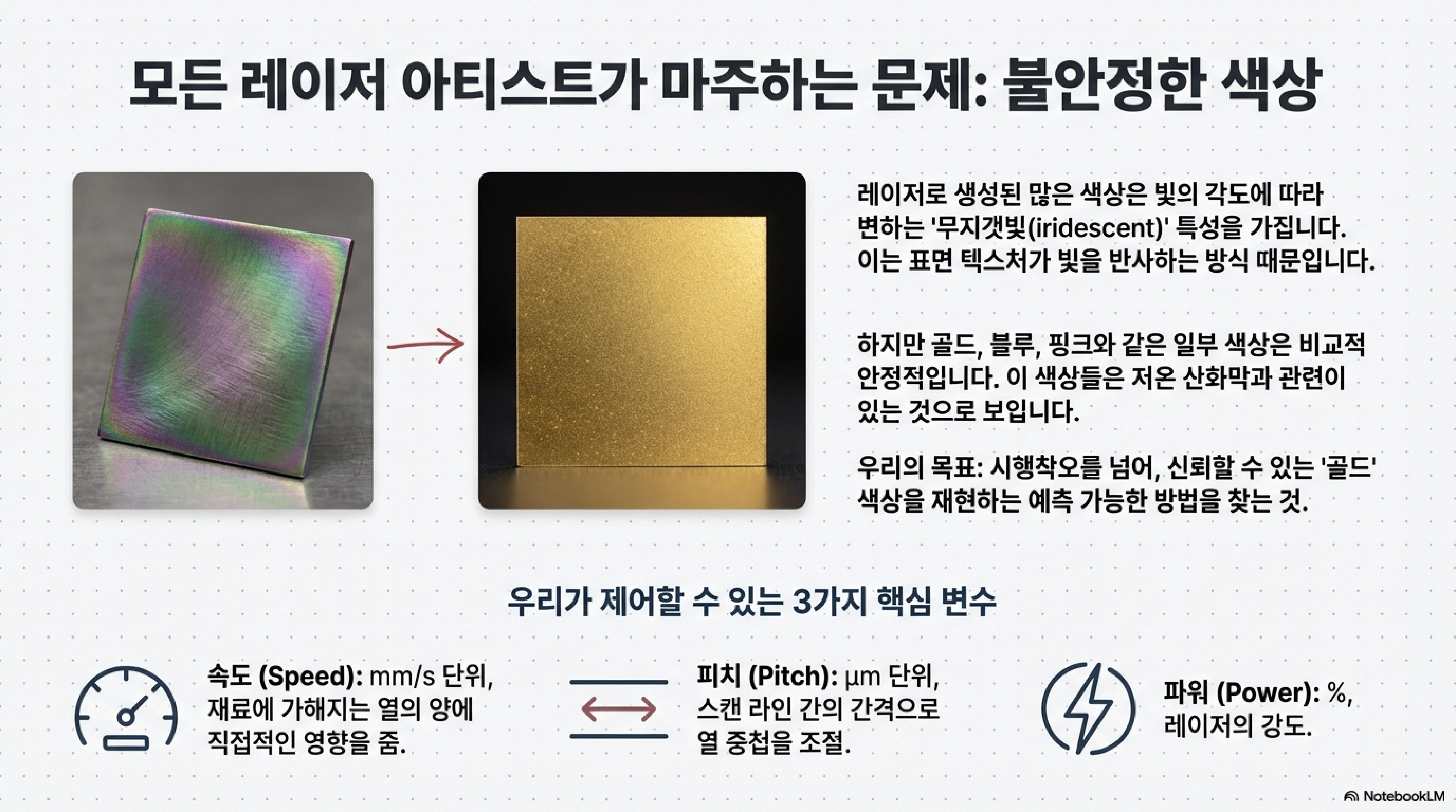 실험에서 우리가 제어할 수 있는 핵심 변수는 세 가지였습니다: 레이저의 이동 속도(speed), 스캔 라인 사이의 간격인 피치(pitch), 그리고 레이저 **파워(power)**입니다. 저희의 목표는 이 세 가지 변수의 수많은 조합을 통해 동일한 골드 컬러를 만들어낼 수 있음을 보여주는 것이었습니다. 이는 '올바른' 설정값이 하나만 있다는 고정관념에 도전하는 것이었습니다.