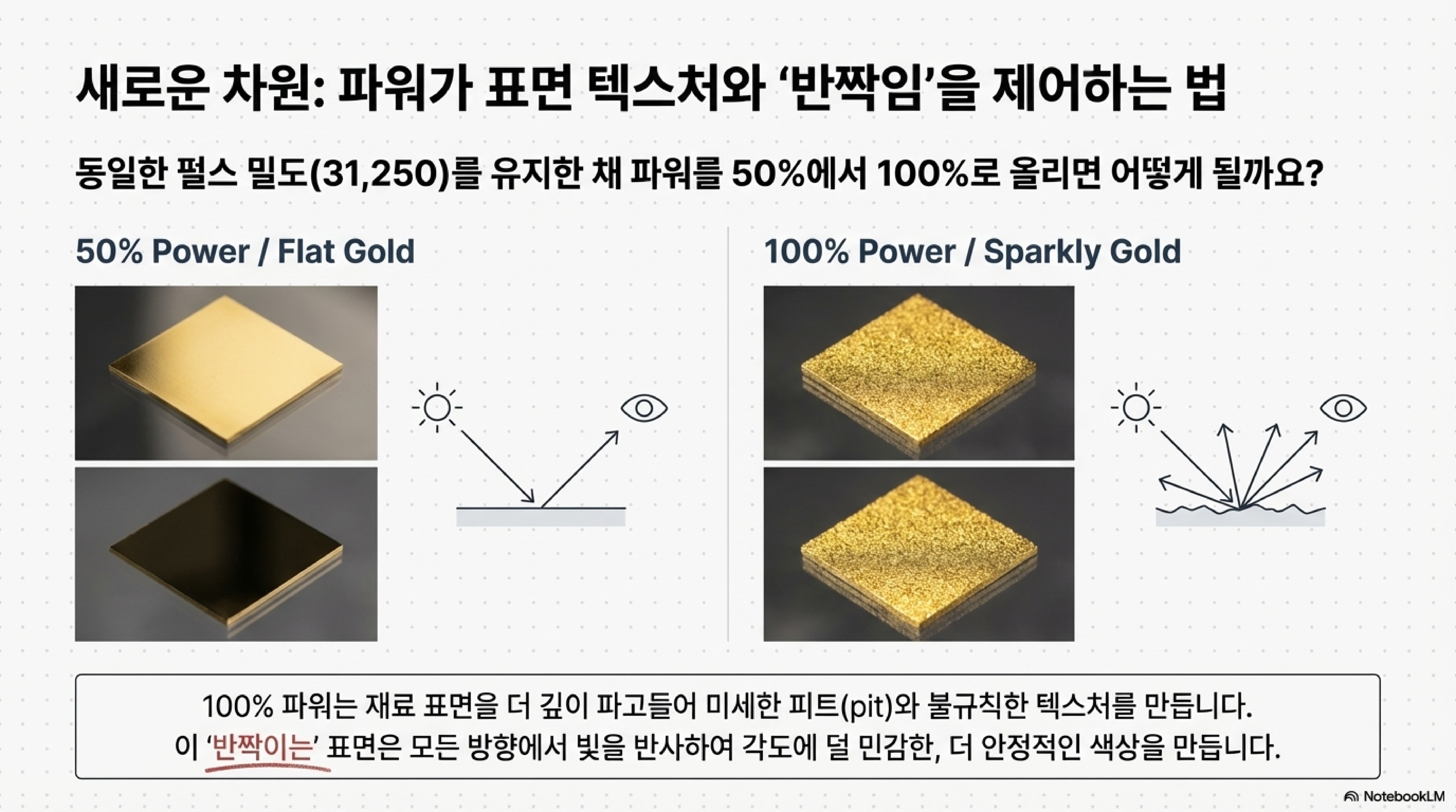 단순히 '골드'라는 한 가지 색을 찾으려던 여정은 우리를 훨씬 더 깊은 곳으로 이끌었습니다. 레이저로 색을 만든다는 것은 결국 에너지 밀도를 정밀하게 제어하여, 우리 눈이 특정 색으로 인식하도록 미세한 표면 질감을 '설계'하는 과정이라는 것을 깨닫게 되었습니다.