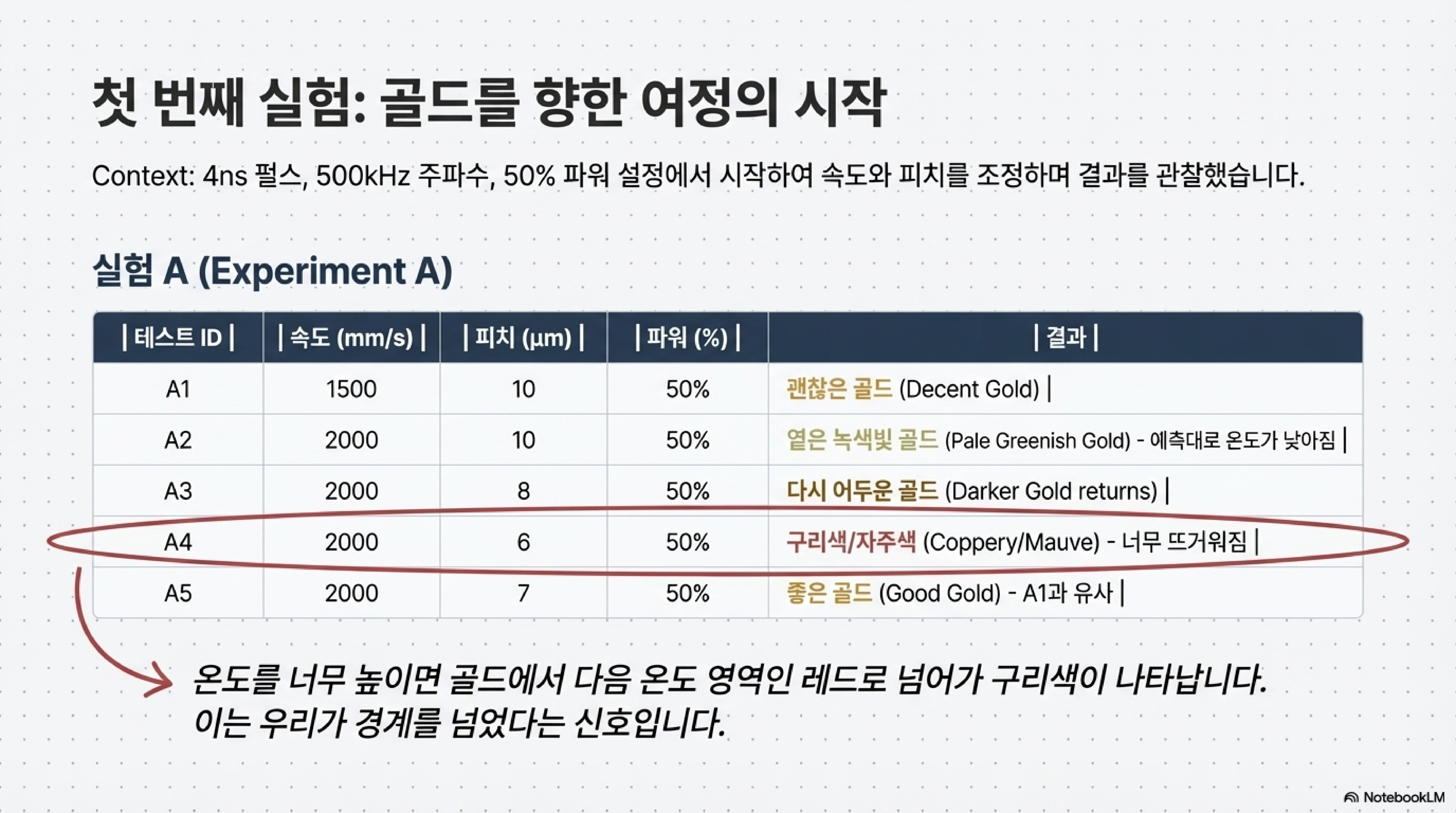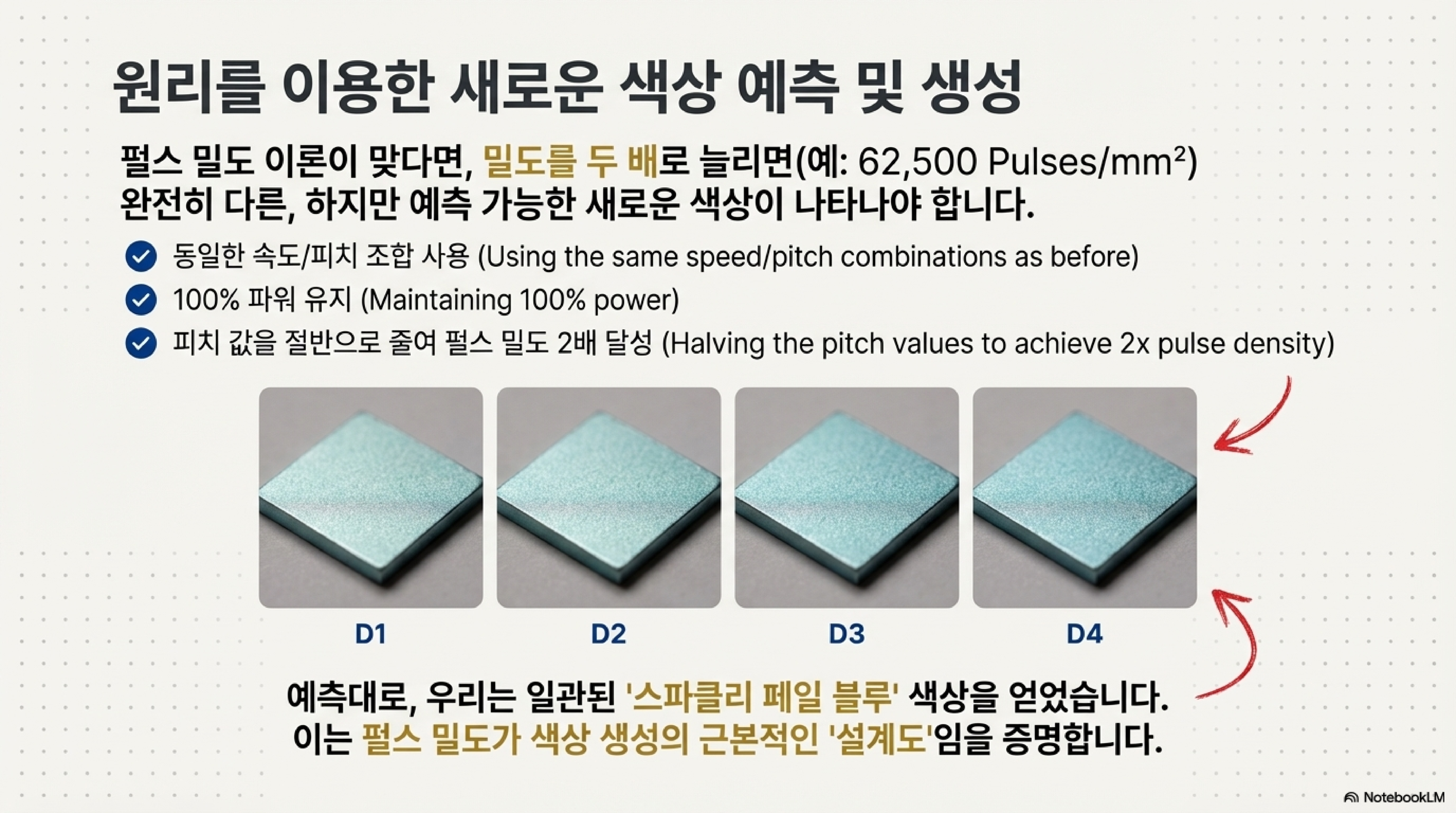 가장 직관에 반하는 사례는, 육안으로는 완벽한 금색이었던 한 샘플을 현미경으로 관찰했을 때 오히려 "파란색이 더 우세하게" 나타난 경우입니다. 이는 우리가 색을 만드는 것이 아니라, 사실은 특정 에너지(펄스 밀도)를 이용해 빛과 상호작용하는 미세한 구조를 '설계'하고 있음을 명확히 보여줍니다.